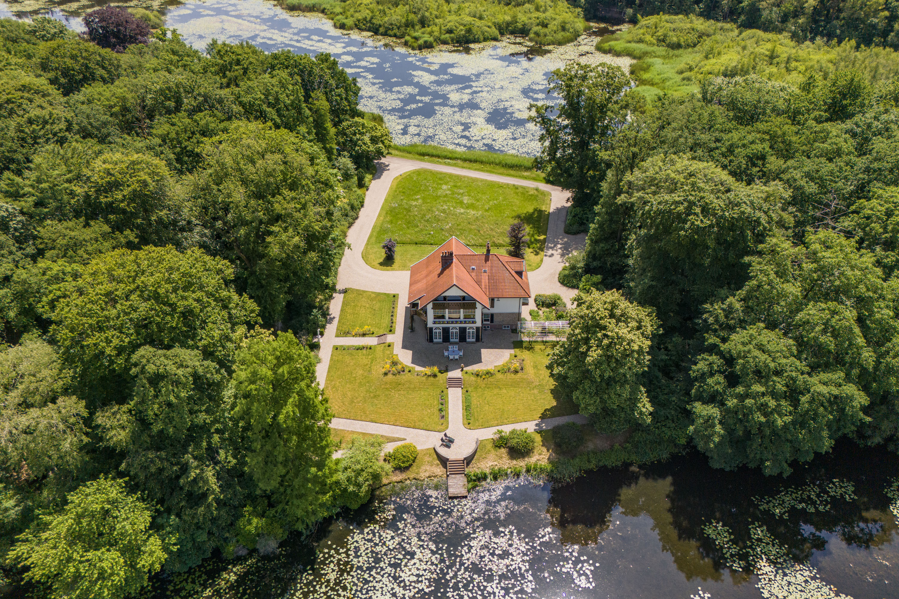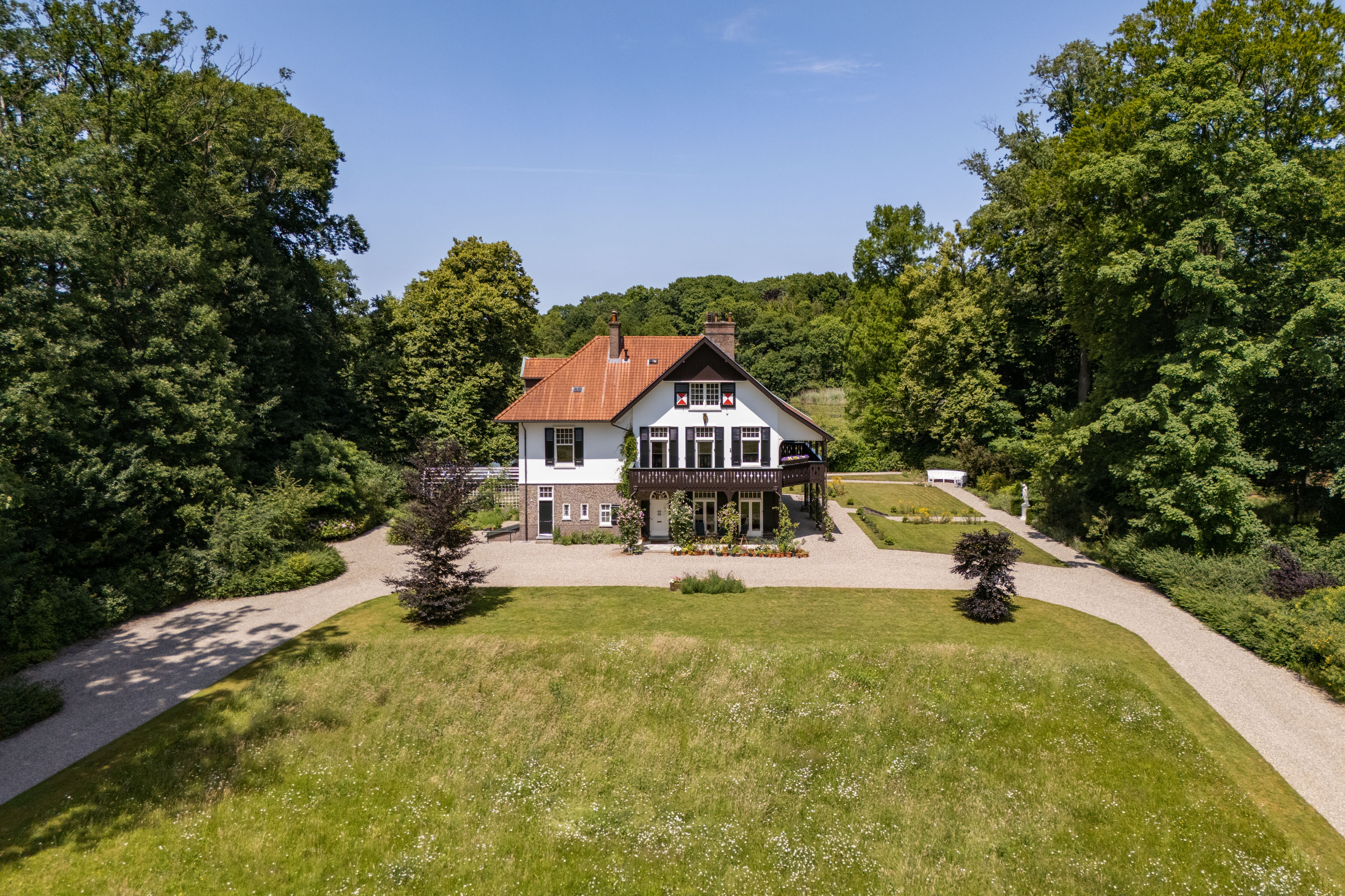 Over the past decade the current owners have made every effort to restore the estate to its former glory. Together with Landschap Overijssel and several renowned partners a restoration plan was carried out for both the garden and the park. Everything was done in line with the intentions of landscape architect L.A. Springer, who designed the estate in the early 1900’s. The two main sightlines from the house to the lakes have been restored as well as several sightlines on both sides of the house, including the so-called maid's lane leading to the nearby farmhouse. The restoration and (re)design of the rose garden, borders, lawns with garden ornaments, ornamental forest edges, decorative shrubbery, park layout with old trees, orchard, and wildflower meadow with historical ornamental plants were completed, complementing the garden and park. It is almost inconceivable how many plants and shrubs have been planted in recent years.
