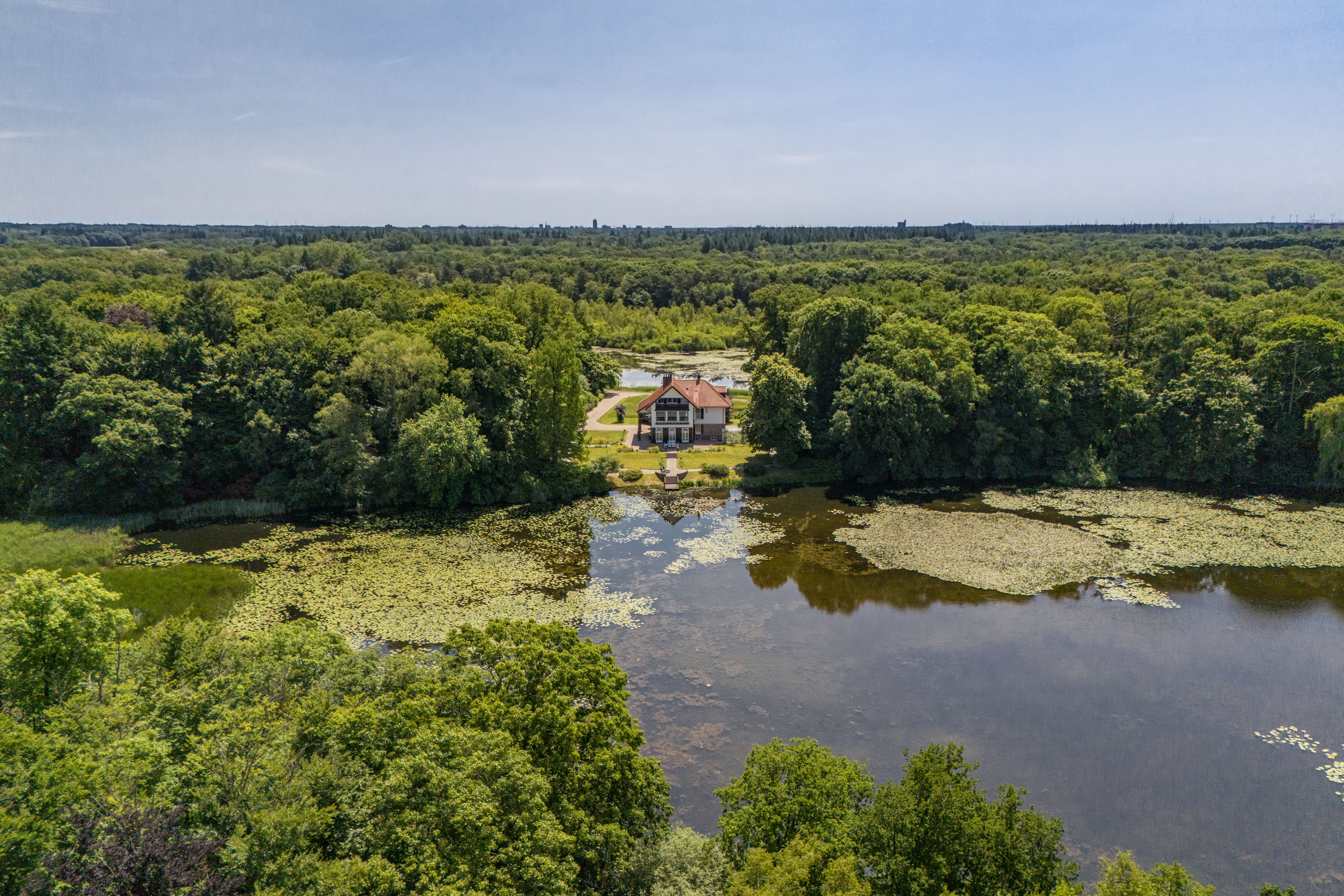 The villa is located where the municipal boundaries of Hengelo, Enschede and Dinkelland meet; one of the most unique and green locations in Twente due to the cluster of various estates and nature reserves. Situated on a strip of land between the two Lonneker lakes (6 and 10 ha) with views over the water, the villa offers endless opportunities for hiking and cycling in the scenic wooded surroundings, as well as ice skating on the lakes in winter, there is always something beautiful to experience here. Despite being surrounded by high-quality nature, the estate is very centrally located. All imaginable amenities including cozy restaurants, theaters, golf courses, a university, colleges, hospitals, extensive shopping centers and public transport are nearby. The estate is adjacent to Hengelo and just a 5-minute drive from Enschede. Thanks to a bicycle overpass, the Hasseleres district can be reached within minutes. Additionally, the A1 motorway entrances and exits are just 3 minutes away, providing excellent connections to the rest of the Netherlands and Germany.