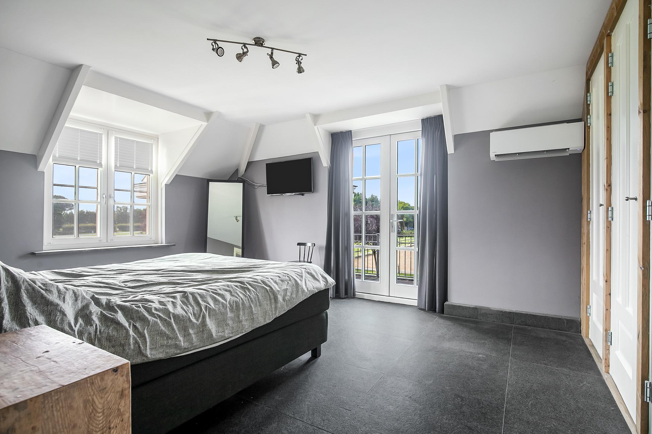 The master bedroom is equipped with a practical closet and air conditioning. French doors provide access to the roof terrace from here. The fully tiled bathroom is equipped with a bathtub, a bathroom unit with 2 nice washbasins and a walk-in shower. The separate toilet room has a floating toilet and a hand basin.