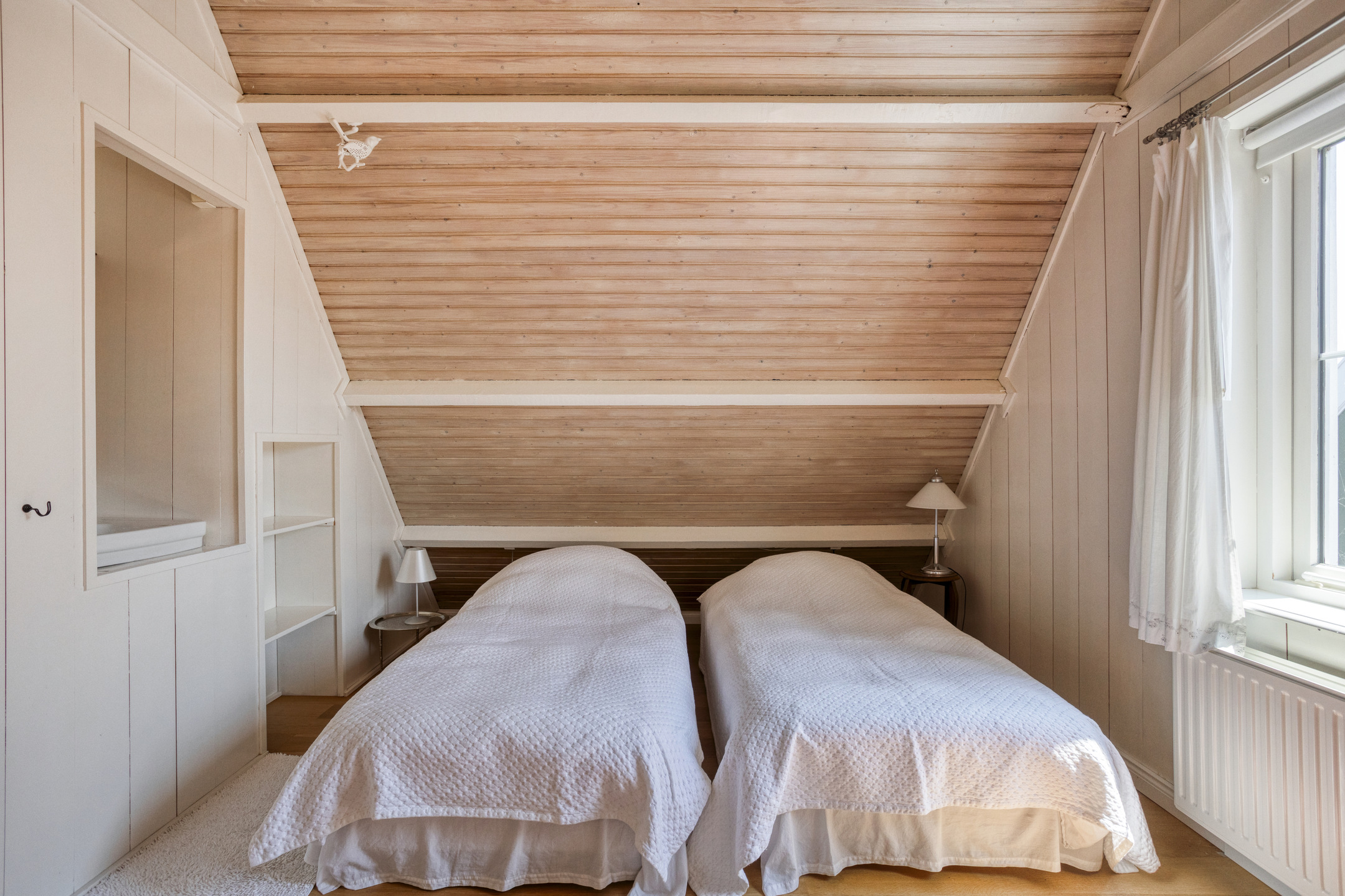 The first floor is divided between the front and rear sections of the house. In the front, you’ll find two spacious bedrooms, each with storage behind the knee walls. In the rear, a wide staircase leads to a charming landing with a built-in box bed—a unique feature sure to appeal to children. From here, you access the spacious master bedroom, which includes built-in wardrobes, a storage loft, and French doors opening onto a large rooftop terrace with panoramic views of the surrounding landscape.