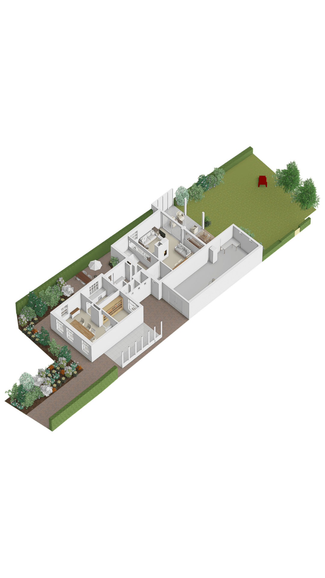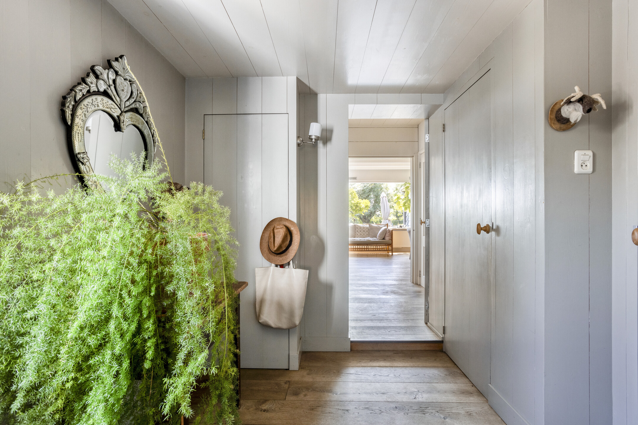 The transition to the rear house is formed by a spacious hallway, which not only functions as a practical connecting space but also features a shower and a toilet with washbasin.