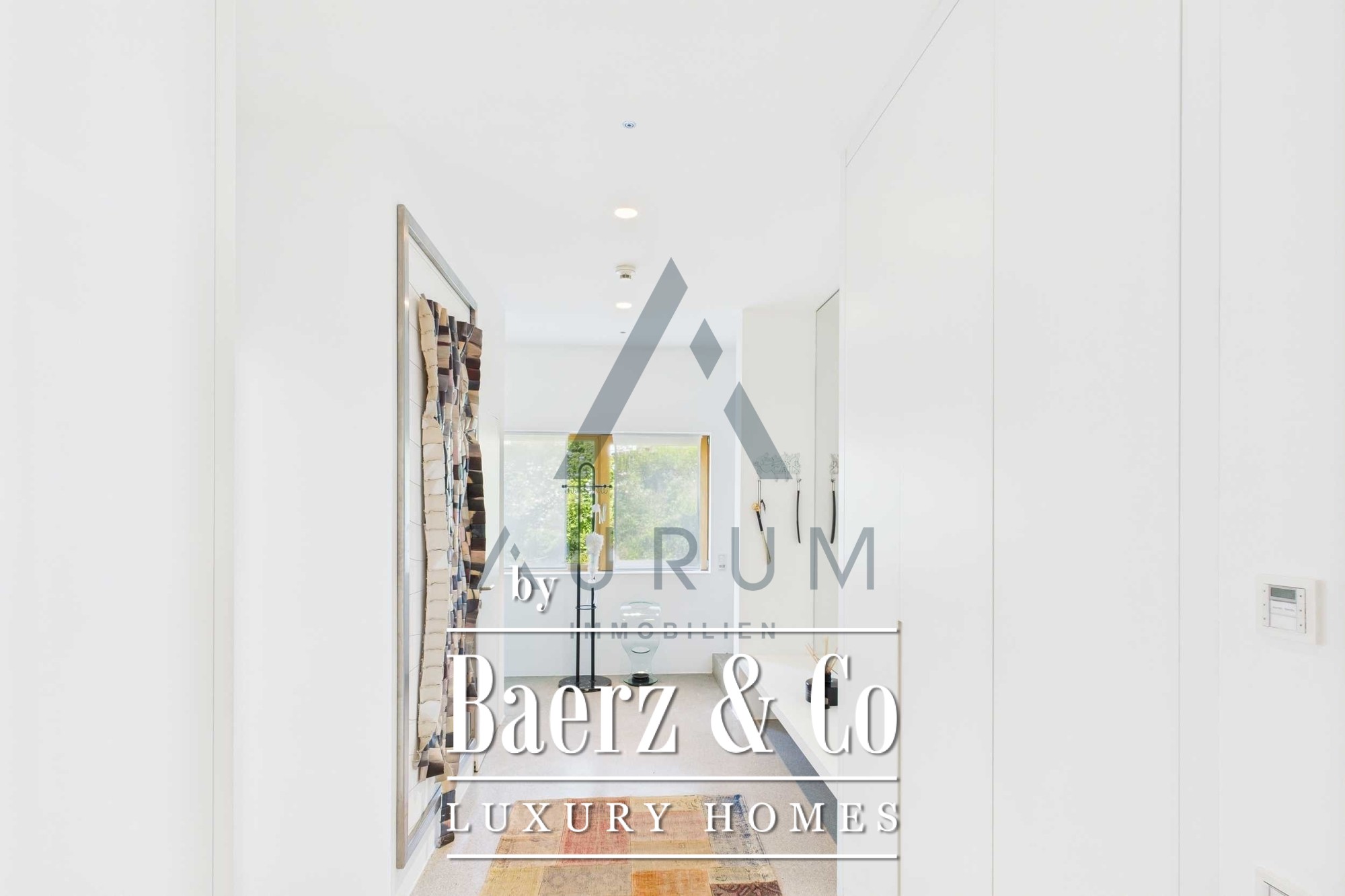 The entire building is very bright and open thanks to generous glass surfaces. All window fronts are equipped with electric Venetian blinds and can be controlled via a central BUS control system. Lighting, shading, heating, and other functions can also be controlled via this system. The furnishings include high-quality materials such as custom-made built-in wardrobes, wood and porcelain stoneware floors, and modern sanitary facilities.