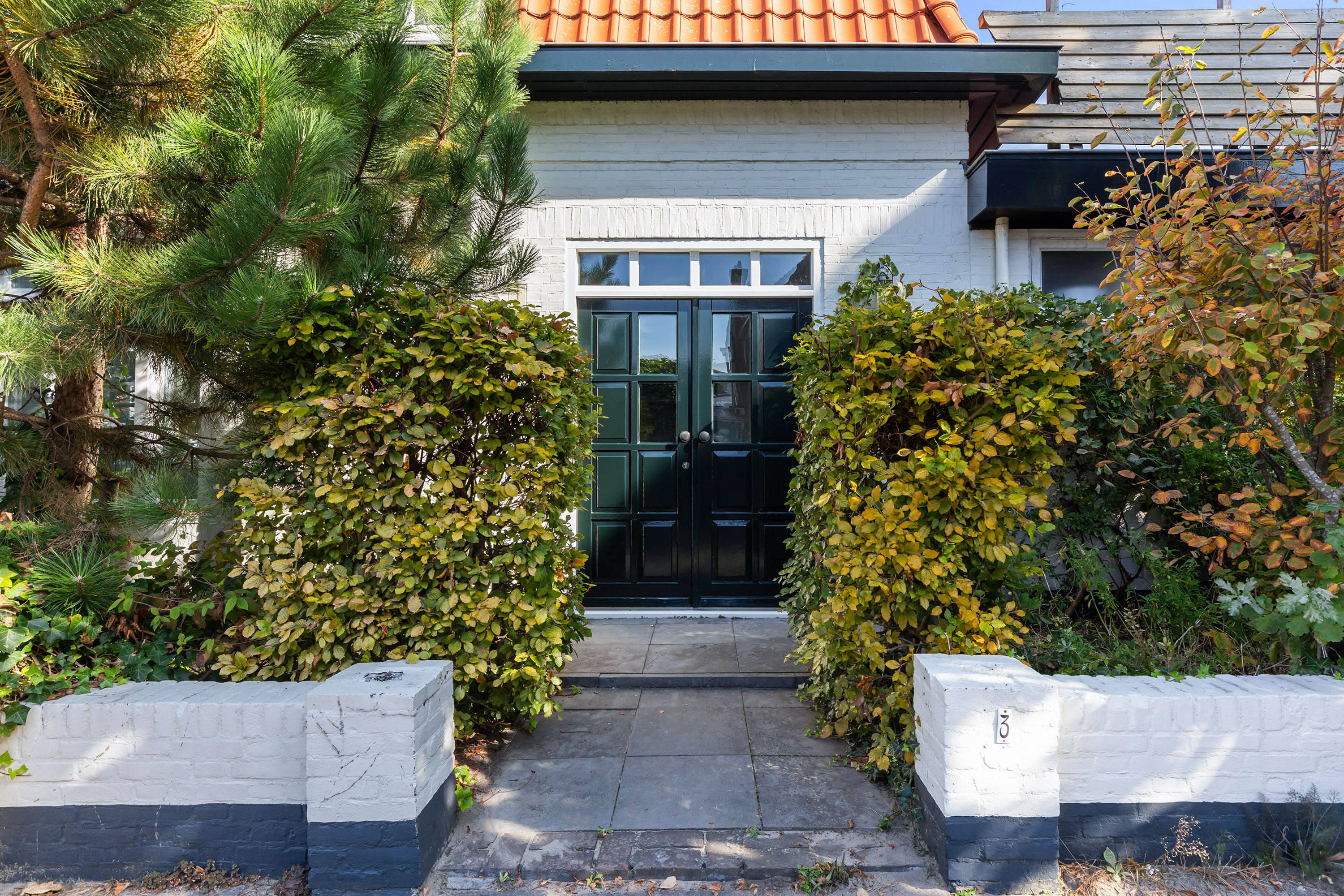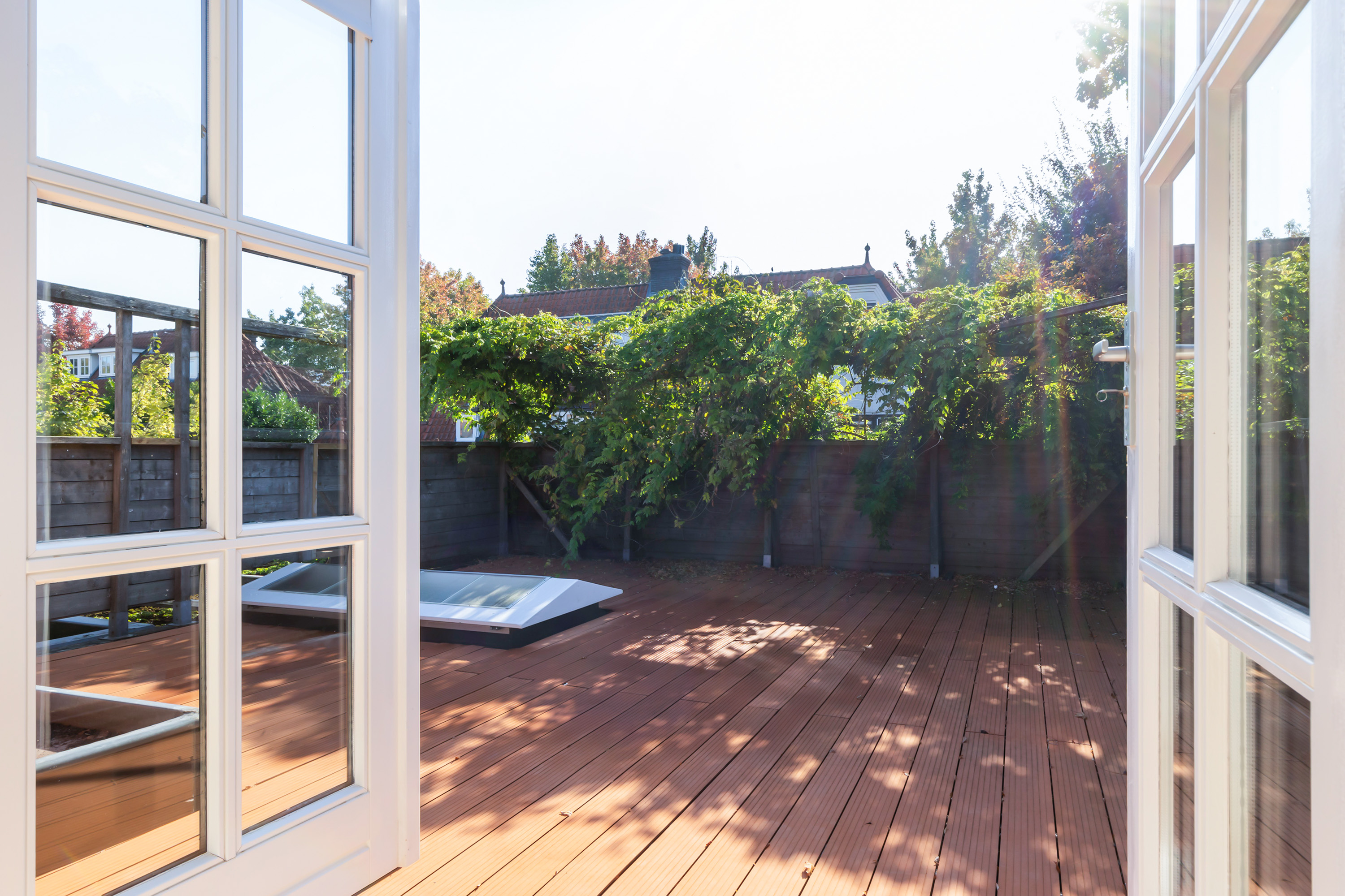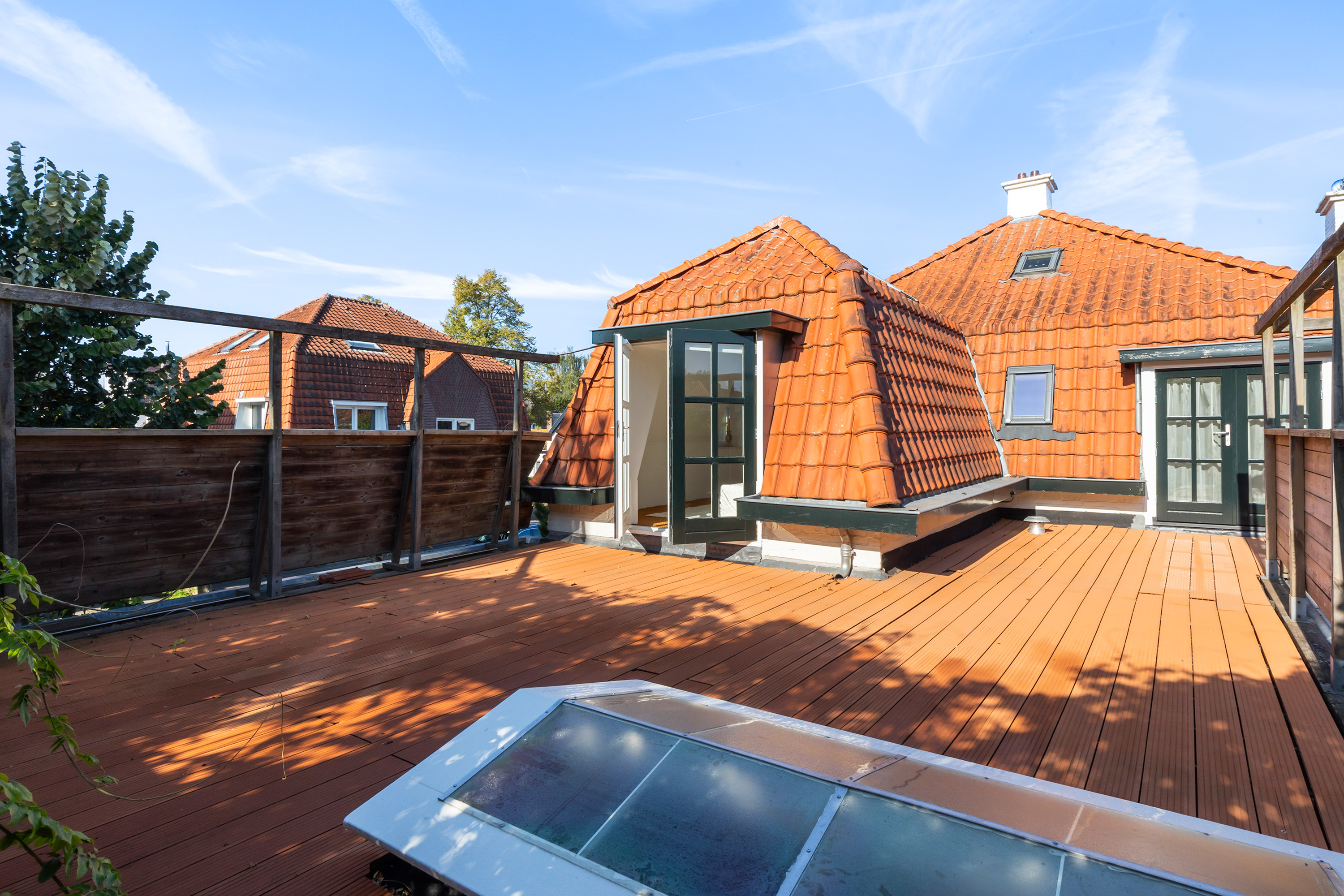 The appearance is both robust and romantic, with white façades, red roof tiles and wide eaves. The 331 m² plot includes a private city garden with terraces to the south-west and east, a veranda and a large roof terrace of 55 m². Thanks to the sunny position, composite decking and full fencing, this is a place designed for relaxation and enjoyment in complete privacy.