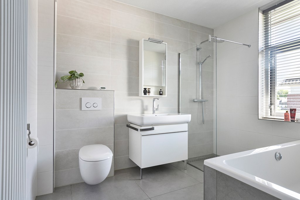 The bathroom is practical and stylish, fitted with a bathtub, walk-in shower, washbasin with mirror and storage unit, and a toilet. Fully tiled and neatly finished, it’s ready for immediate use.