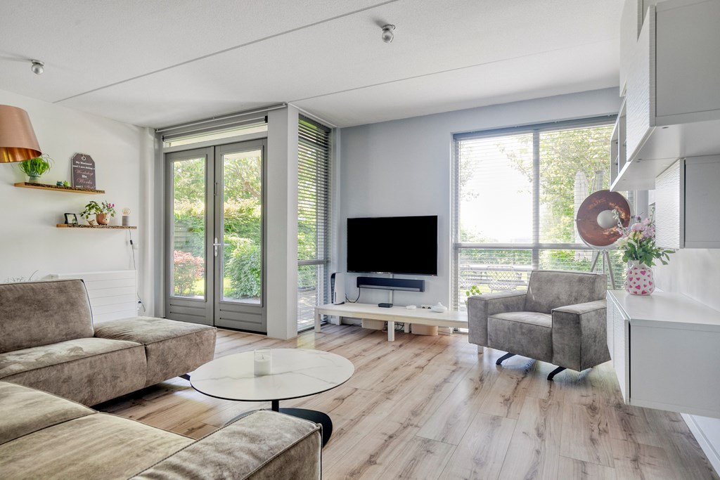 This generous living room is the heart of the home, with an open view towards the floodplains. Large windows allow abundant daylight, giving the space an open, airy feel. The flexible layout offers plenty of options for a cosy seating area. French doors connect seamlessly to the garden, and the modern finishes complete the picture.