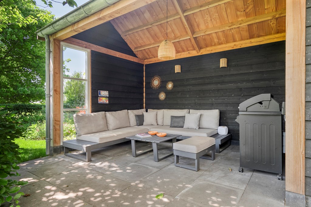French doors from the living room open to the deep, green back garden that borders the floodplains—the true highlight of this property. The garden is beautifully laid out with a mix of paving and greenery and offers plenty of room for a lounge set or outdoor dining table. Its orientation allows you to make the most of the sun throughout the day. At the back of the garden is a charming covered terrace (with internet connection), perfect for sitting and/or working outdoors even on less sunny days. The garden offers excellent privacy and forms a true oasis of calm.