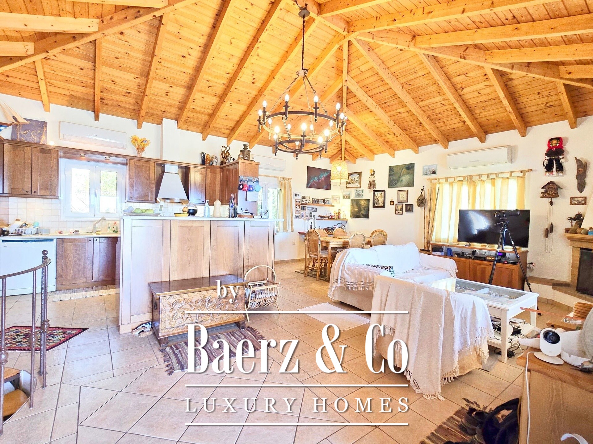 Upstairs, the first floor’s visible wooden roof creates architectural warmth, framing an open-plan living and dining area, kitchen, two bedrooms, and a bathroom. A 90 m² terrace offers sweeping sea views, while thoughtful landscaping provides an outdoor cinema and BBQ area.