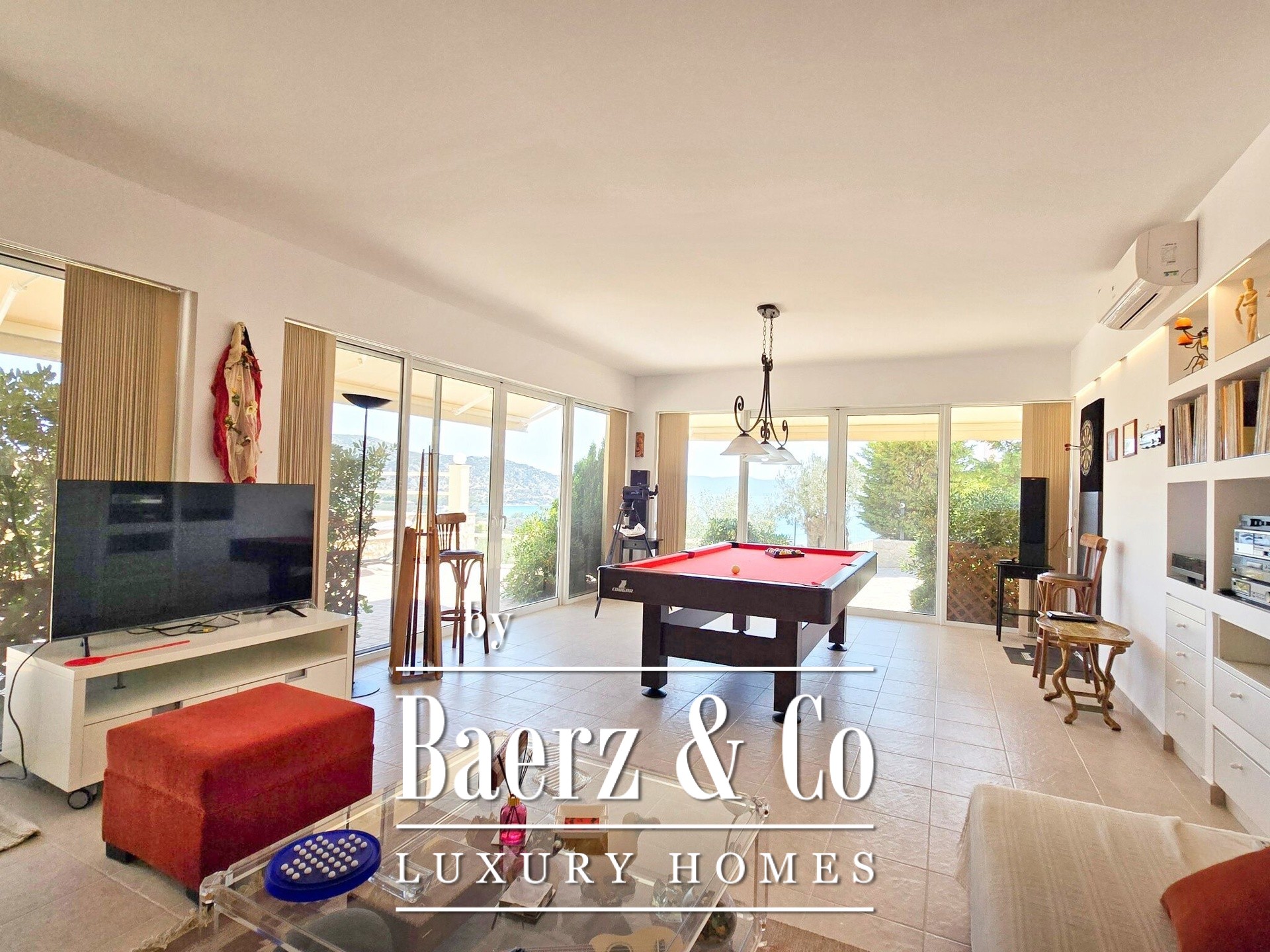 Throughout Villa Ermioni, elements such as a photovoltaic system, heat pump, air conditioning, security alarm, cameras, borehole, and double glazing ensure efficiency and peace of mind. The surrounding gardens are planted with fruit trees and ornamentals, blending stonework and cobblestone paths to encourage a relaxed Mediterranean lifestyle. This luxury villa for sale in Ermioni harmonizes quality construction, privacy, and access to Greece’s storied beaches.