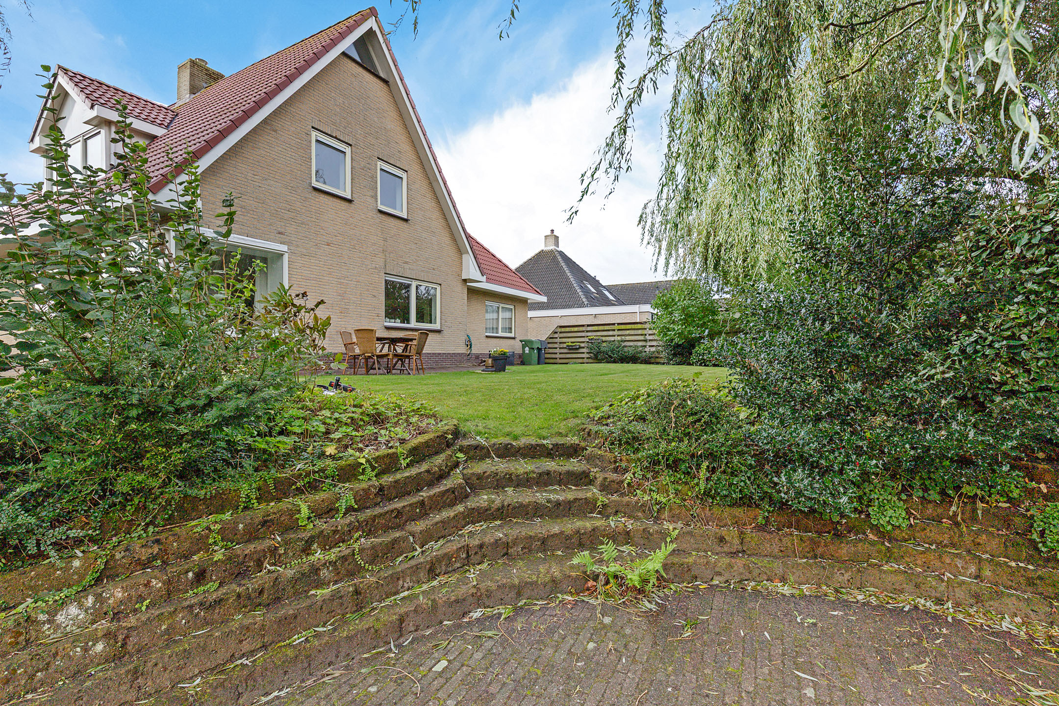 The beautifully landscaped garden with mature trees, shrubs, borders, and terraces ensures privacy and offers both sunny and shaded spots throughout the day. A sunken south-east facing terrace directly on the water, complete with a private swimming ladder, is the perfect place to enjoy your morning coffee or relax all day while watching boats pass by. The waterway is a branch of the famous *Bolswardervaart*, part of the historic Eleven Cities Route, and is accessible by boat.