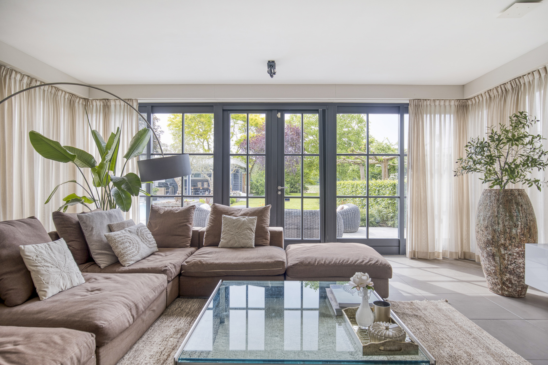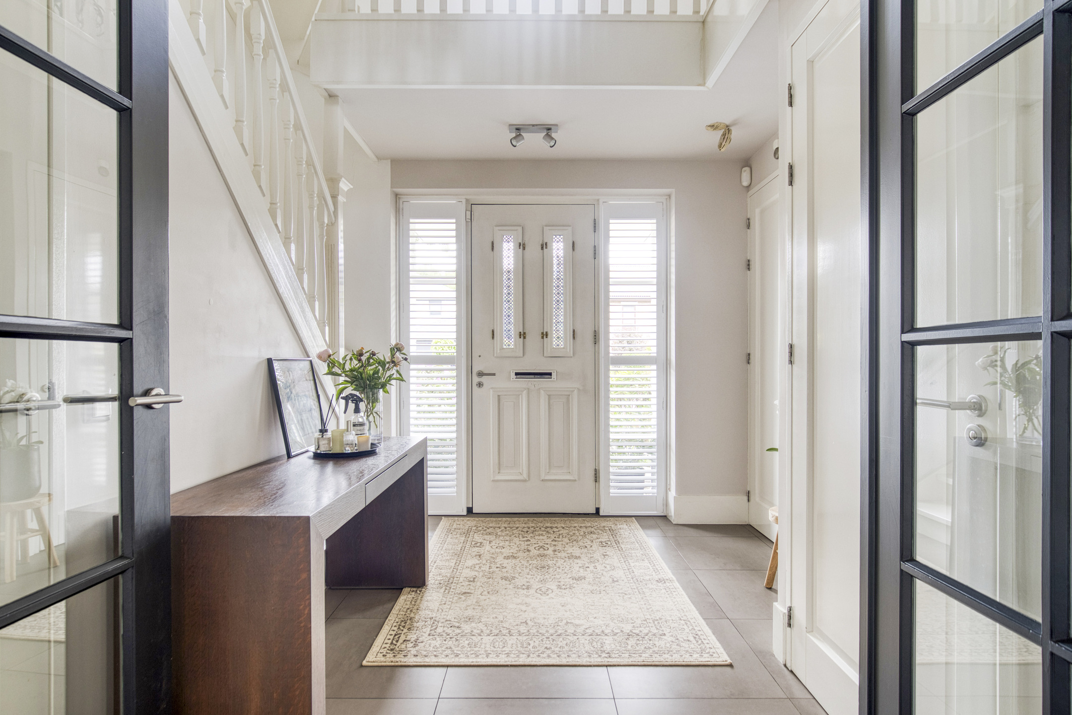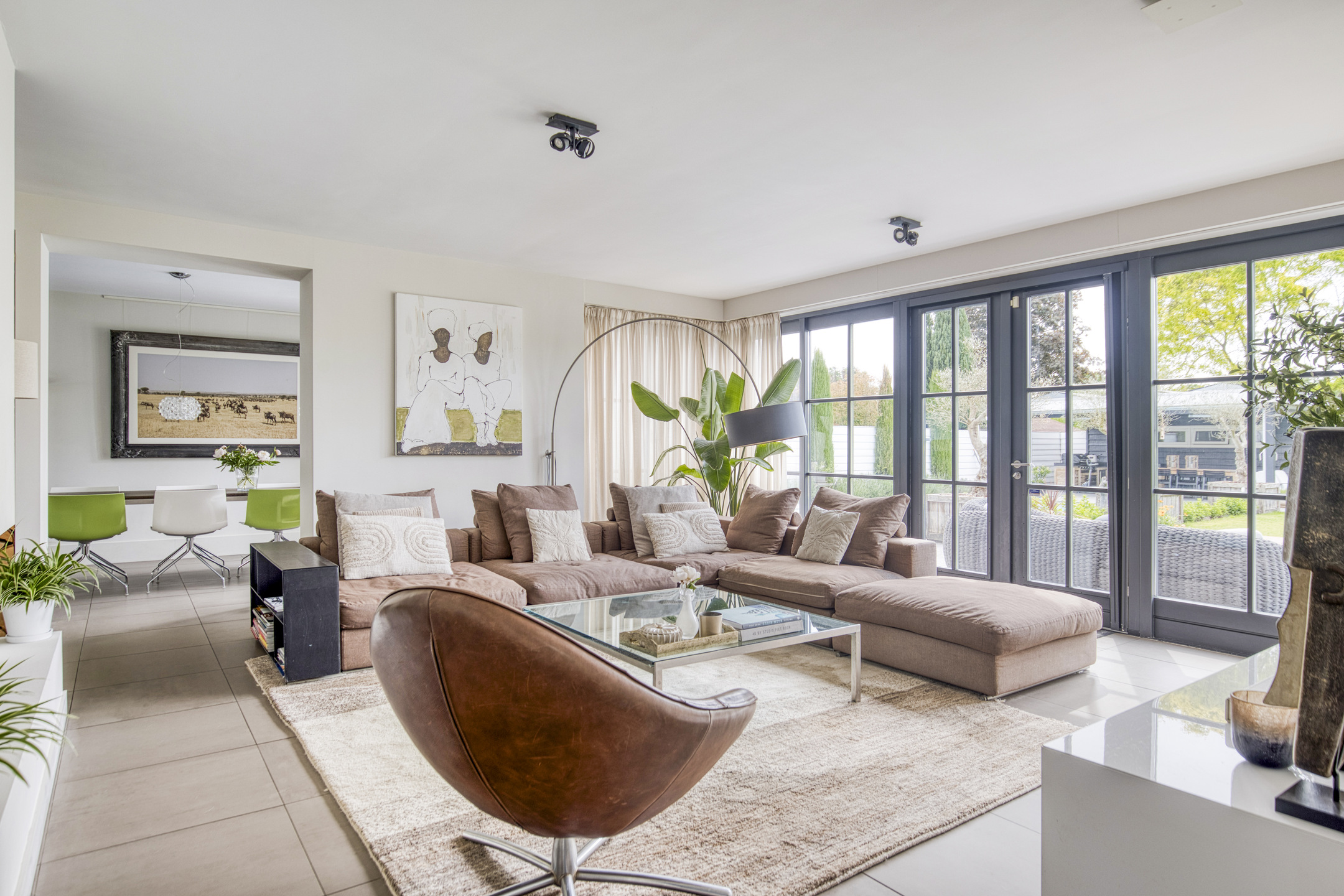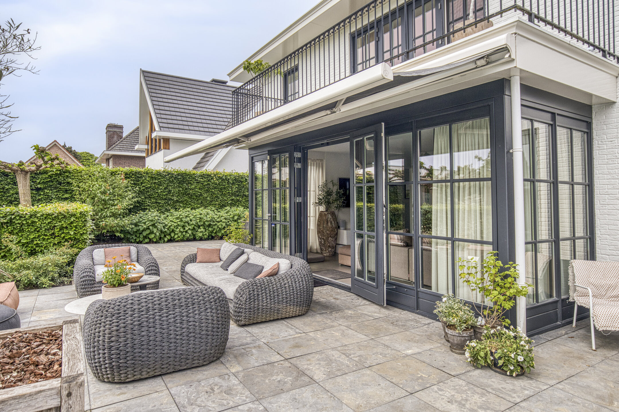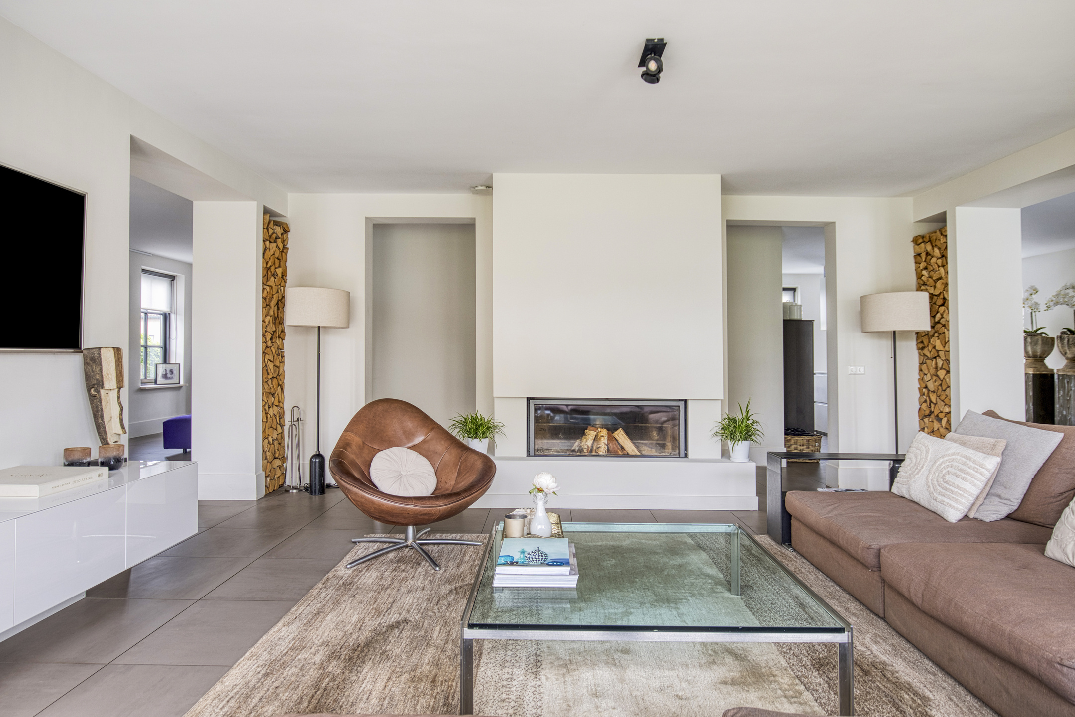 Bij binnenkomst valt direct de imposante entree op: licht en ruimte komen u tegemoet, een voorbode van wat deze villa te bieden heeft. De halfopen living vormt het hart van het huis, met prachtig zicht op de tuin en openslaande deuren naar het terras.