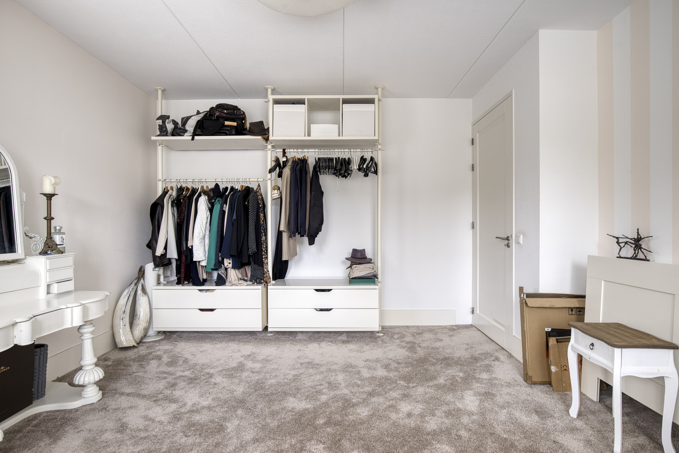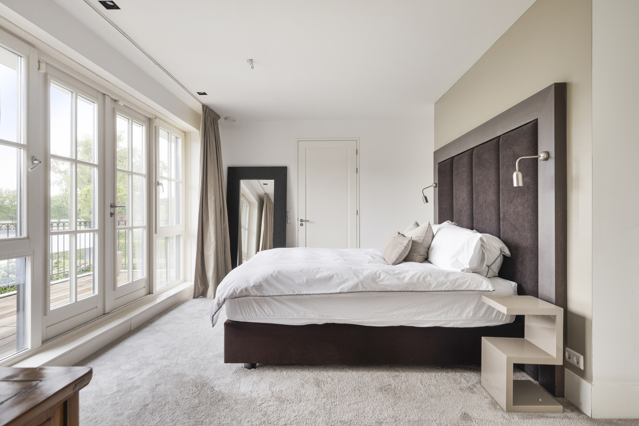 slaapkamer achterzijde (ca. 20 m²) met een inloopkast en toegang tot badkamer en-suite, wandafwerking stucwerk vloer afgewerkt met tapijt, plafond afgewerkt met stucwerk, tuindeuren naar het balkon;