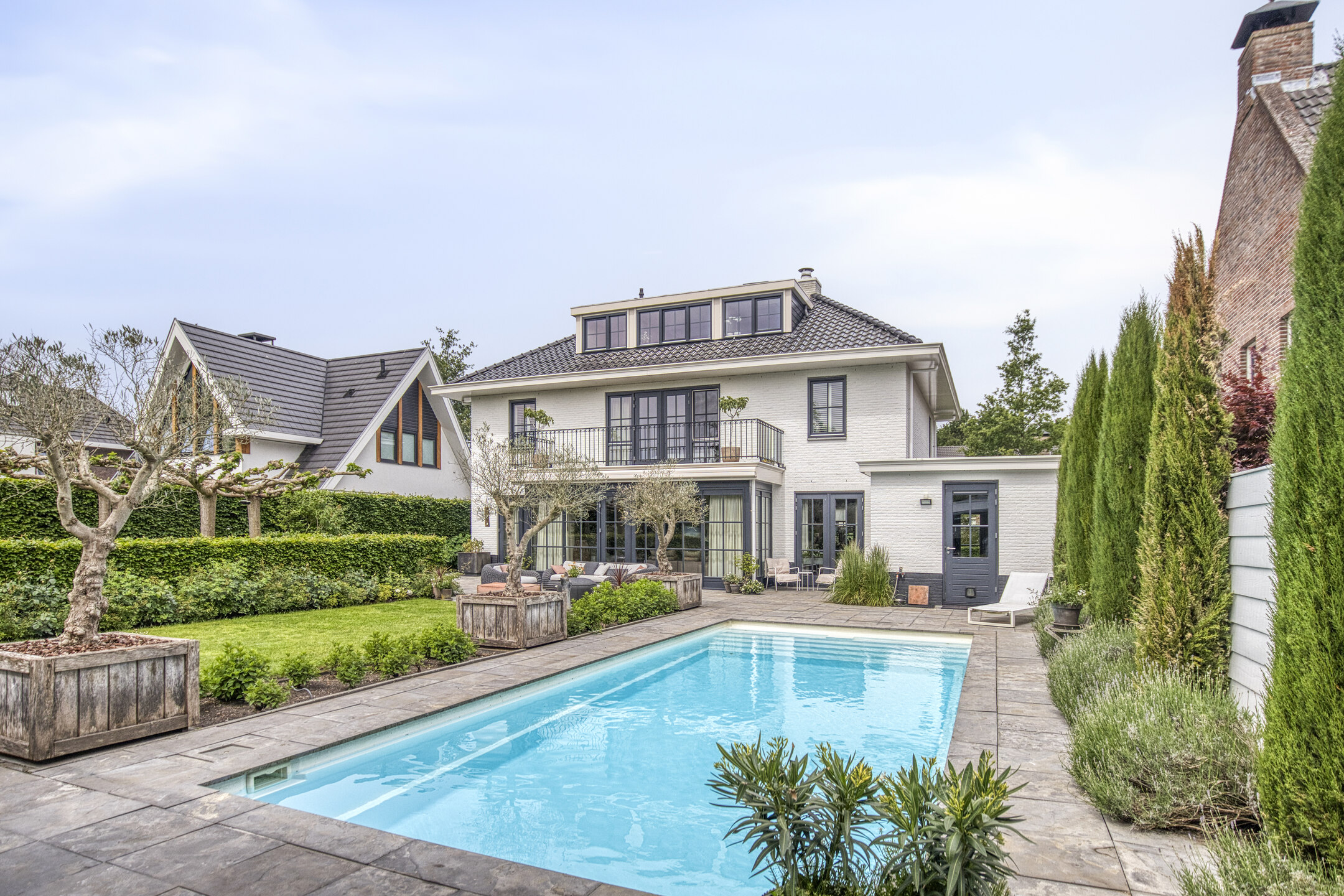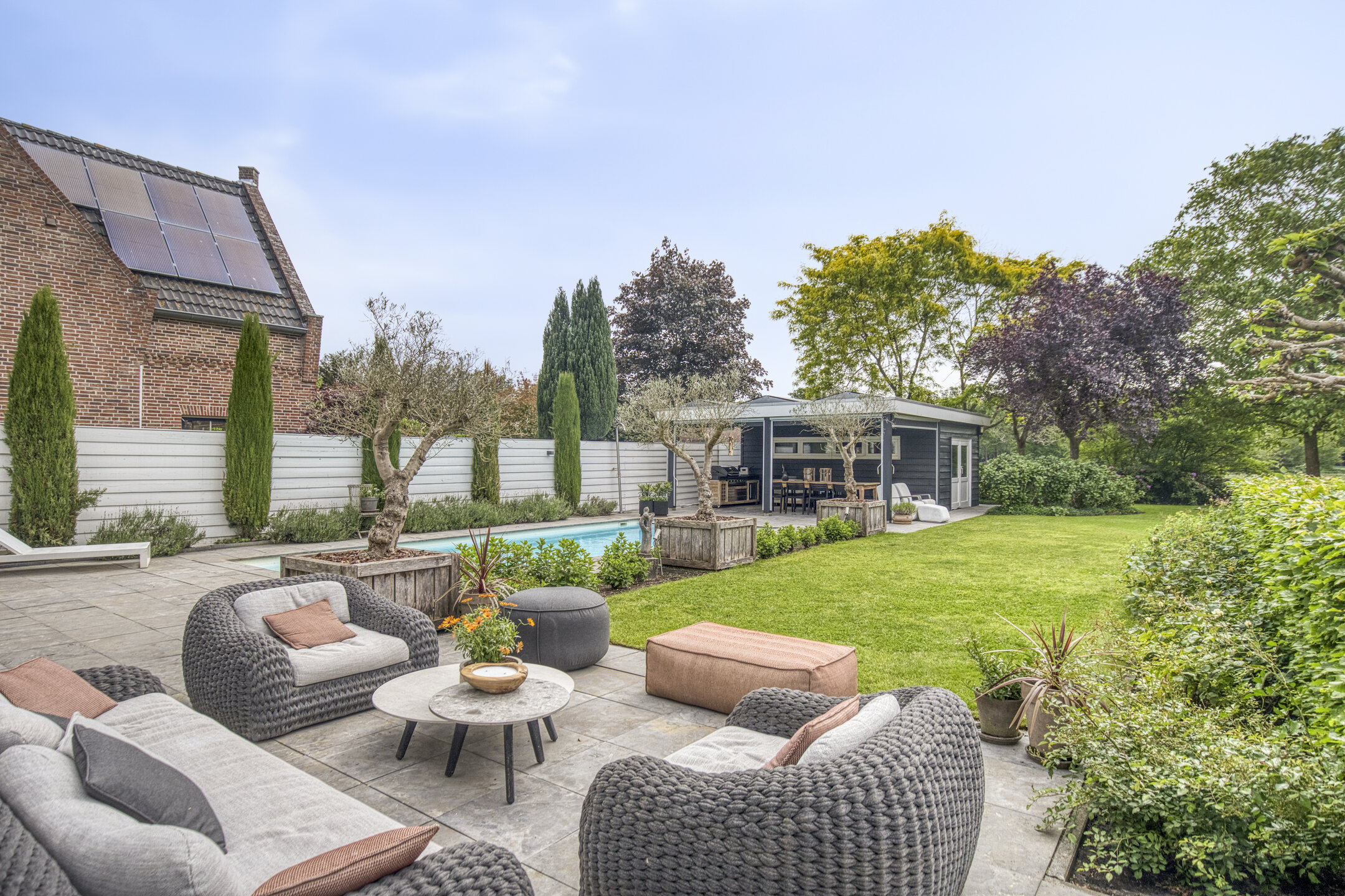 Aangelegde tuin rondom, zonnige gesitueerd op het zuiden, terras bestraat met natuurstenen sierbestrating en voorzien van borders, gazon, grindterras, elektra, tuinverlichting, buitenkraan, zwembad met elektrisch dek, buitendouche, een zonnescherm t.p.v. woonkamer en een poolhouse (vv. vloerverwarming) met aansluitend een veranda vv. buitenkeuken, lichtspots en zonne-screens;