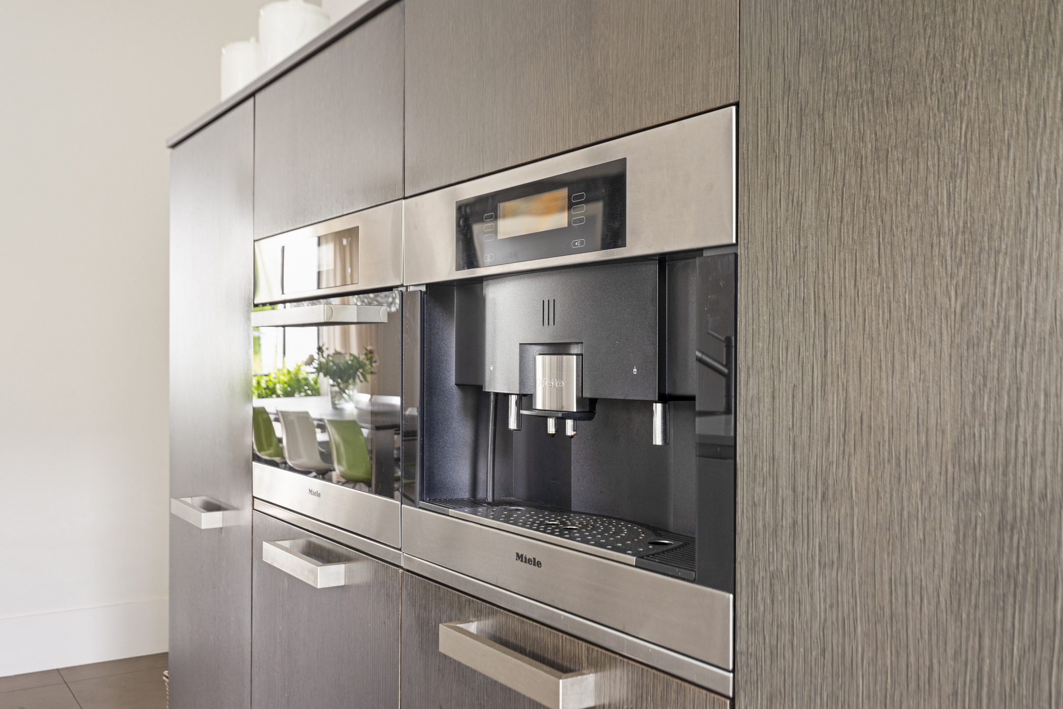 De Boffi keuken links van de living is een echte blikvanger. Voorzien van een kookeiland, een vaste kastenwand met inbouwapparatuur en ruimte voor een grote eettafel. Ideaal voor lange diners met vrienden en familie. Ook hier brengen openslaande deuren naar de tuin veel licht en een heerlijk vrij gevoel.