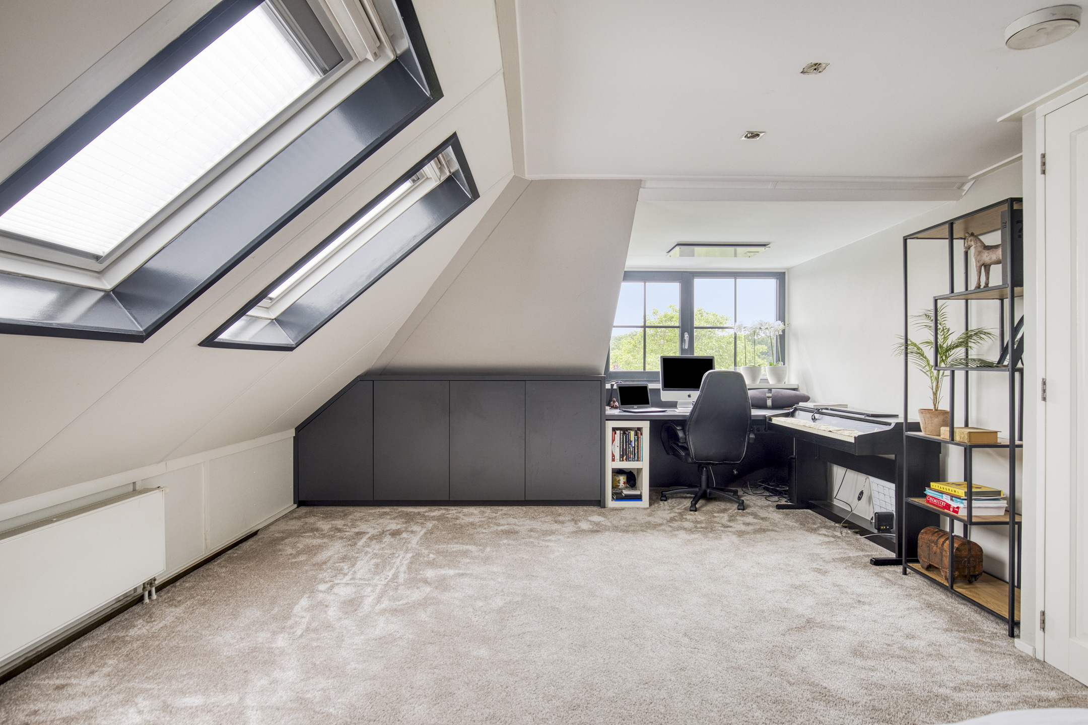 slaapkamer links, voorzien van op maat gemaakte kasten, studiehoek, 2-tal dakramen en een dakkapel aan de achterzijde vv. airco-installatie, wandafwerking stucwerk, vloer afgewerkt met tapijt, plafond afgewerkt met stucwerk en dakplaten in het zicht;