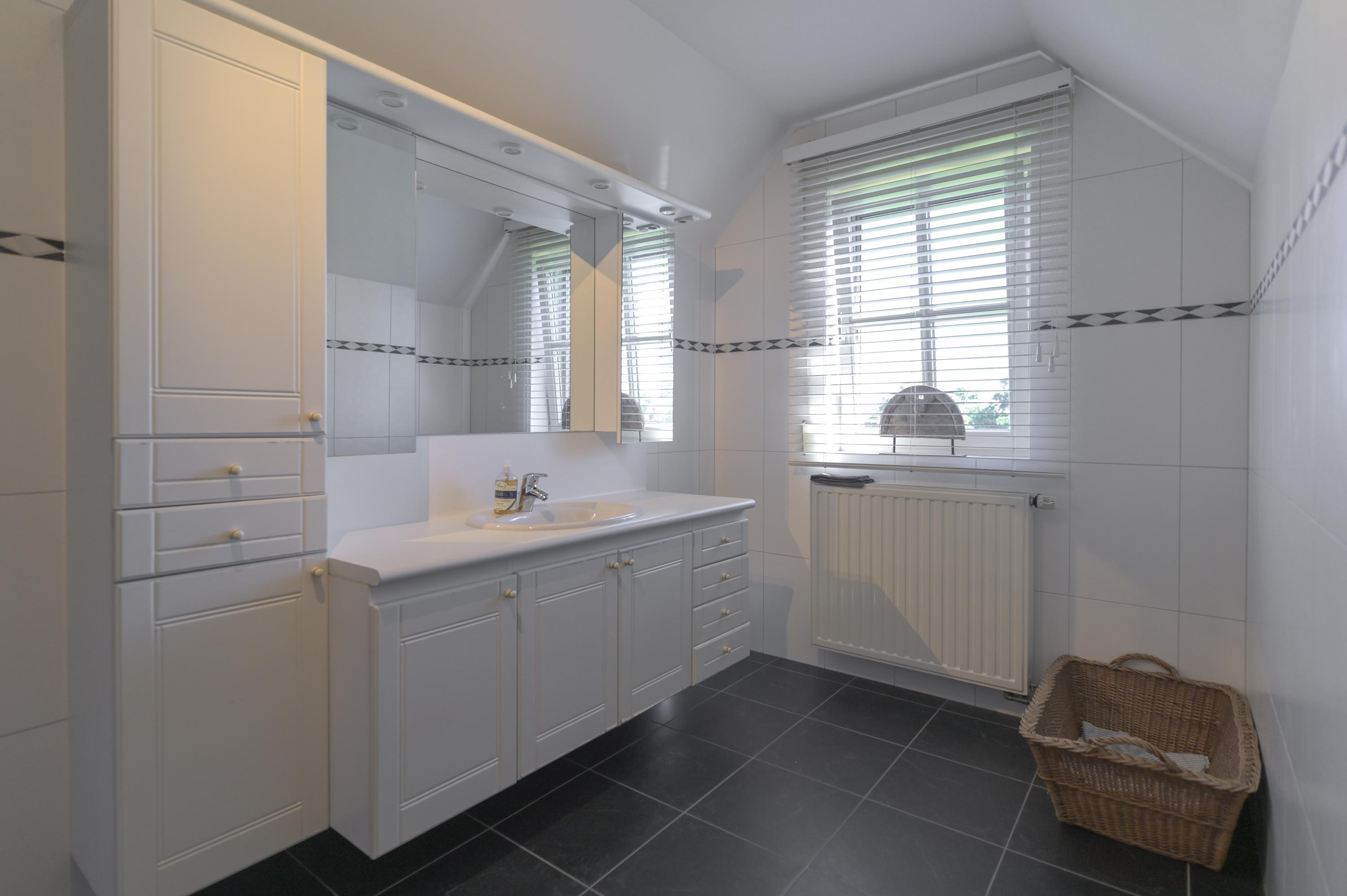 All bedrooms have two dormer windows, insect screens and window coverings. The bathroom is fully tiled and features a shower, bathtub, washbasin with vanity, radiator, electric underfloor heating, and natural ventilation. The separate toilet is fitted with a washbasin.