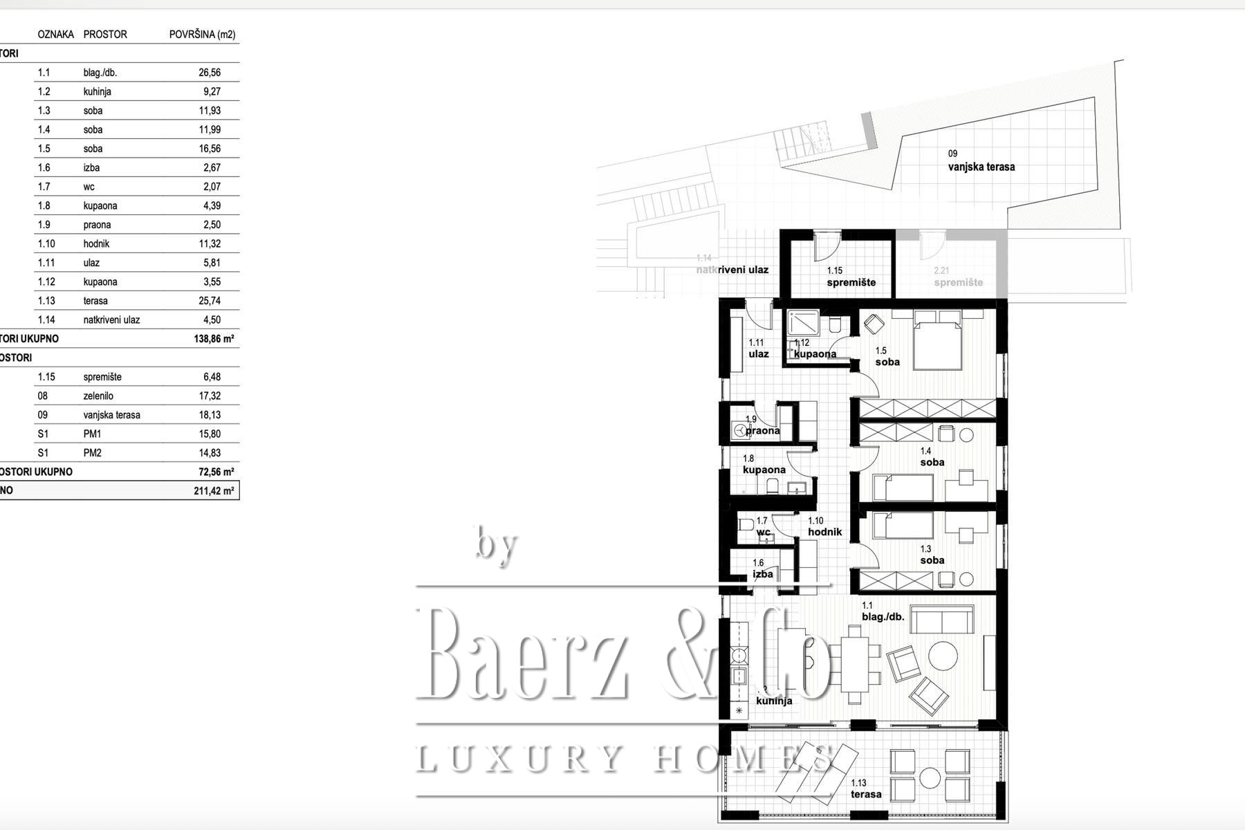 This apartment Kostrena unfolds across 251.58 m² in an elegant new building, offering a rare blend of contemporary architecture and calm coastal living. Spanning two levels, the residence reveals five discreetly structured bedrooms and five bathrooms, with each space shaped for light, privacy, and open connection to the outdoors. The main living area and dining space, totaling 40.92 m², merges seamlessly with a modern 7.79 m² kitchen, creating the heart of the home for gatherings and quiet evenings alike.