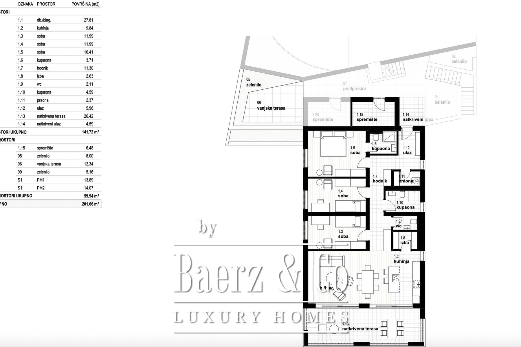 Each bedroom offers refined proportions, ranging from 9.17 m² to 19.20 m², and is complemented by a suite of functional spaces, including a walk-in wardrobe, laundry, pantry, and dedicated storage. Three bathrooms and a guest toilet offer comfort for both family and visitors. Outside, a covered terrace of 25.74 m² and two further terraces flow into a landscaped garden with a private swimming pool, inviting relaxation and silent views across the shimmering Kvarner coast.