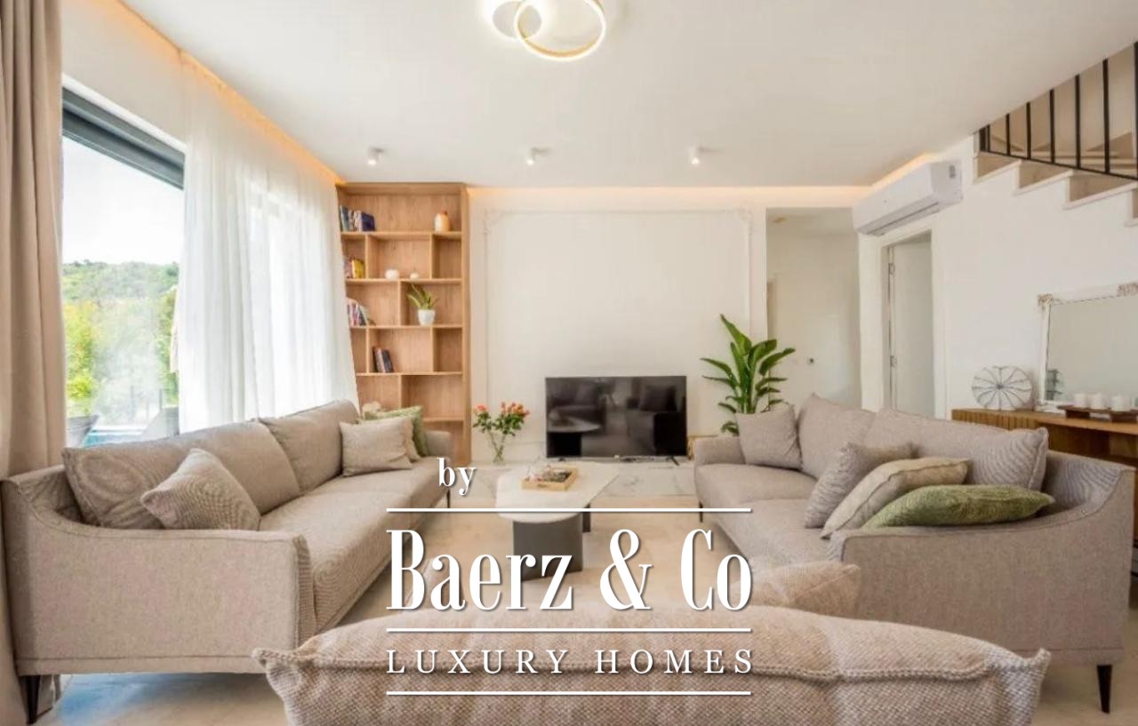 Structure of the villa: living room with kitchen and dining table, 4 bedrooms, 4 bathrooms, 2 terraces and a pool. It has a sea view and the view of the mountains that surround it. The villa is fully furnished and ready for moving in.
