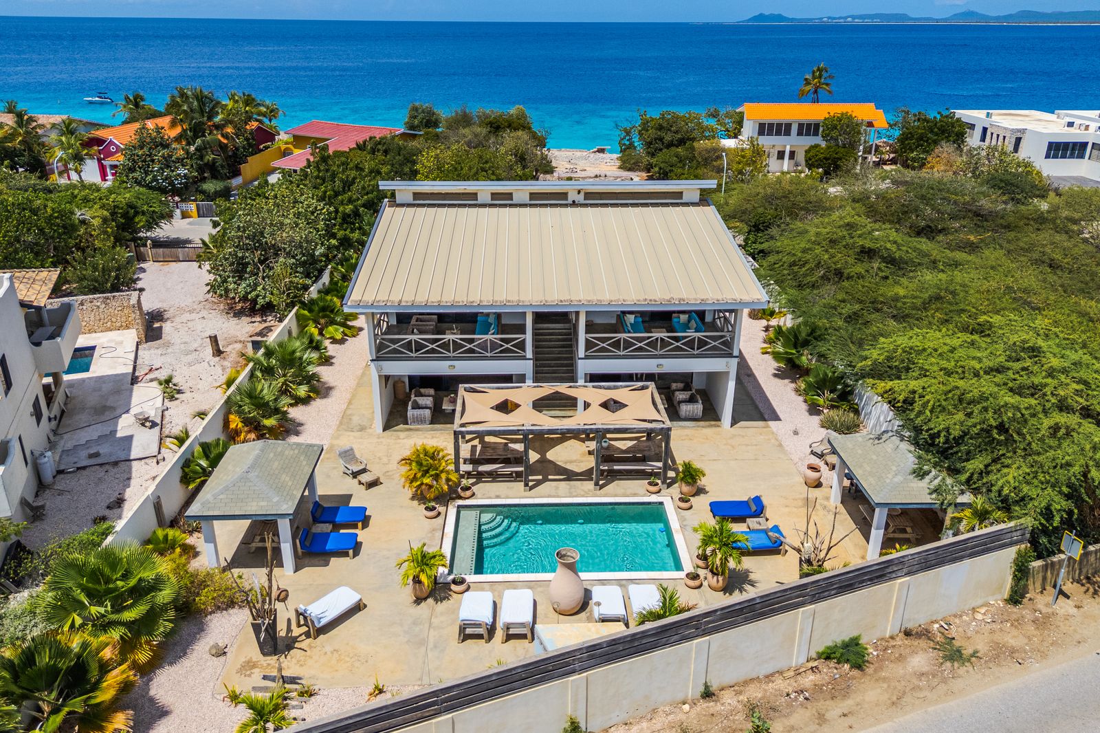 The upper floor features a luxurious 3-bedroom penthouse with spectacular ocean views and a bright, open layout. A perfect place to relax and soak up the best of Bonaire.