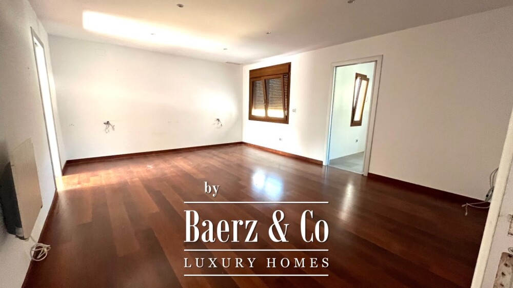 Upon entering, a generous porch leads to a living room that frames the mountains through wide windows, inviting natural light and a sense of serenity. The separate kitchen with a modern island brings ease to daily life and entertaining. Four bedrooms and four bathrooms are thoughtfully placed, with the master suite featuring a dressing room and en-suite bathroom. Another bedroom also enjoys its own bathroom, ideal for family or guests. The lower floor provides an additional double bedroom with en-suite, plus a glazed second living room that opens directly to the pool, barbecue area and outdoor lounge.