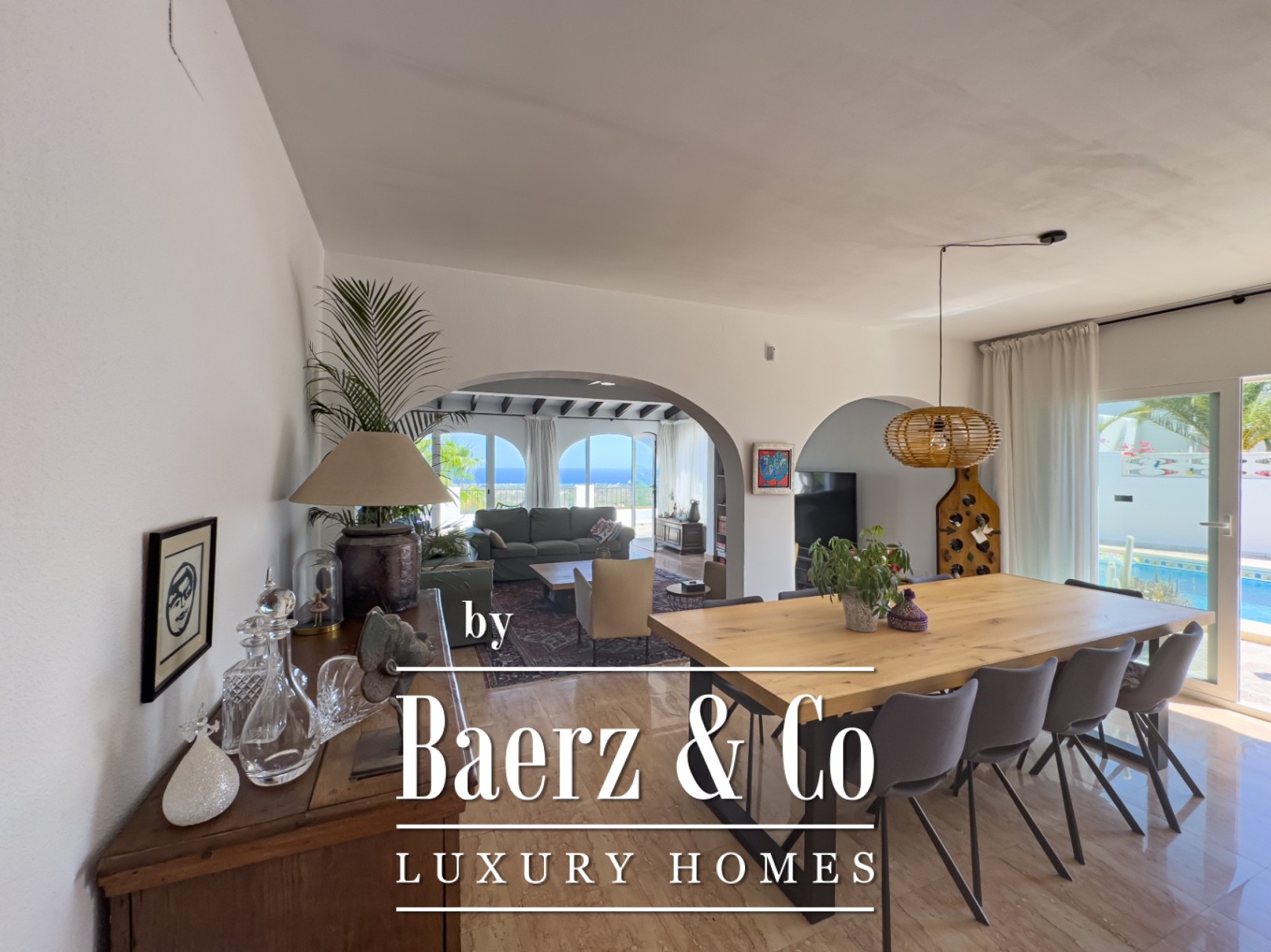 Outside, an array of palm and fruit trees create a sense of quiet seclusion. The private pool, dedicated parking, and refined garden spaces complete the sense of retreat. The outdoor kitchen enhances the Mediterranean atmosphere, making alfresco living effortless.
