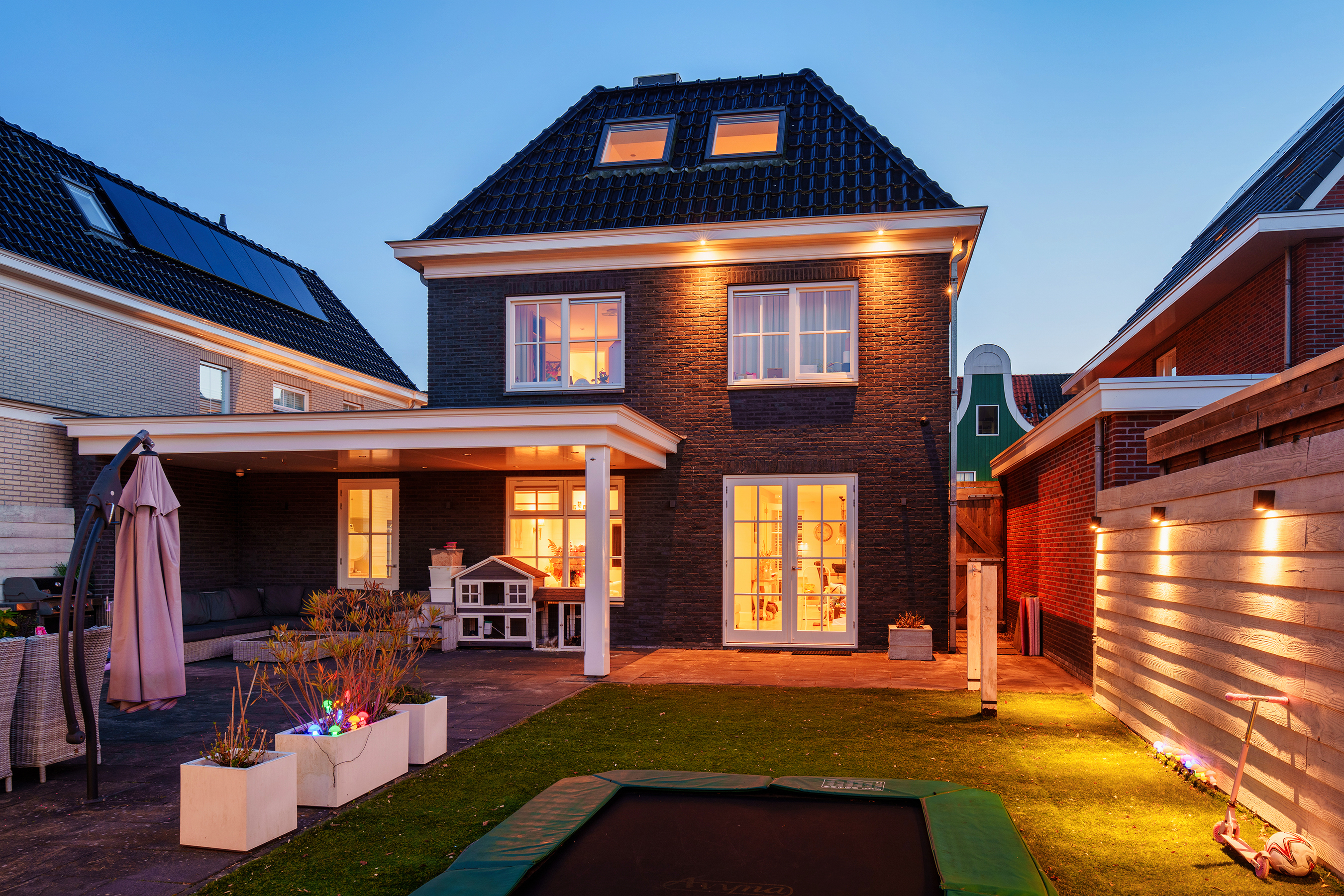 The living room at the garden side is cozy, with a striking cinewall and fireplace. From here, you walk through the double doors into the garden with a very large porch. Perfect for long evenings and outdoor gatherings on the terrace. Built-in trampoline and a swing for the kids. With a glass of wine in hand, you can keep a (small) eye on things. The garden cushions and those of your sloop can be neatly stored in the wooden shed. And that sloop? You simply moor it directly behind the house. On a beautiful summer day, you can sail straight to Amsterdam.