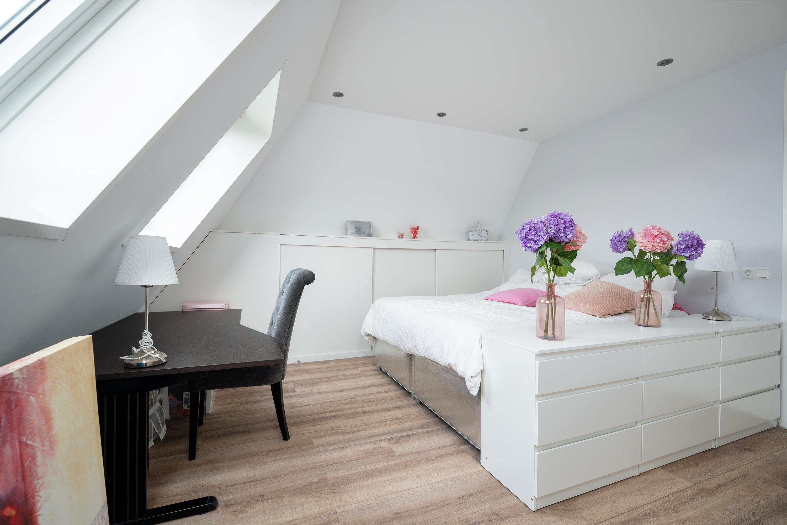 Via the fixed staircase, you reach the second floor. Here you will find two more bedrooms, both with natural light via dormers/roof windows.