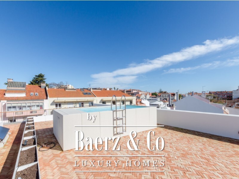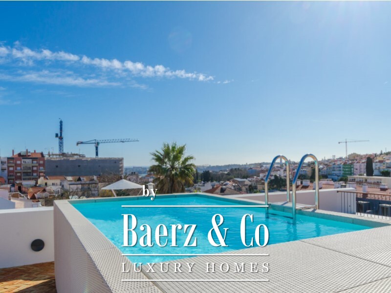 Both bedrooms are en suite, ensuring comfort and autonomy. A guest bathroom provides further refinement. The crown of this residence is the private penthouse rooftop, comprising 120m2 with a swimming pool and far-reaching views over Lisbon. Soft city light filters across the horizon, forming a singular retreat above the rhythm of the city. One parking space underscores the property’s urban ease.