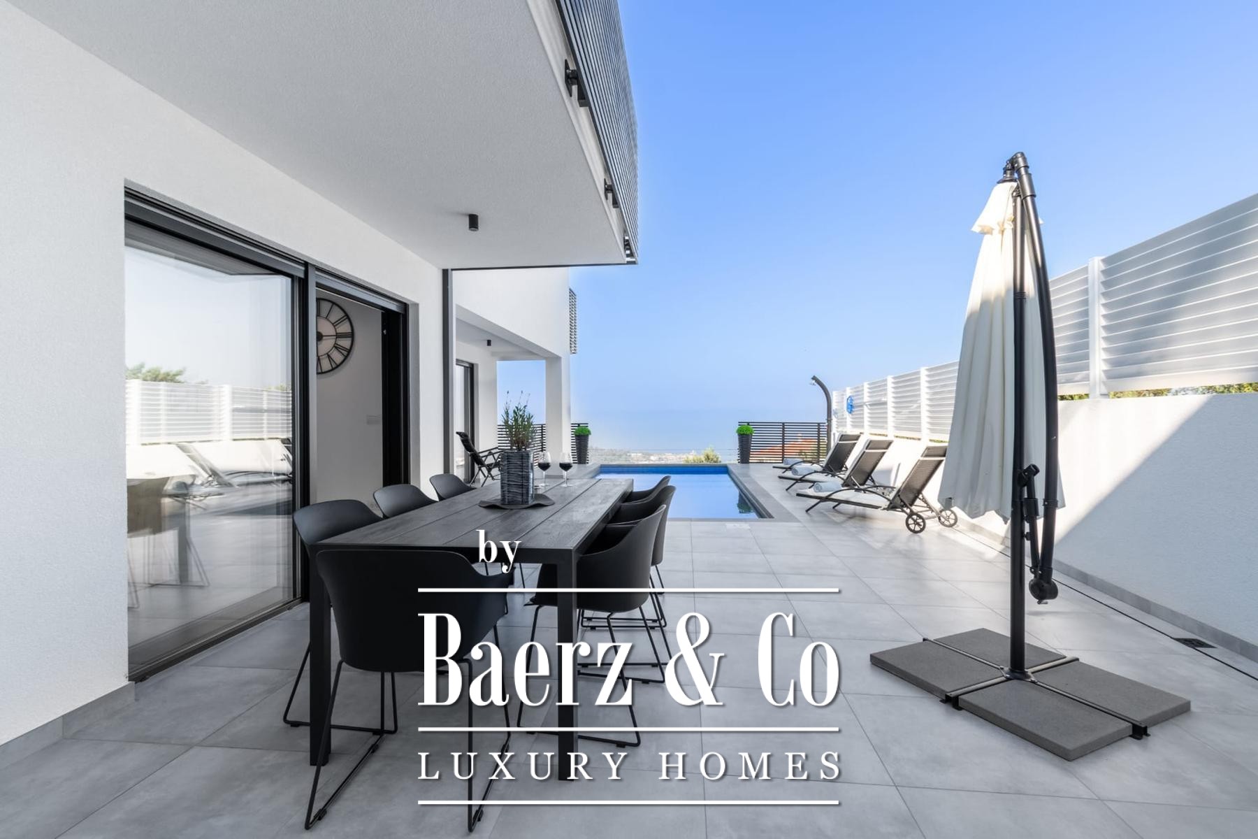 For sale, a two-story apartment with a swimming pool located in the central part of Makarska, about 900 meters from the sea as the crow flies. The apartment is located in a quiet location with an unobstructed view of the city, the sea and the islands.The apartment will consist of a basement where there will be a garage for two cars, a laundry room and an auxiliary room, a ground floor where there will be a living room, a kitchen with a dining room and a toilet, while the living room will have access to a spacious terrace with a 24m2 pool. There will be three