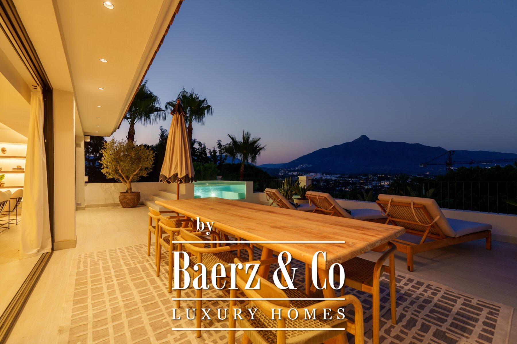 The outdoor spaces are nothing short of spectacular. Beautifully landscaped gardens surround a private swimming pool, complemented by a sunken lounge with ambient lighting and multiple shaded dining and relaxation areas. From sunrise breakfasts overlooking the sea to evening cocktails framed by mountain silhouettes, every moment here is elevated by the breath-taking surroundings.