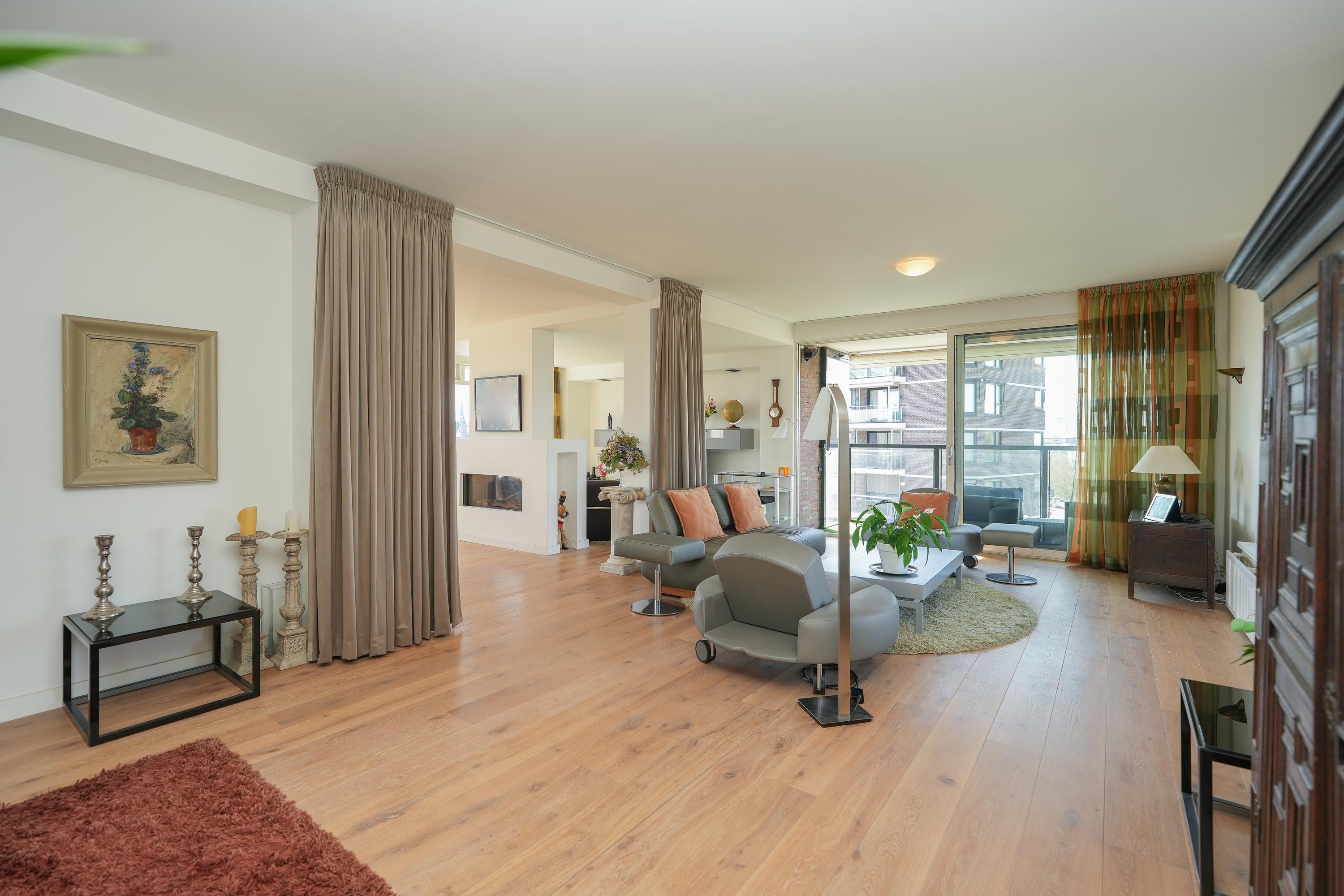 The apartment was created in 2009 by combining two separate units (numbers 44 and 46), resulting in an exceptionally spacious and well-organised home with a clear separation between the living area (44) and the sleeping wing (46). During this process, the apartment was fully and high-quality renovated. A solid oak floor in the living room and hallway, combined with clean finishes and abundant natural light, creates a warm and luxurious atmosphere. Large windows on all sides provide impressive sightlines and panoramic views over the Waal Bridge, the Ooijpolder and the city. Privacy, comfort and refined finishes come together here in a truly unique living experience.