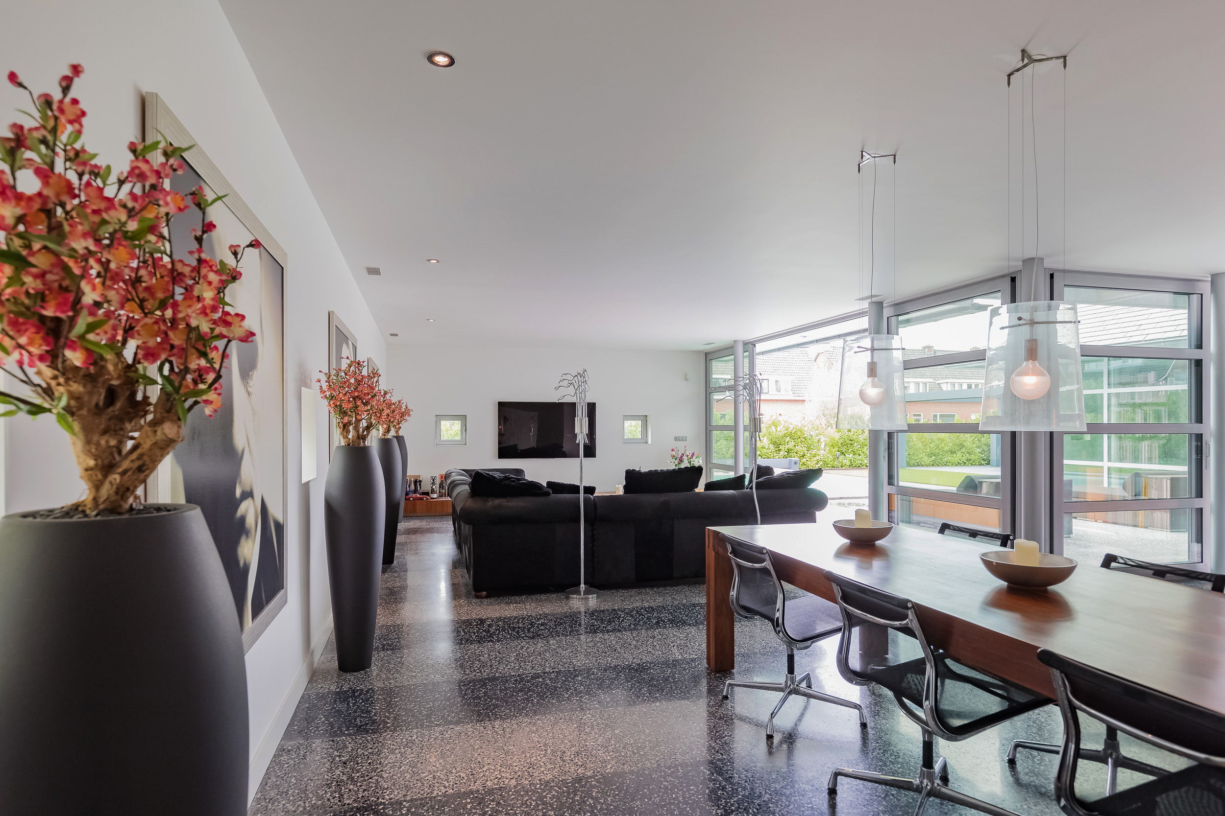 The large living room has a span of up to 18 meters. Enough space for a generous sitting area and a large dining table for cozy dinners.