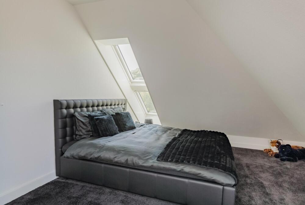 On this floor are 3 bedrooms, 2 bathrooms and a large storage room. The very generous master bedroom has its own luxurious bathroom and a spacious dressing room. The balcony can only be accessed from this room. 20 Skylights provide extra light and also here the symmetry is continued.