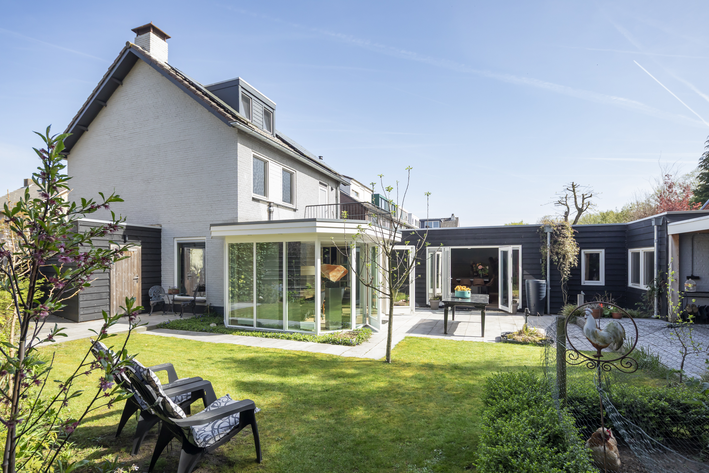 Renovated in 2021, the ground floor flows from a light filled living room with a glass front and garden views, into a spacious kitchen with a striking island, composite surfaces, and high quality appliances. Multiple garden doors open to the southwest facing landscaped garden, framed by an inviting veranda for year round enjoyment. A separate ground floor wing features a bedroom and bathroom suite with direct garden connection, while upstairs, three further bedrooms and a second bathroom enhance flexibility.