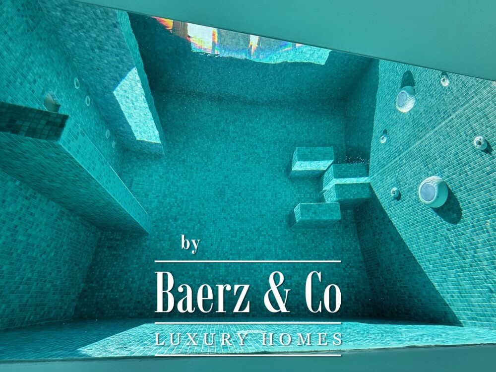 Terraces define the rhythm of daily life, one with a heated swimming pool and hot tub, the other hosting a covered dining table for meals that flow from sunlit breakfast to midnight cocktails, all overlooking the sea. The basement master suite is marked by distinctive natural light filtered through the pool, while amenities such as air conditioning, heat pump, and autonomous heating provide year-round comfort. The property also offers a sauna and double-glazed insulation.