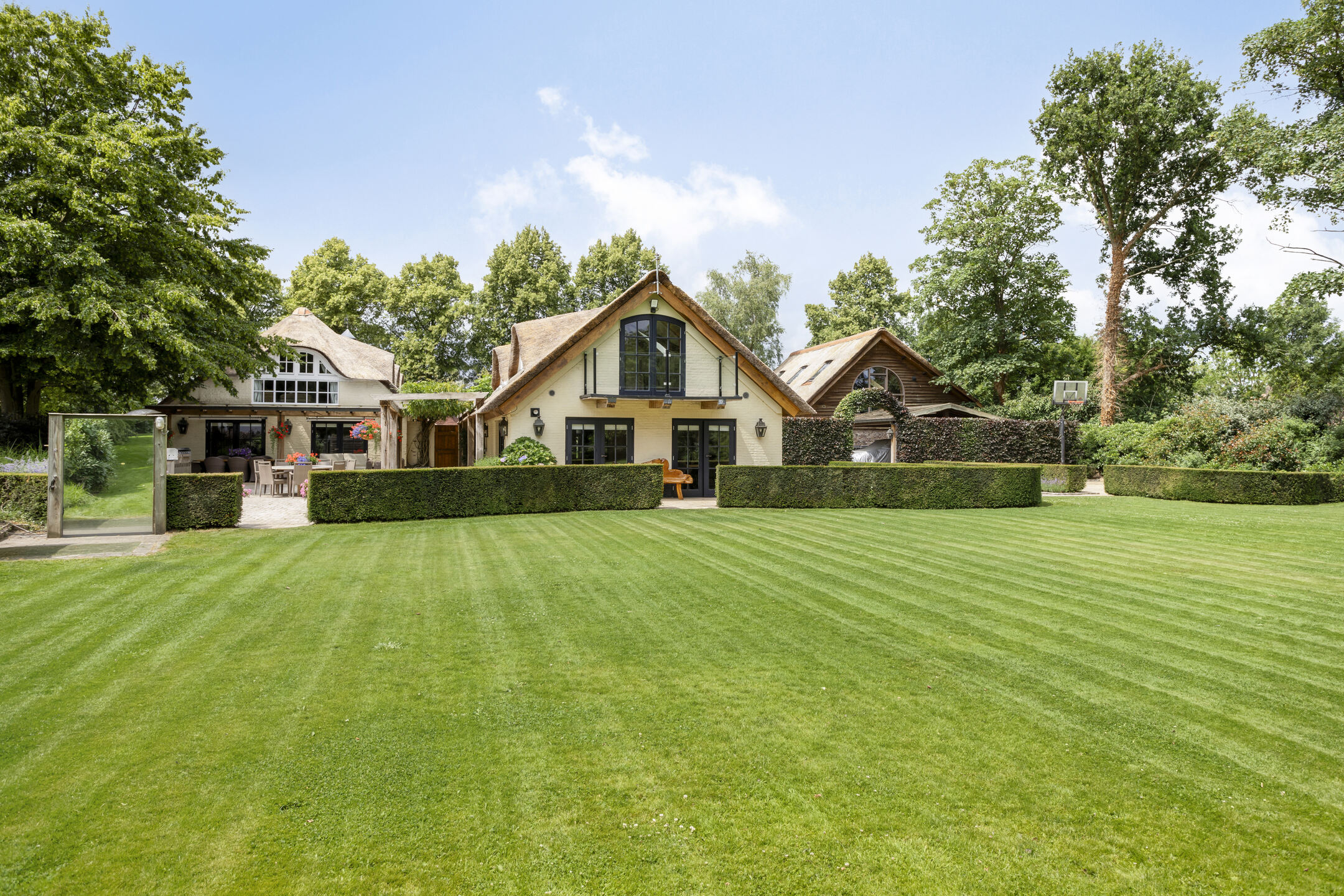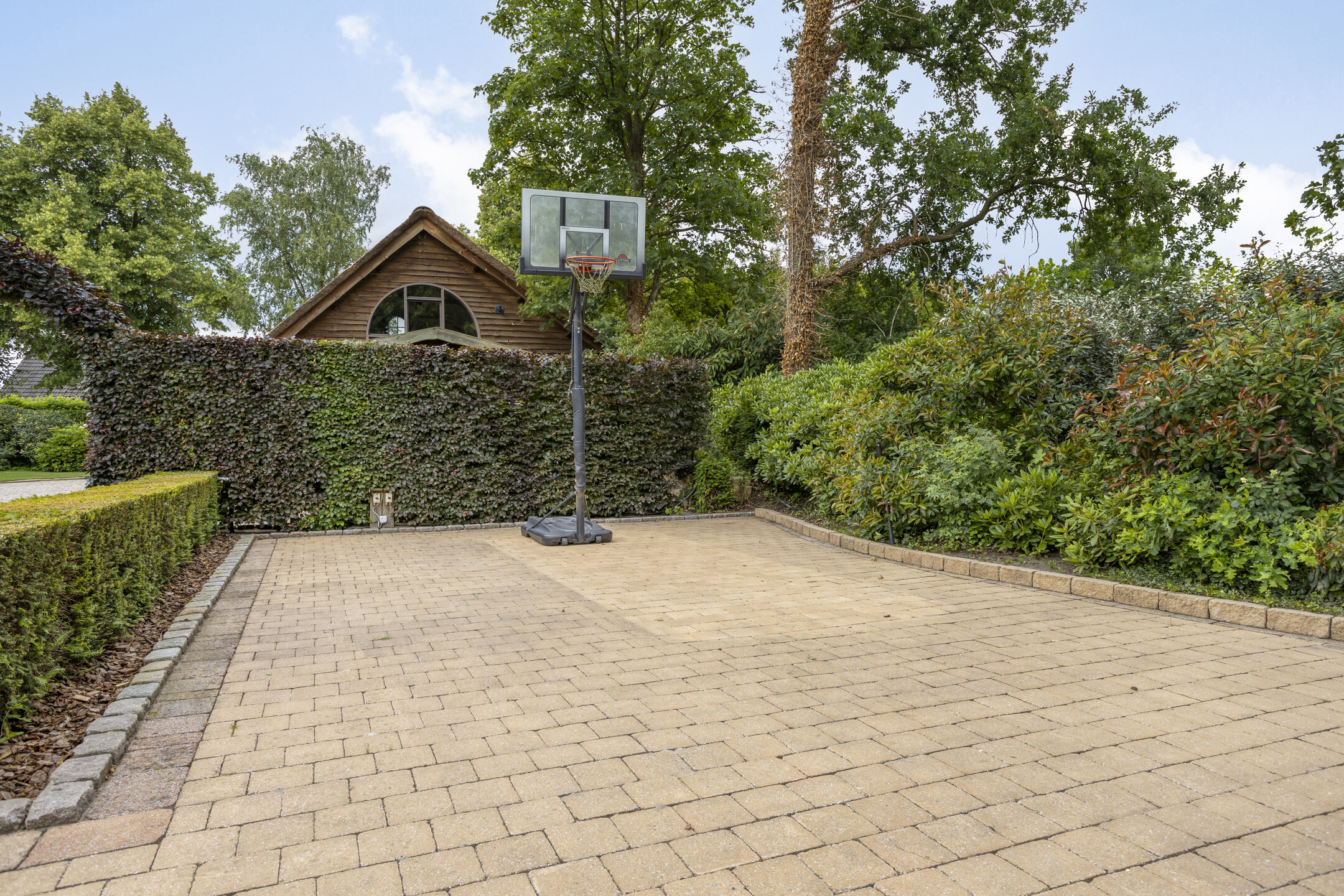 The carport is located on the side of the outbuilding and can accommodate several cars. There is also an electric charging point here. Next to the carport is a basketball court screened off by hedges.