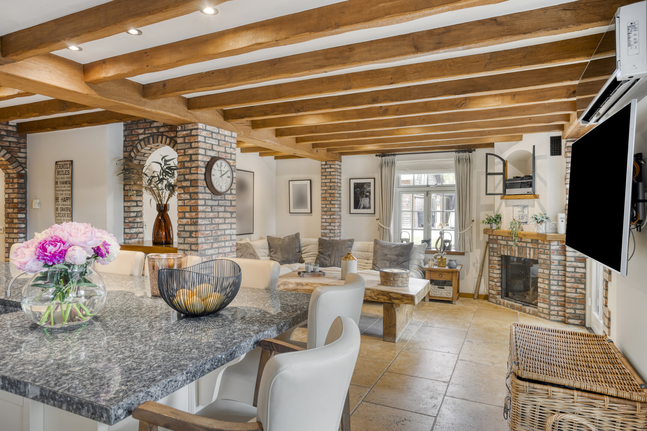 Spacious entrance hall with marble floor, toilet, meter cupboard and beautiful hardwood staircase to the first floor. The hall provides access to the dining room and to a corridor leading to the kitchen, bedrooms and bathroom. Toilet with marble floor and wall tiles, free-hanging toilet and washbasin. Spacious, attractive dining room with marble floor, beamed ceiling and plenty of space for a large dining table. The dining room provides access to the living room. Spacious, stylish living room with wooden floor, large fireplace (wood), a very high ceiling with a unique beam construction and a beautiful mezzanine that provides access to one of the bedrooms. The large and attractive kitchen has marble flooring, a beamed ceiling with recessed spotlights and two double French doors to the covered terrace. On the garden side, the kitchen has a spacious and cosy sitting area with a fireplace (gas). The kitchen consists of a wall unit with a worktop with cooking area, a large cupboard wall and a sink island with bar area. The kitchen is equipped with a marble worktop with various cupboards and drawers, a large AGA stove with various types of ovens, a gas stove, two hotplates and an extractor hood. The “cupboard wall” consists of a large refrigerator, freezer with ice cube function, coffee machine, combi-oven/microwave, steam oven and various cupboards. The sink island, equipped with a marble top with double sink and a bar with no fewer than nine seats, forms the central point in the kitchen. The island also has a dishwasher and various cupboards.
