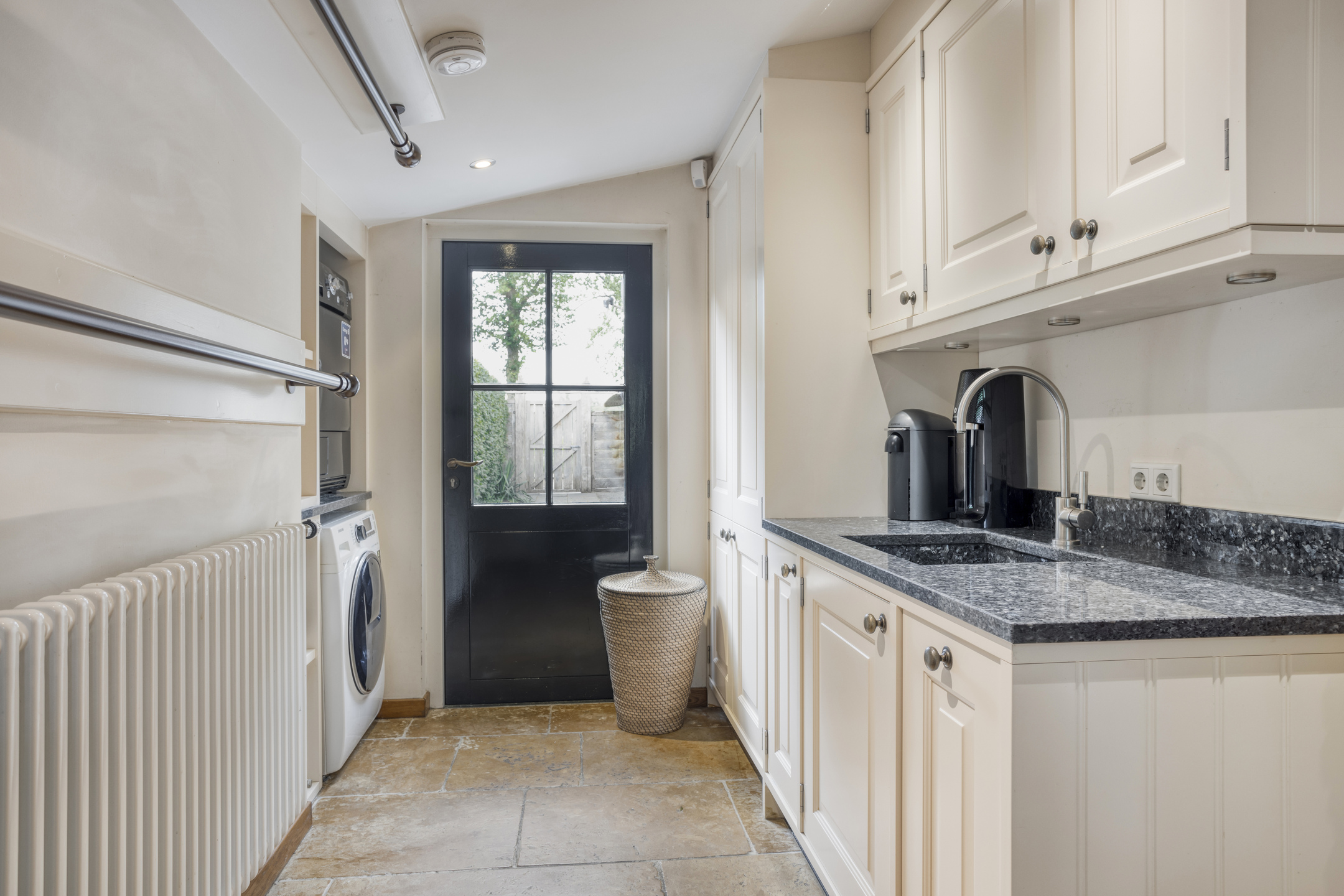 Spacious utility room with marble floor, worktop with sink and various cupboards, meter cupboard, connections for washing appliances, door to the garden and a staircase to the large, full-height cellar. The cellar is divided into a large wine cellar and a room with a hardstone worktop with plenty of cupboard space underneath. From the hall, a corridor leads to the two bedrooms and the bathroom. Bedroom 1 is spacious and has a marble floor, recessed spotlights and direct access to the bathroom. Bedroom 2 has a marble floor and recessed spotlights. The attractive bathroom 1 has a marble floor, wall tiles, recessed spotlights, a free-hanging toilet, walk-in shower, designer radiator and washbasin in a cabinet.