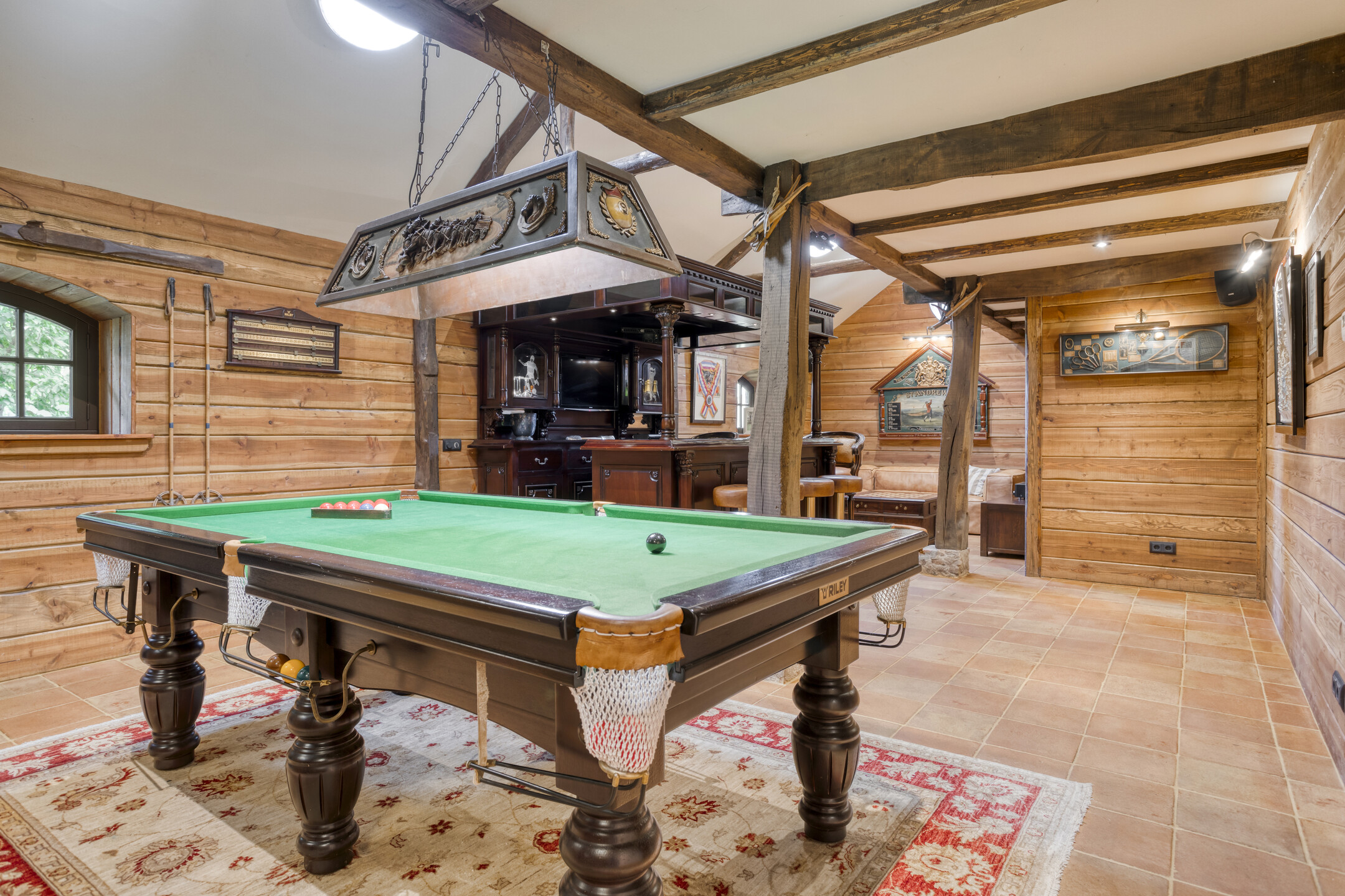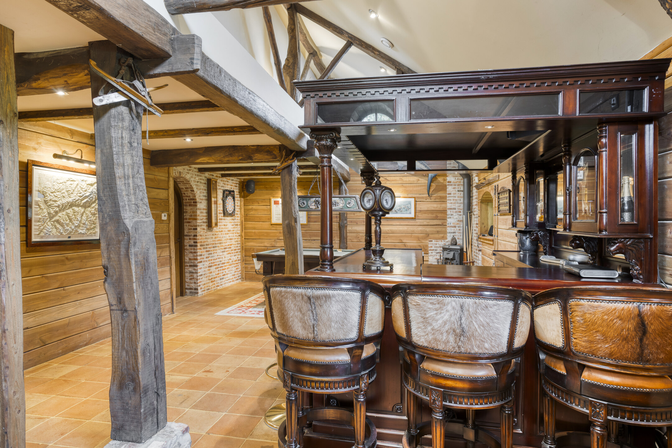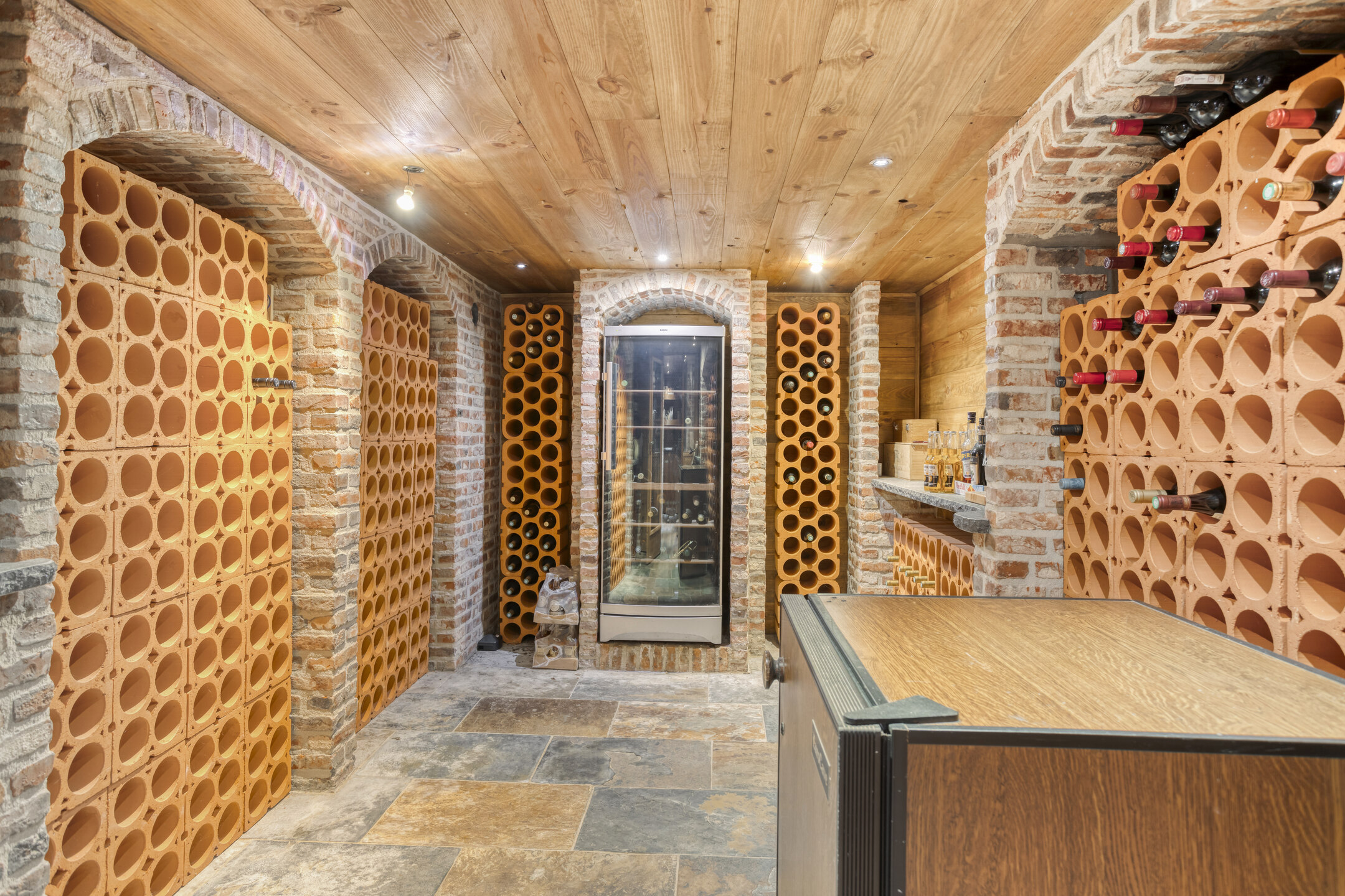The former garage has been completely renovated and fitted with a thatched roof. Part of this “clapboard” annex is used as a storage room. It is accessible via a door near the carport. The ground floor also has a large relaxation room. The hall has natural stone floor tiles, a large cupboard containing the meter cupboard, the toilet and a beautiful hardwood staircase to the first floor. The relaxation room is also accessible from the hall. Toilet with natural stone floor tiles, free-hanging toilet, urinal and a designer cabinet with washbasin. Large, attractive relaxation room with natural stone floor tiles, beamed ceiling with recessed spotlights and a glass window looking through to the fitness room/gym above. This relaxation room has a large stylish bar with a drinks cabinet, a cosy sitting area and a built-in sound system. This space is currently partly used as a “billiard room”. The access door to the storage room is located near the carport. The storage room offers plenty of space and is equipped with a built-in cupboard wall. The storage room also houses the underfloor heating system and the connections for the central heating and irrigation systems.