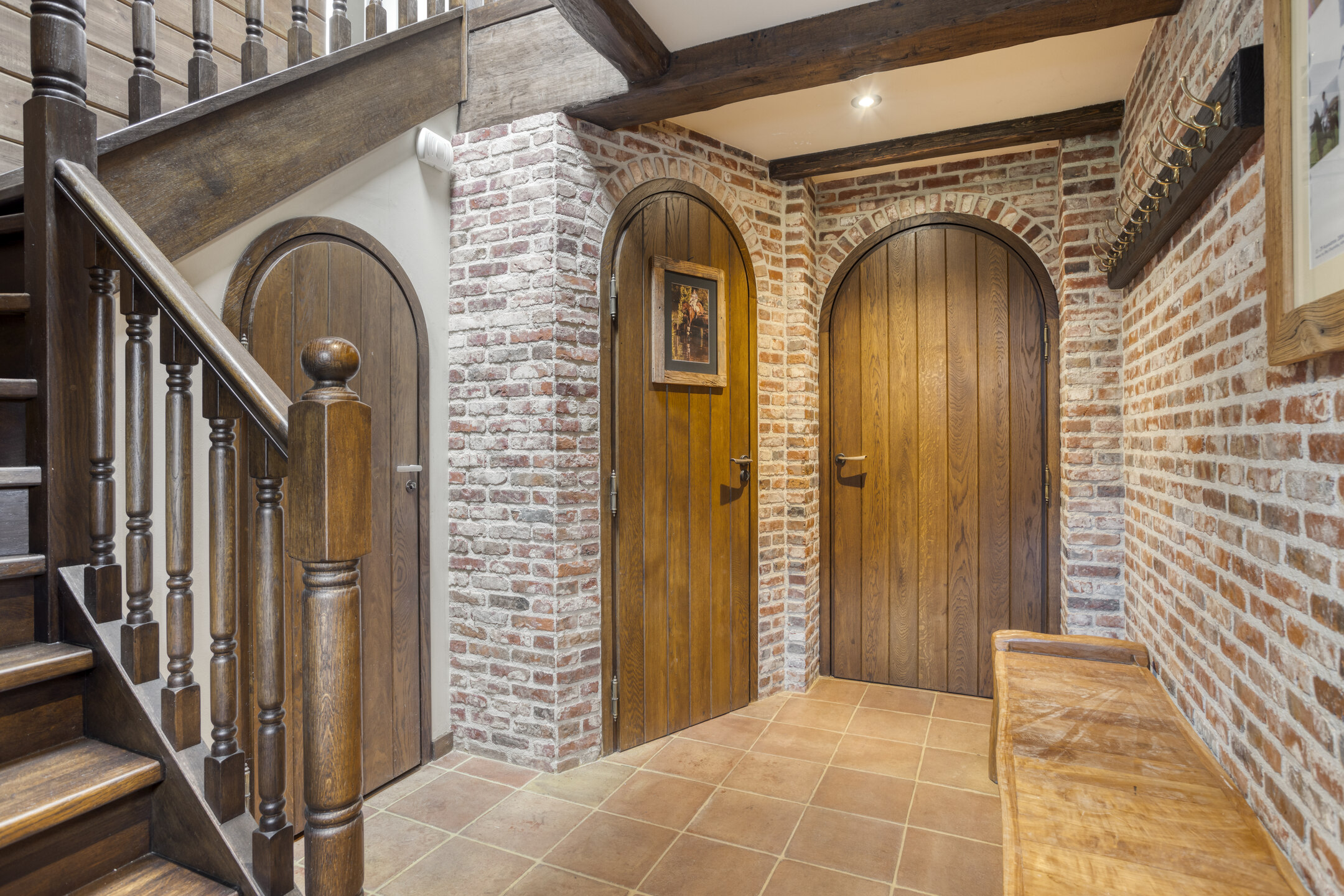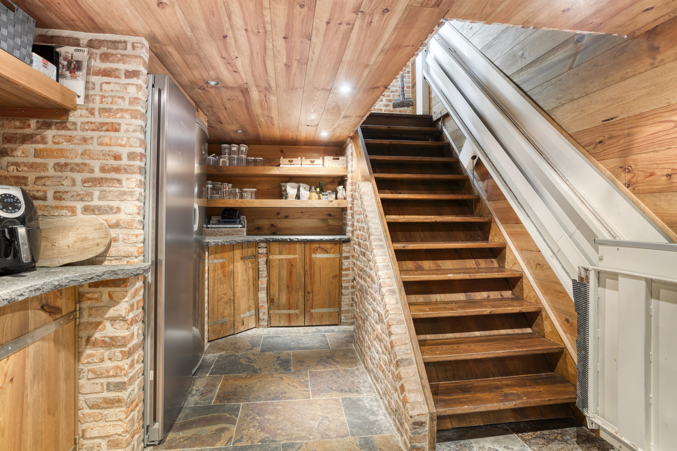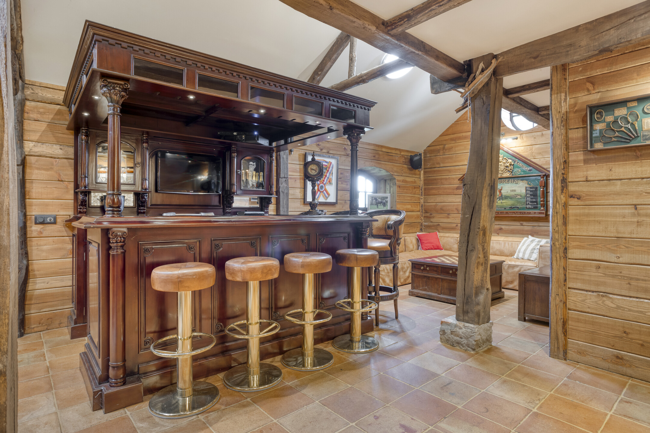 The former garage has been completely renovated and fitted with a thatched roof. Part of this “clapboard” annex is used as a storage room. It is accessible via a door near the carport. The ground floor also has a large relaxation room. The hall has natural stone floor tiles, a large cupboard containing the meter cupboard, the toilet and a beautiful hardwood staircase to the first floor. The relaxation room is also accessible from the hall. Toilet with natural stone floor tiles, free-hanging toilet, urinal and a designer cabinet with washbasin. Large, attractive relaxation room with natural stone floor tiles, beamed ceiling with recessed spotlights and a glass window looking through to the fitness room/gym above. This relaxation room has a large stylish bar with a drinks cabinet, a cosy sitting area and a built-in sound system. This space is currently partly used as a “billiard room”. The access door to the storage room is located near the carport. The storage room offers plenty of space and is equipped with a built-in cupboard wall. The storage room also houses the underfloor heating system and the connections for the central heating and irrigation systems.