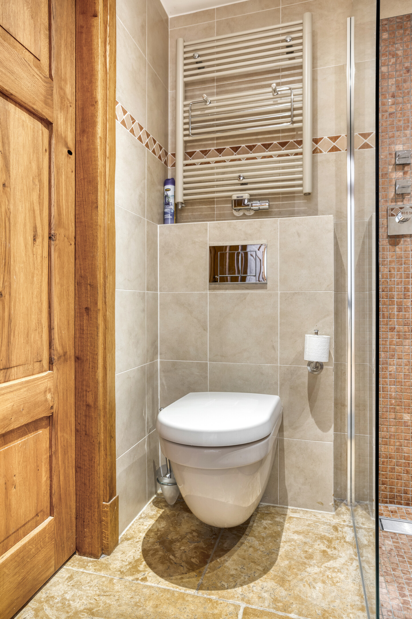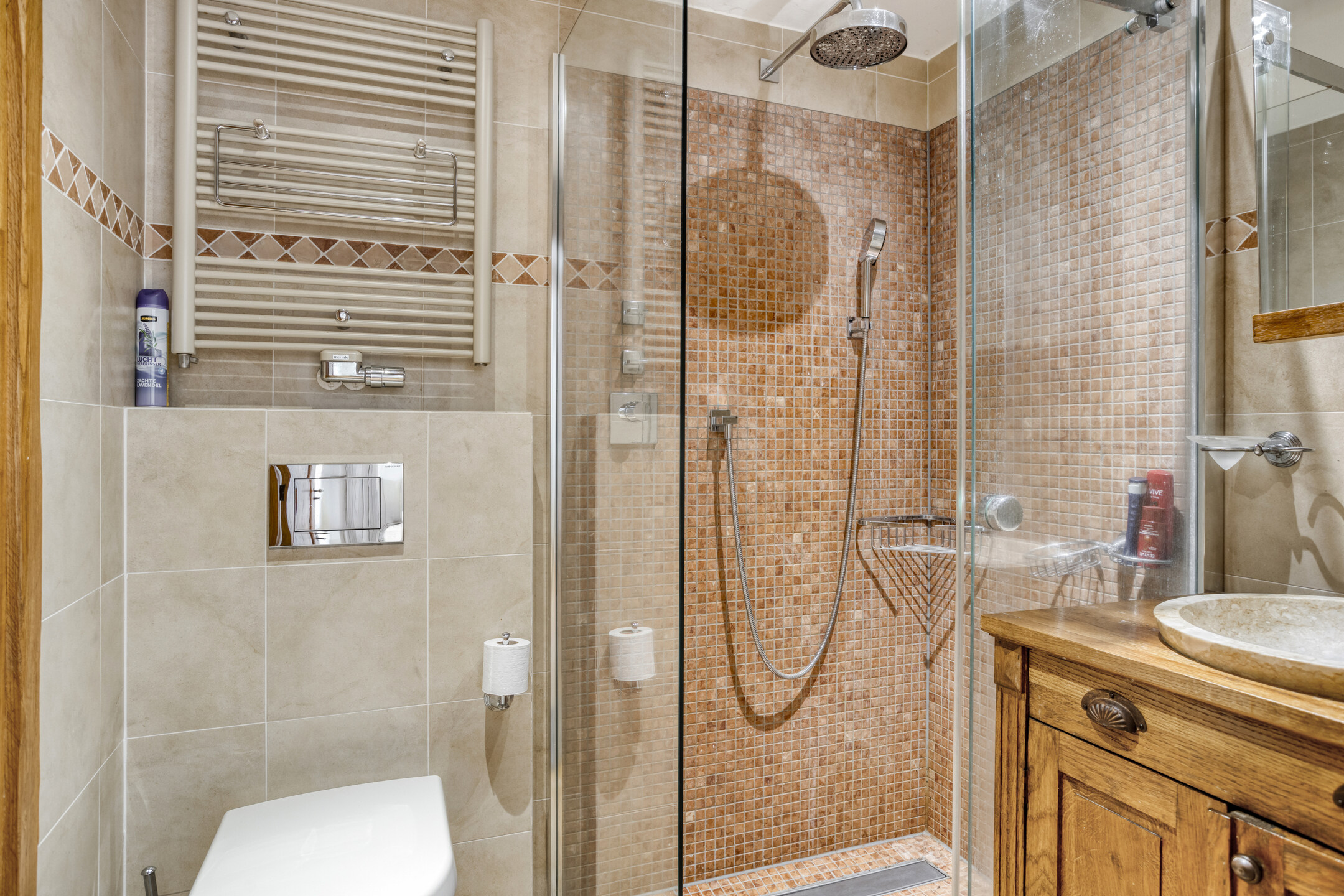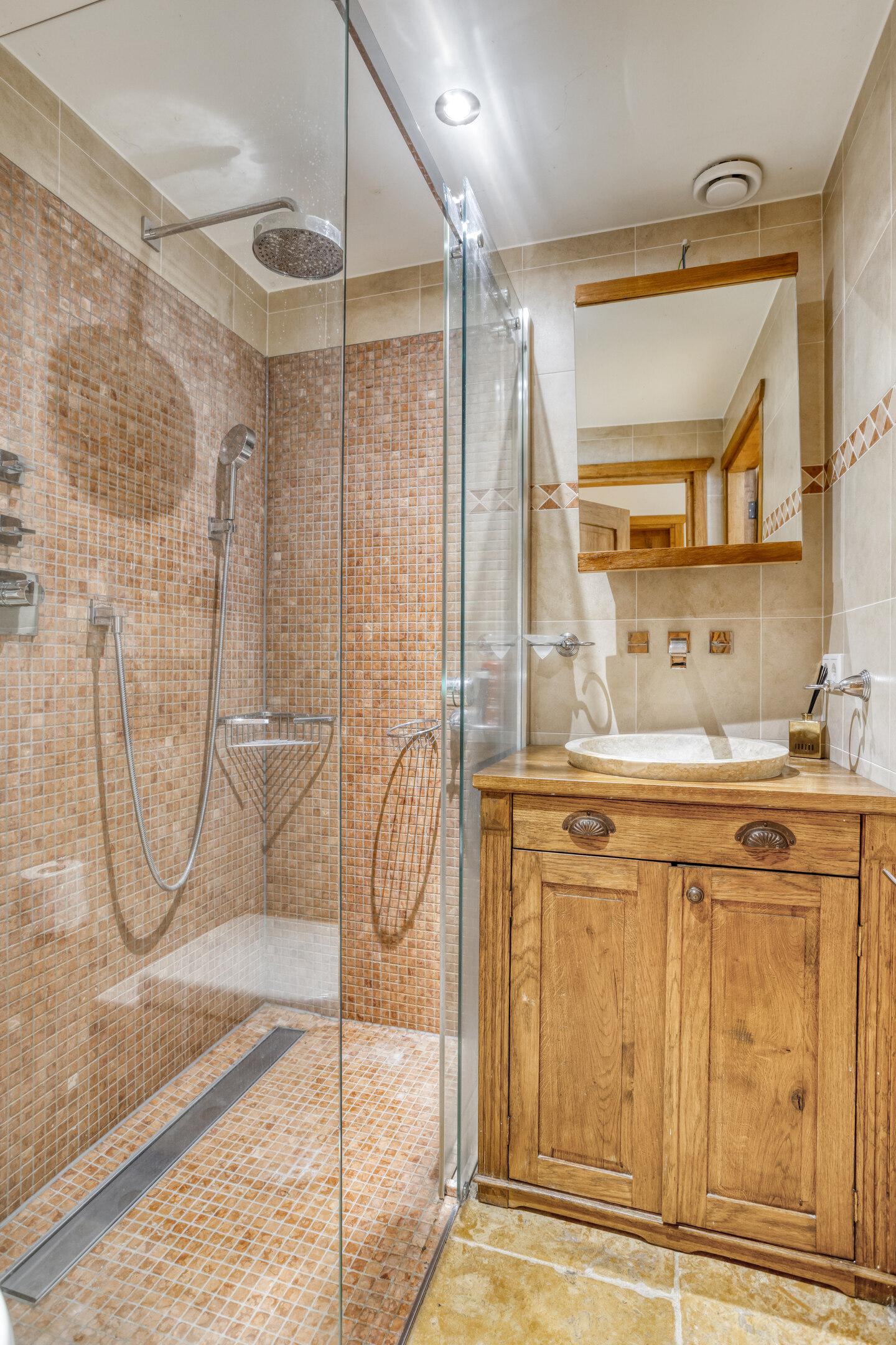 Spacious bathroom 1 with natural stone floor and wall tiles, beamed ceiling with recessed spotlights, shower cubicle and double washbasin in cabinet.