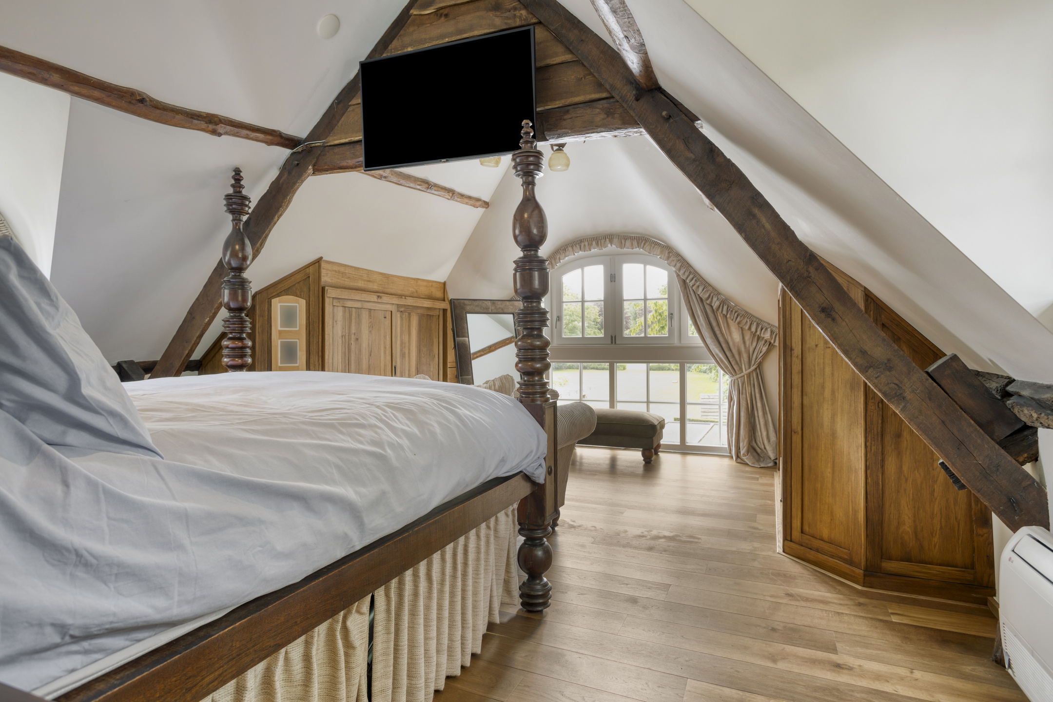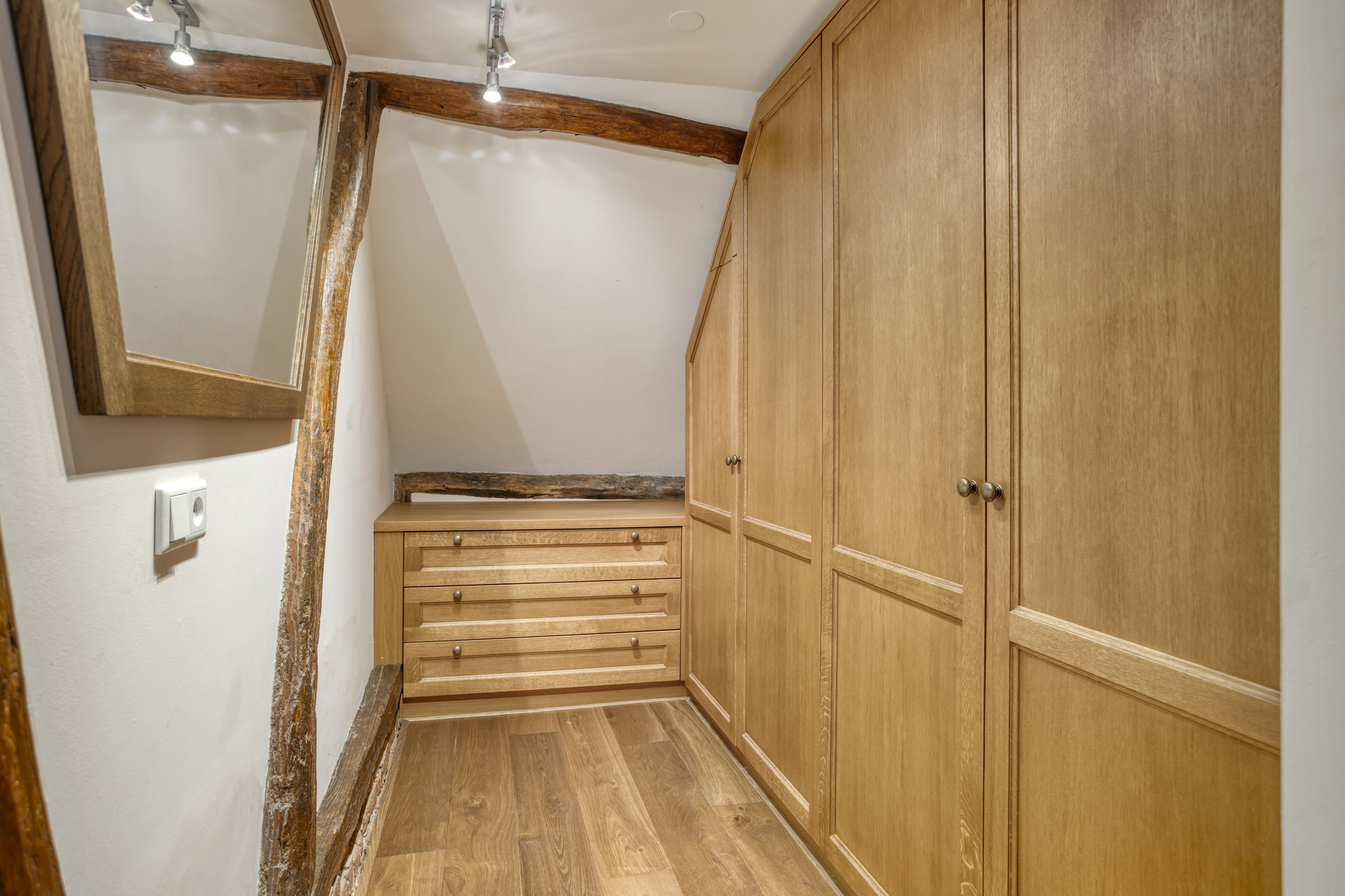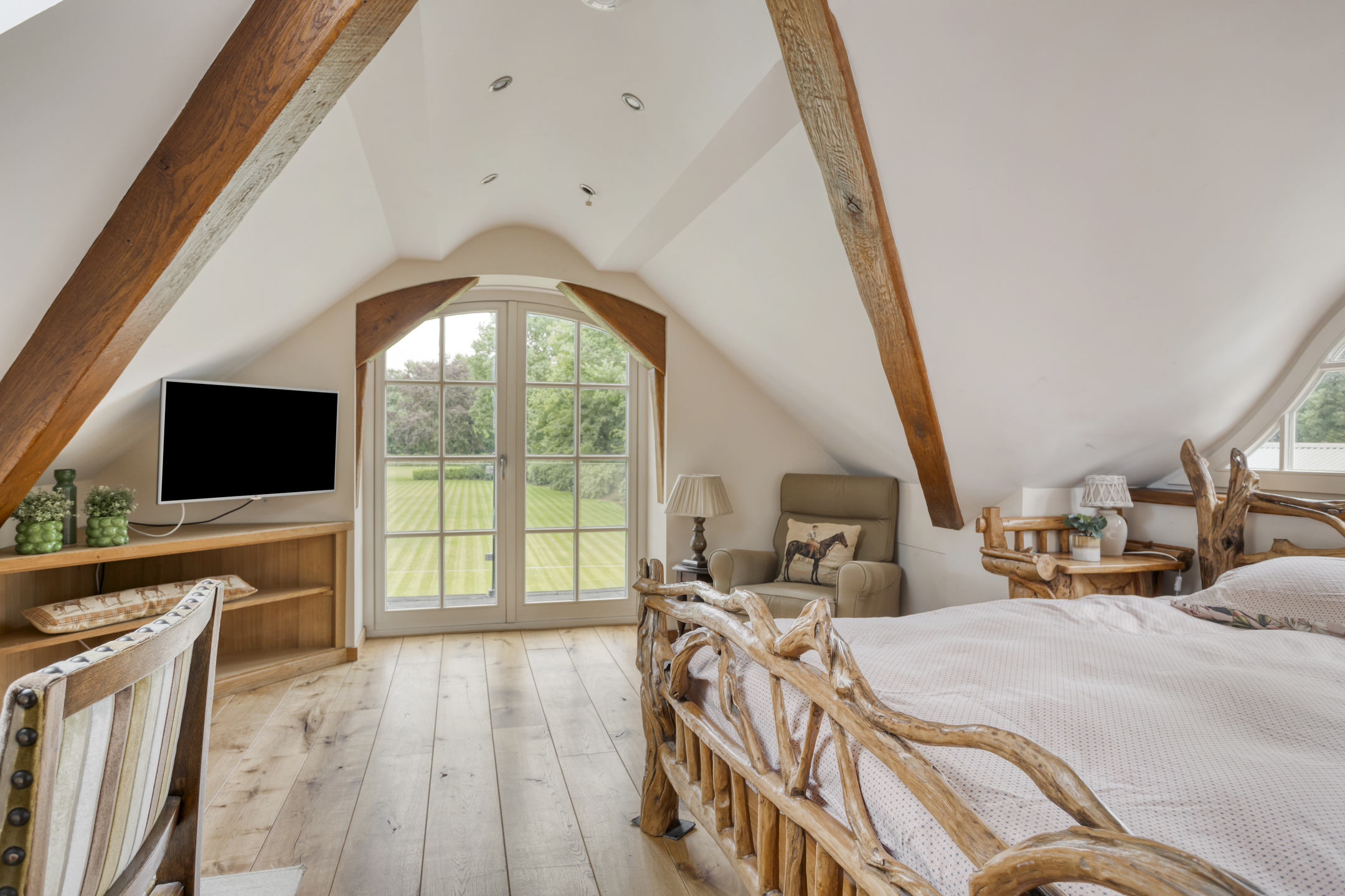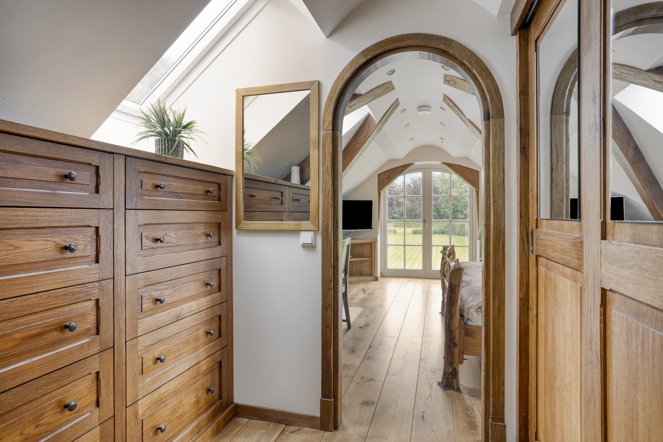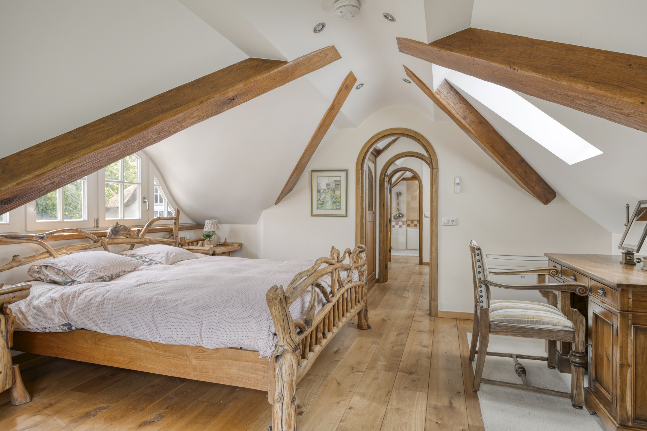 Spacious landing with wooden flooring and dormer window. Both bedrooms and the bathroom are accessible from the landing. The spacious bedroom 3 has wooden flooring, a ceiling with a characteristic beam construction, a dormer window and access to the loft. The large loft offers a beautiful view of the stylish living room.