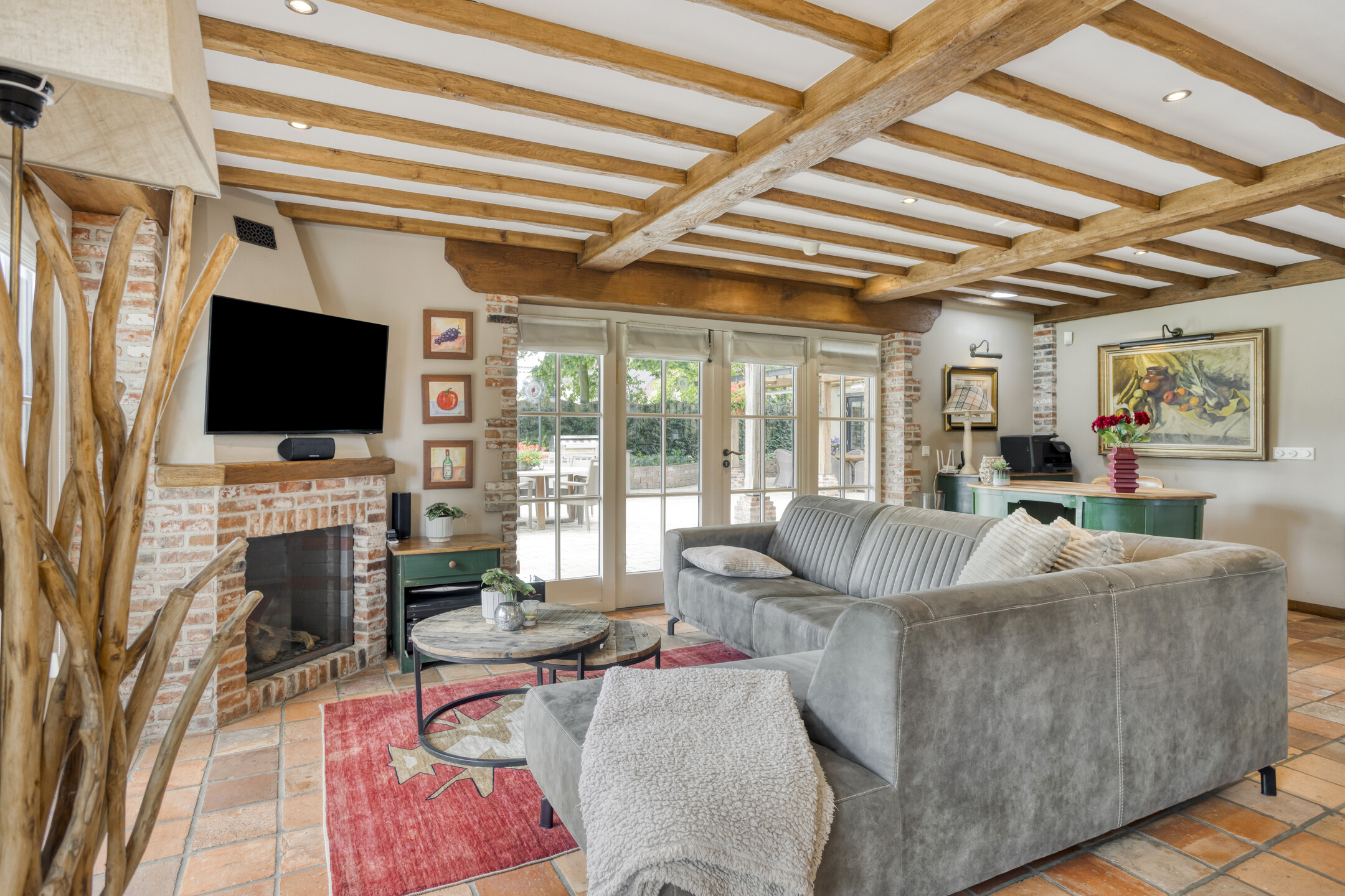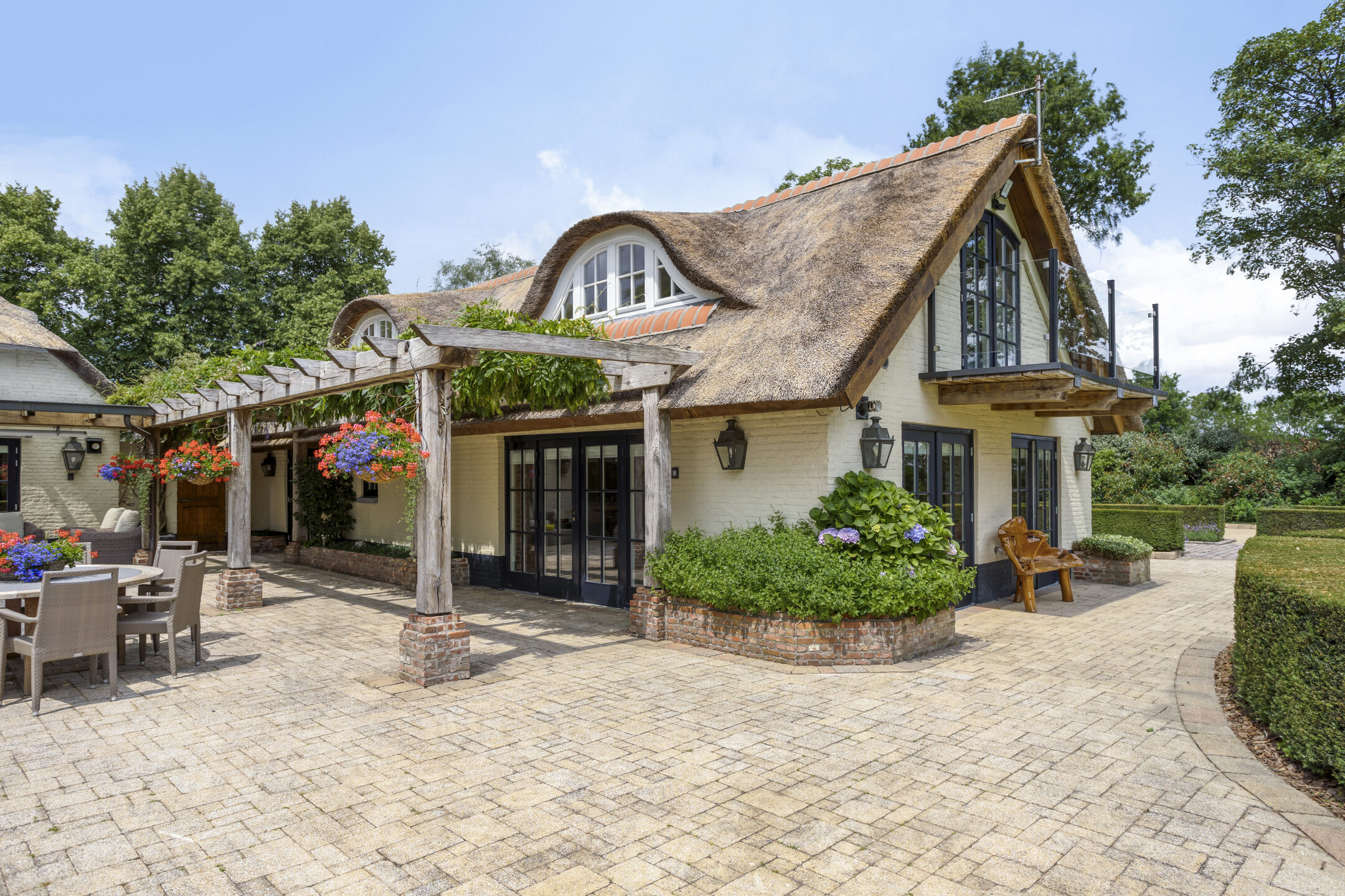 The beautifully landscaped, very spacious garden faces east and has several large sun terraces. The terraces are situated in such a way that both the farmhouse and the guest house can count on sufficient privacy and offer a beautiful view of the park-like back garden. The terrace adjacent to the farmhouse has a large glass canopy and a beautiful pergola.