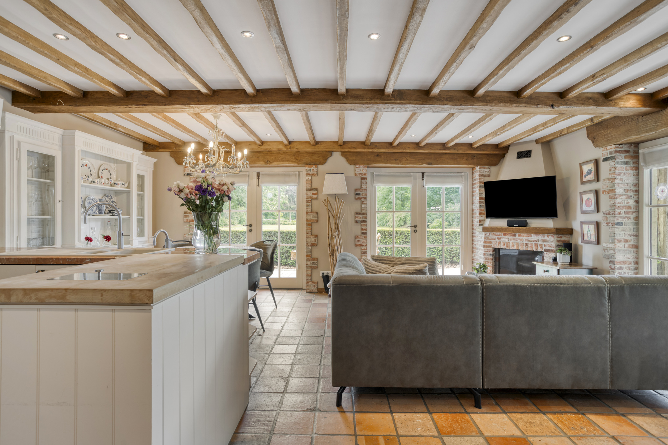 Toilet with marble floor and wall tiles, free-hanging toilet and washbasin. Spacious, attractive living/dining room with natural stone floor tiles, characteristic beamed ceiling with recessed spotlights, open kitchen, fireplace (gas) and three double French doors to the terraces. The large open kitchen has a U-shaped kitchen layout. The kitchen is equipped with a marble worktop with one and a half sinks, dishwasher, refrigerator, freezer with ice cube function, coffee machine, combi-oven/microwave, gas stove (Boretti) with grill plate and extractor hood, crockery cupboard and various other cupboards and drawers. The spacious bedroom 1 has wooden flooring, a characteristic beamed ceiling with recessed spotlights, a large built-in wardrobe, a door to bathroom 1 and double French doors to the terrace.