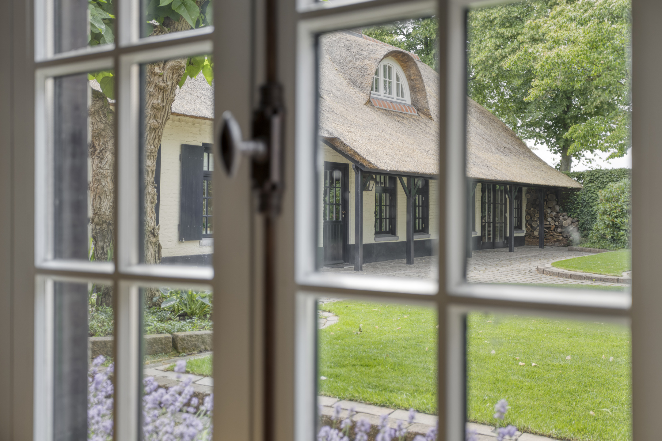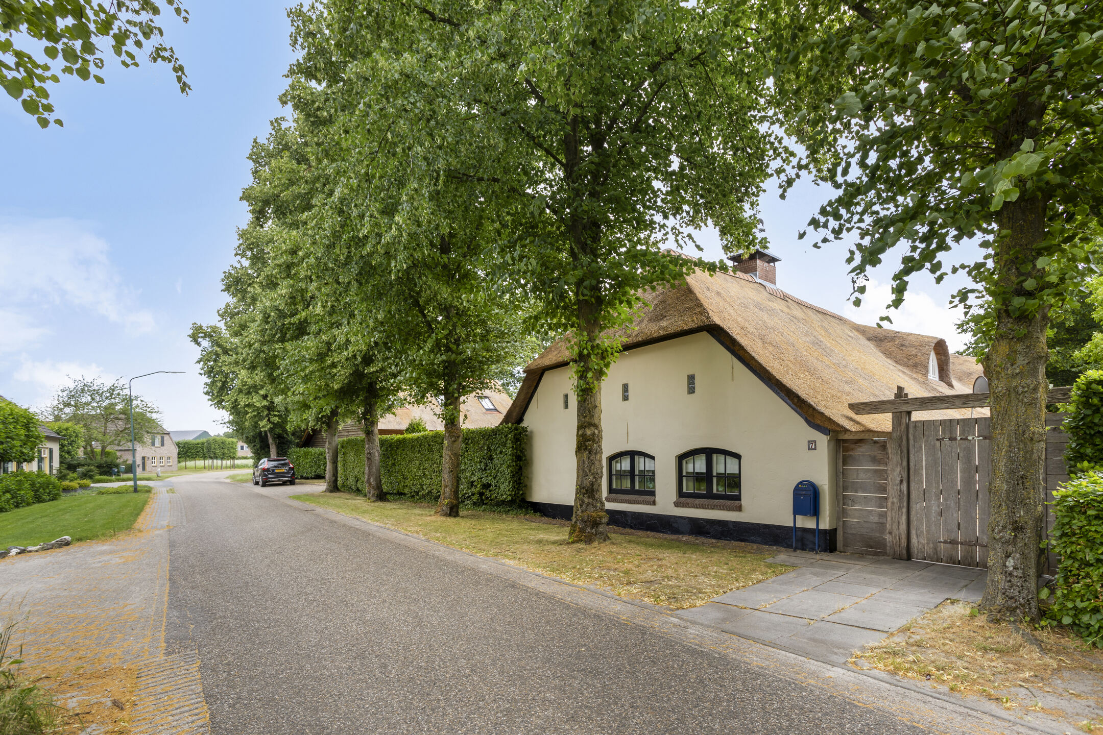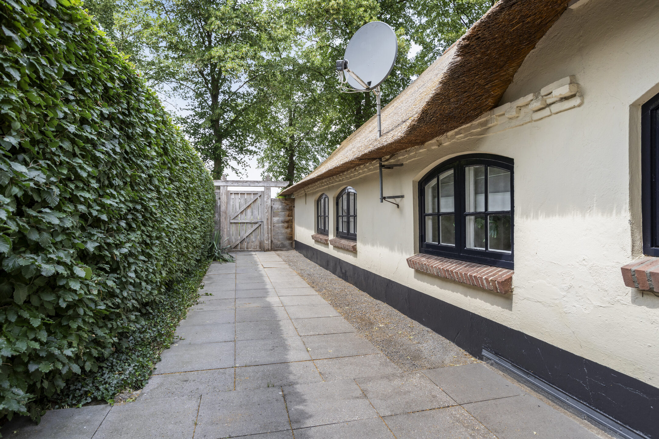 The farmhouse, guest house and outbuilding are located on a courtyard on a very spacious plot of approximately 6,755 m². The courtyard is accessible via a large electric gate with French doors and via a gate on the side of the farmhouse. The spacious courtyard has decorative paving, a large lawn and various mature plants. All buildings are equipped with outdoor lighting.