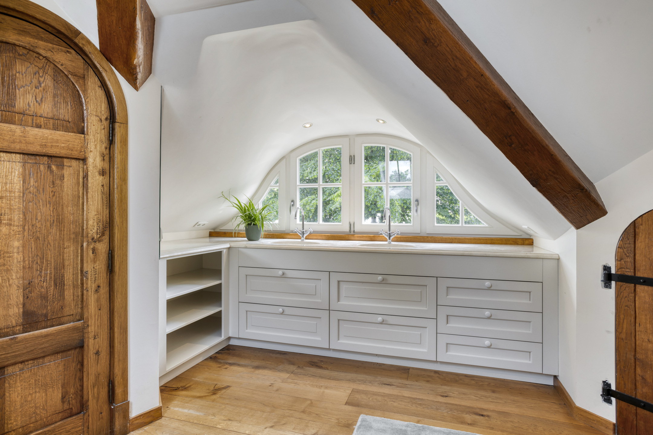 Spacious landing with wooden floor and skylight. Bathroom 2 and the hall to bedroom 2 are accessible from the landing. This hall has two large built-in cupboards. The spacious bedroom 2 has wooden flooring, a ceiling with characteristic beams and recessed spotlights, a skylight and a dormer window. French doors from this bedroom open onto a large balcony offering beautiful views of the park-like garden. The spacious bathroom 2 has wooden flooring, wall tiles, a ceiling with characteristic beams and recessed spotlights, a skylight and a dormer window. The bathroom also has a large bathroom cabinet with marble top and double sink, decorative radiator, wall-mounted toilet and bathtub with shower function. The room housing the central heating combi boiler is accessible from the bathroom.