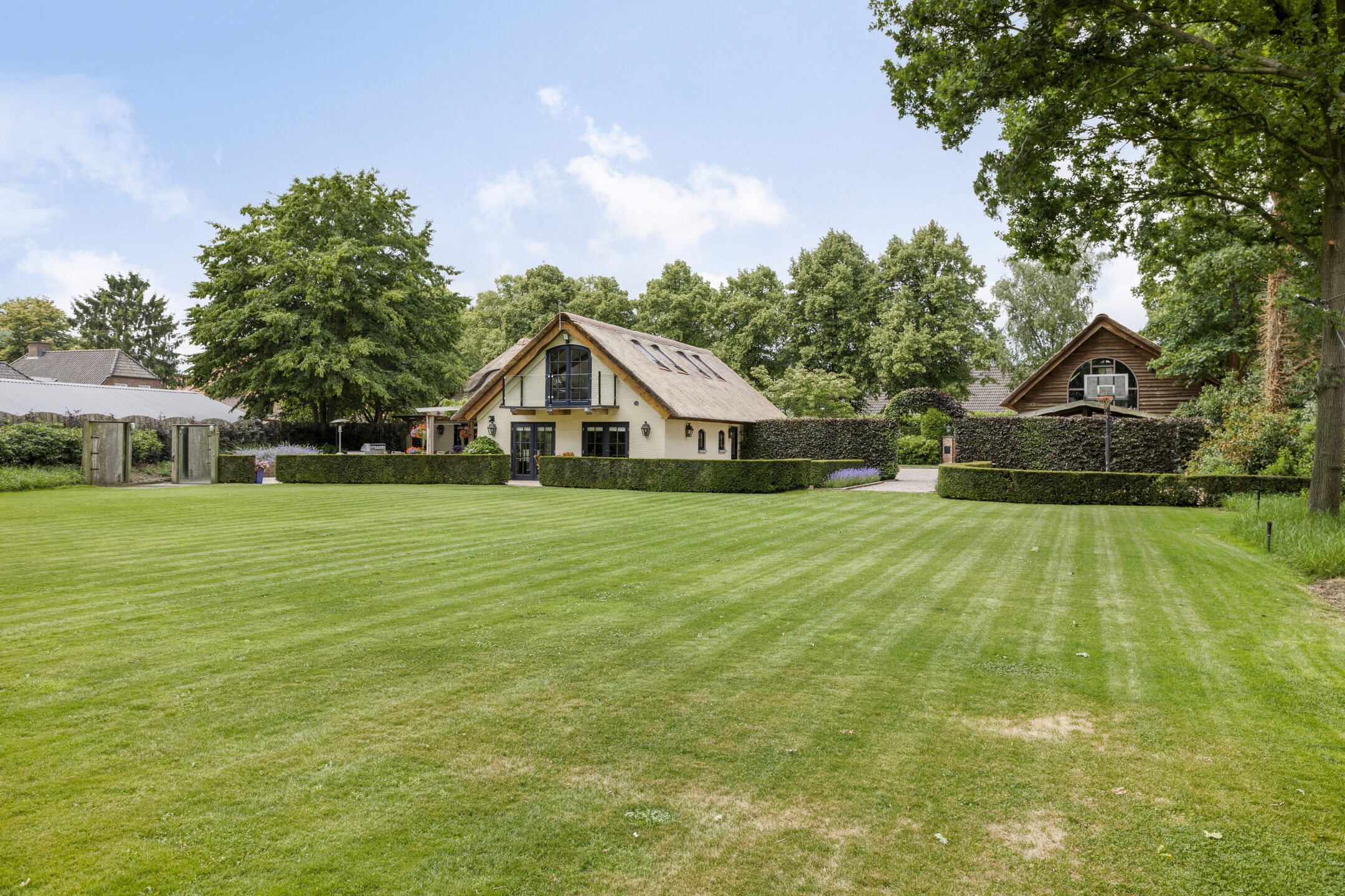 In a quiet street on the outskirts of Riethoven, on a magnificent plot of 6,755 m², lies this beautiful old-style renovated farmhouse with a thatched roof. The property has been tastefully renovated and features a large, detached guest house, a spacious outbuilding with a relaxation room and fitness room/gym, a spacious carport for several cars and a beautifully landscaped park-like garden facing west.