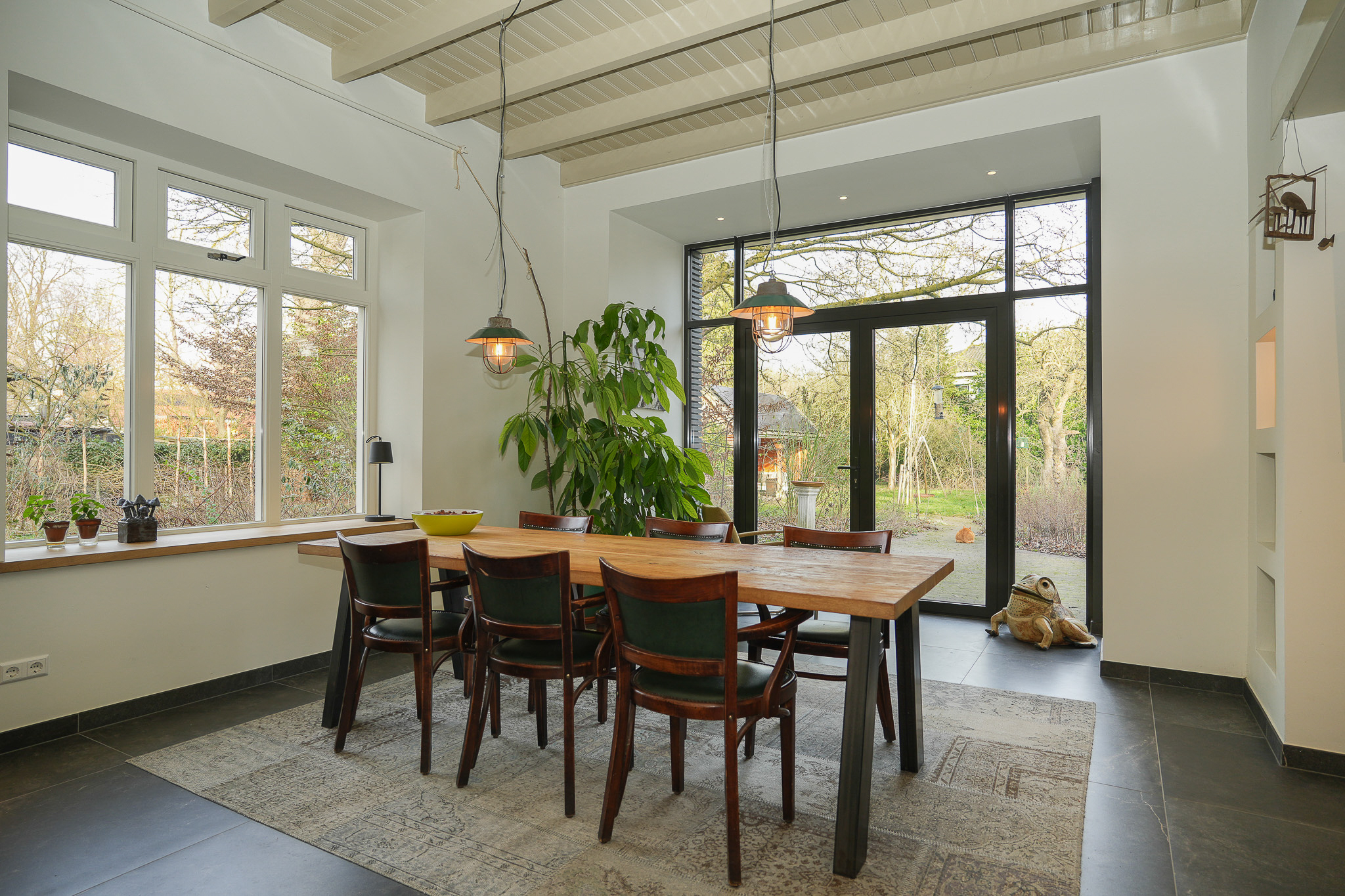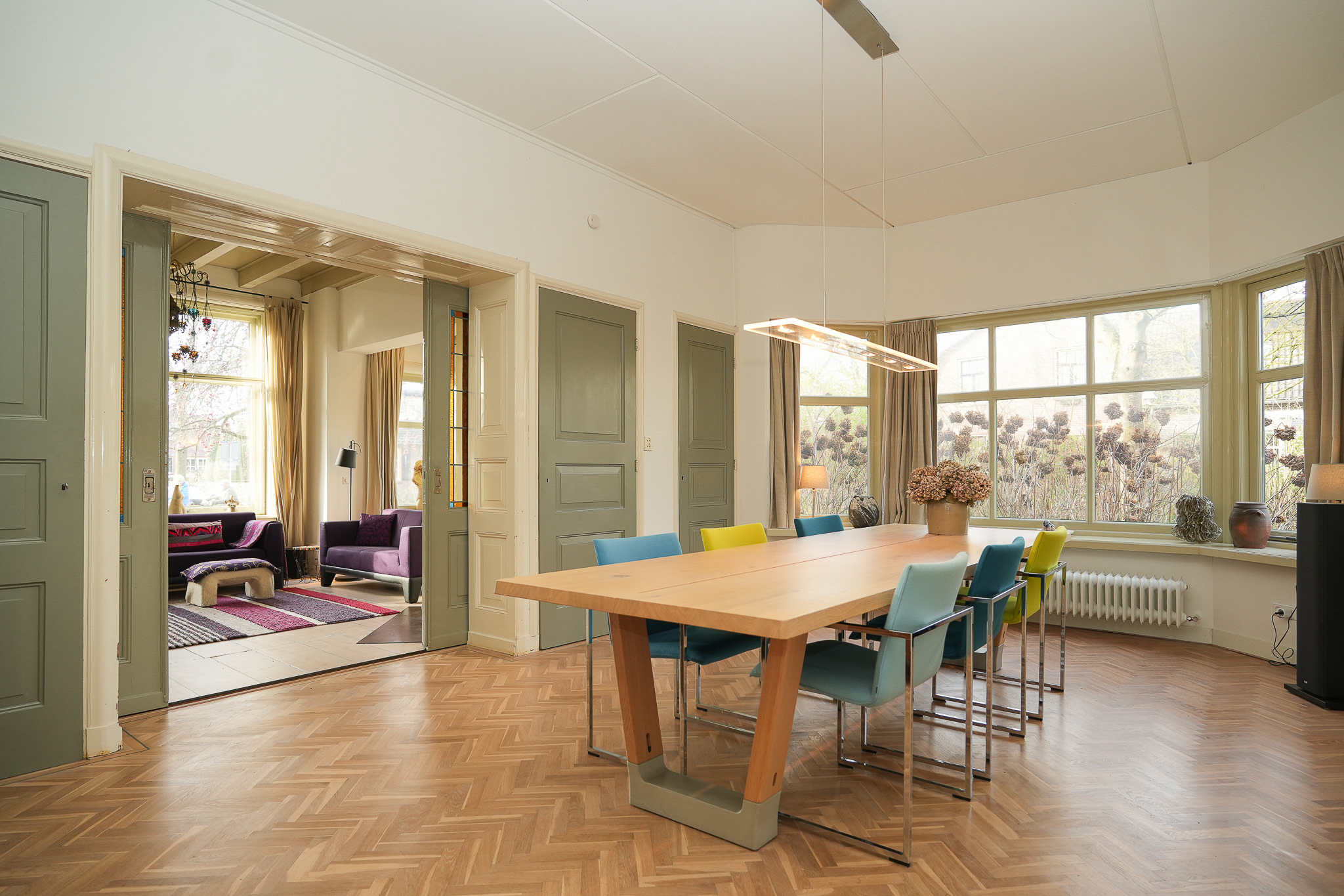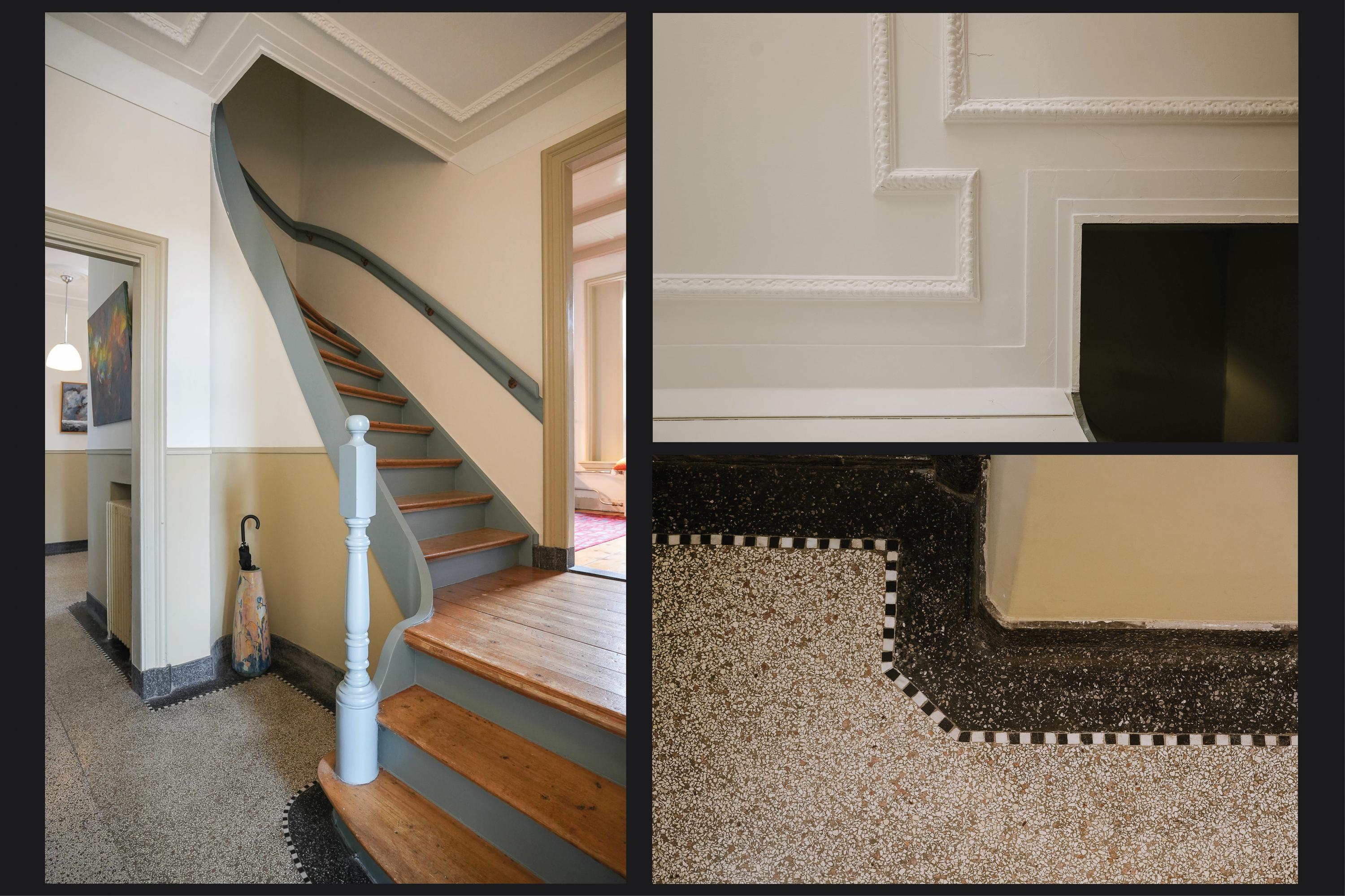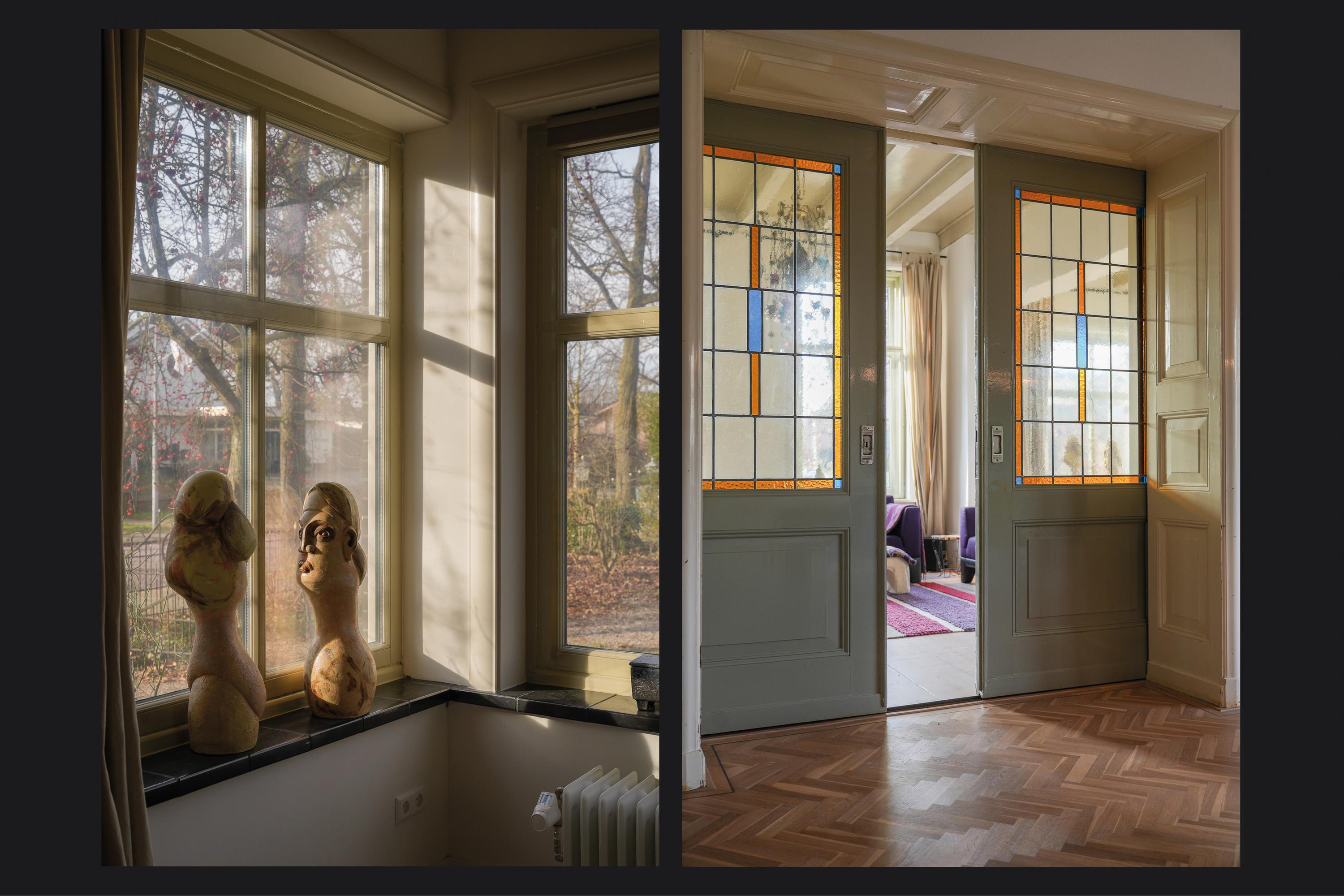 Villa Rossum combines the grace of its 1897 origins with contemporary allure, set within a 2,150 m² nature garden populated with fruit trees and edible plantings. This villa Rossum, designated a municipal monument, offers 277 m² of living area framed by original architectural details, including sliding stained glass doors, high ceilings, a broad main staircase, and crafted cabinetry. Light flows through bay windows to spaces anchored by parquet floors and a wood-burning stove, while a bespoke kitchen connects seamlessly to the garden—a design realized in 2021 to enhance indoor-outdoor living. Throughout the property, authentic features are preserved, balanced with energy-efficiency, resulting in energy class B.