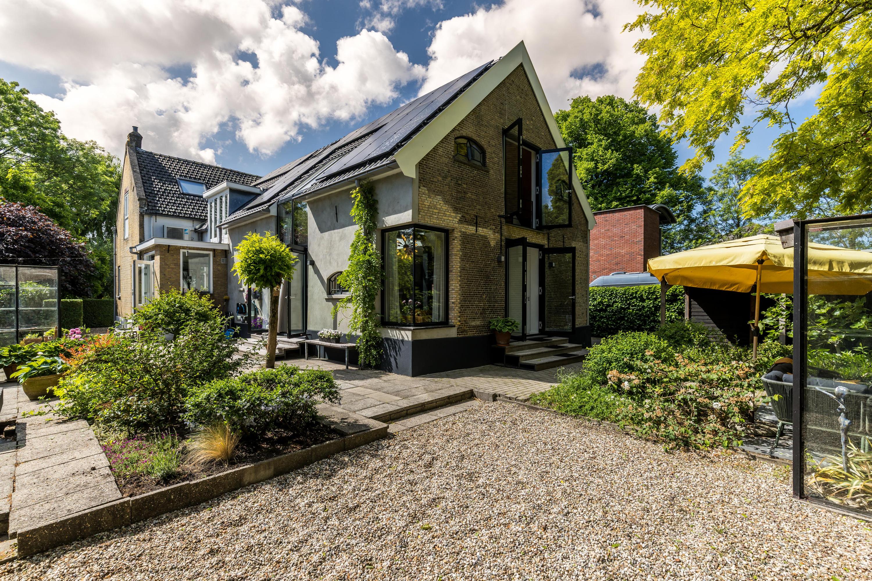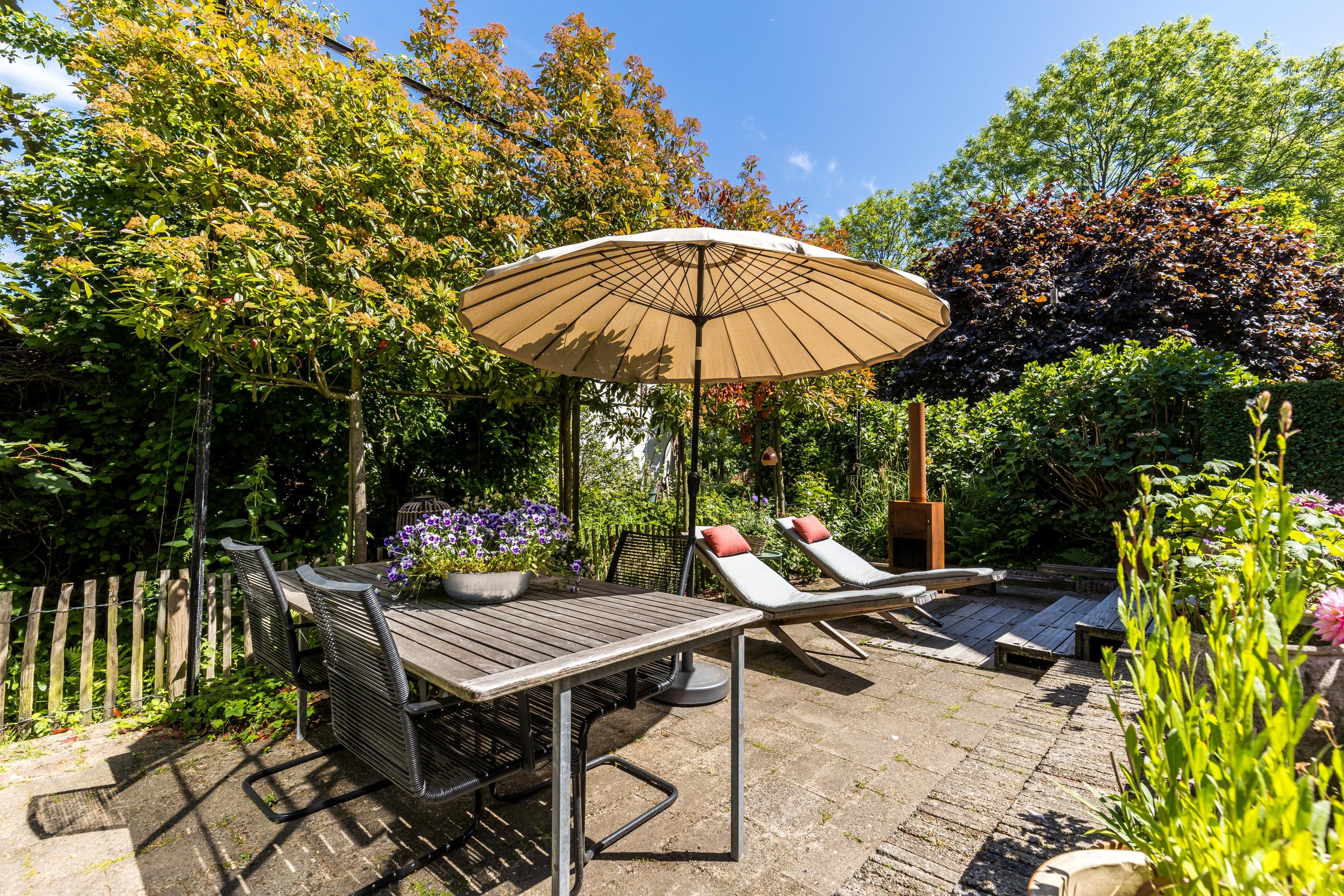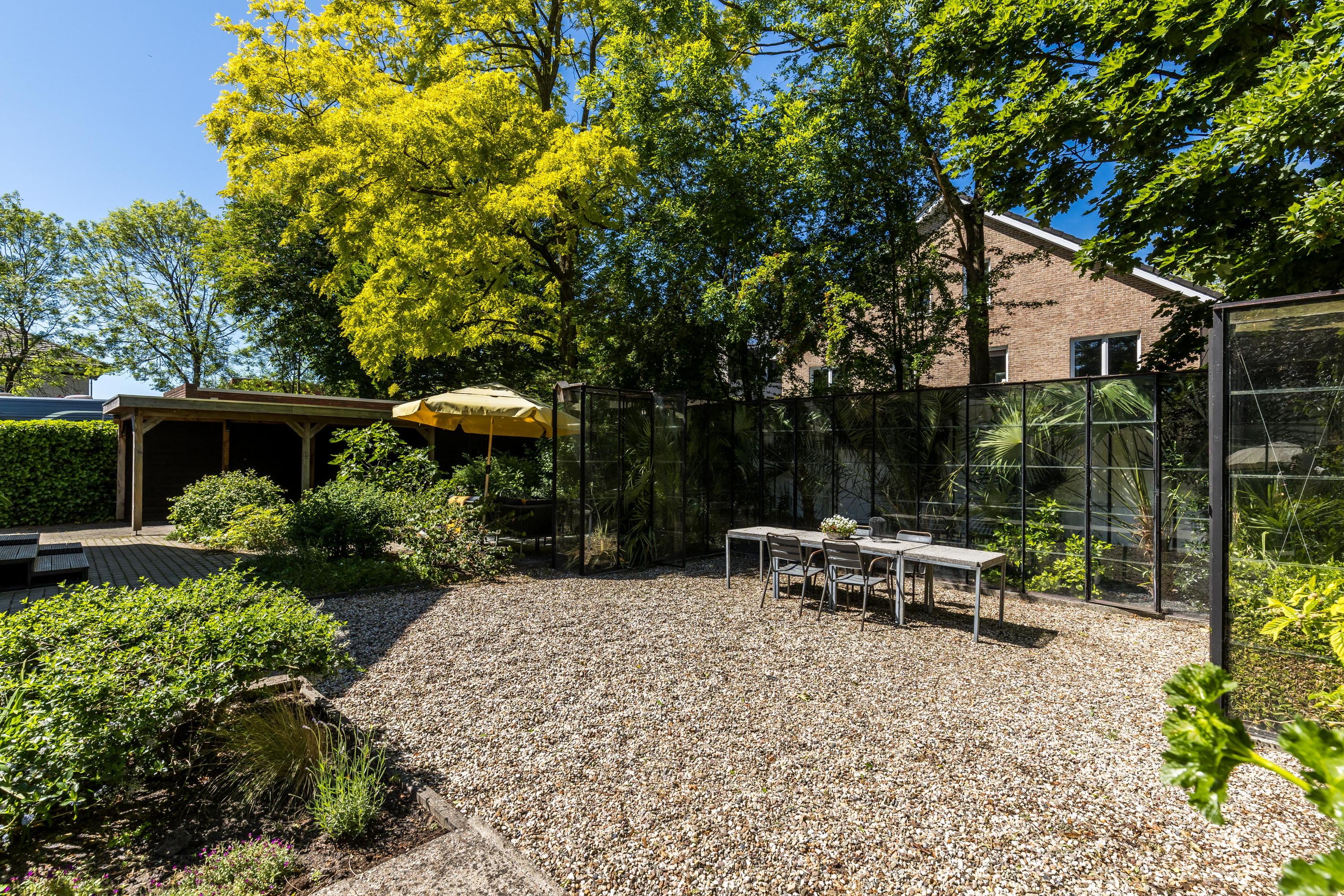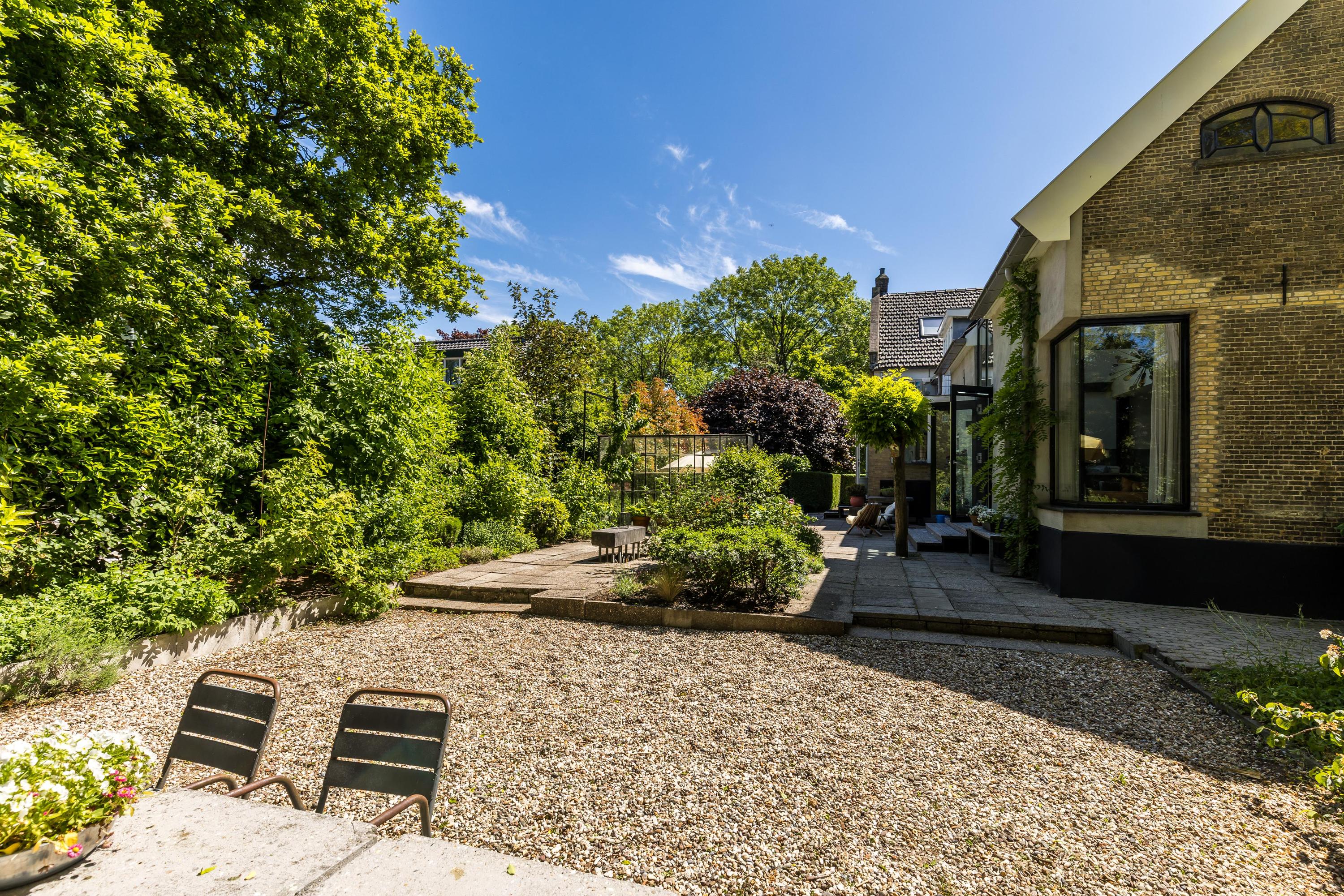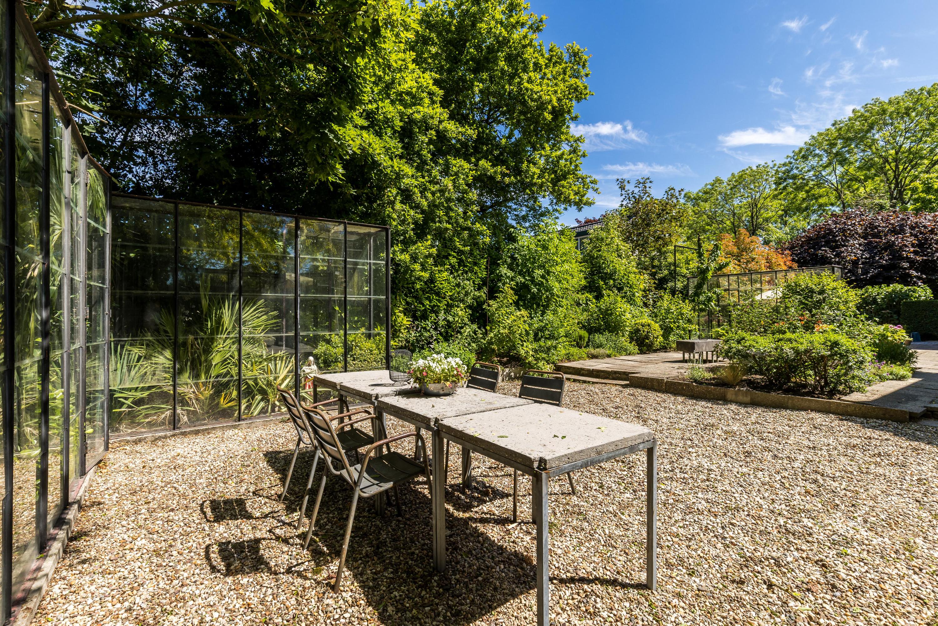The front garden is beautifully landscaped with hedges, gravel paths and various plants. A side garden with driveway offers on-site parking, a carport with a charging station and a large storage room. The other side garden and the backyard together form a beautiful main garden area. At the back of the garden is a food forest with fruit trees, herbs and soft fruit. This garden has been landscaped under architecture and offers a lot of privacy and various sunny seating areas.