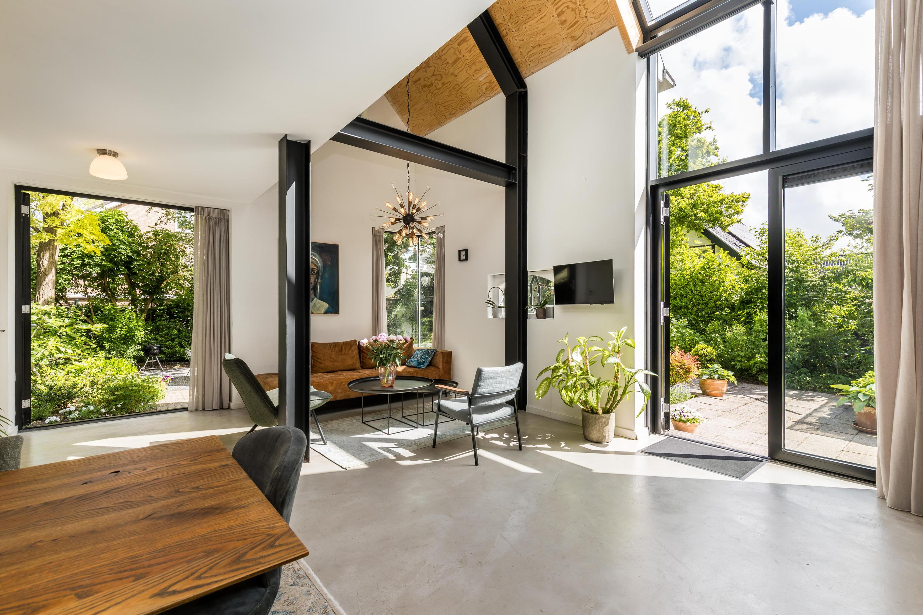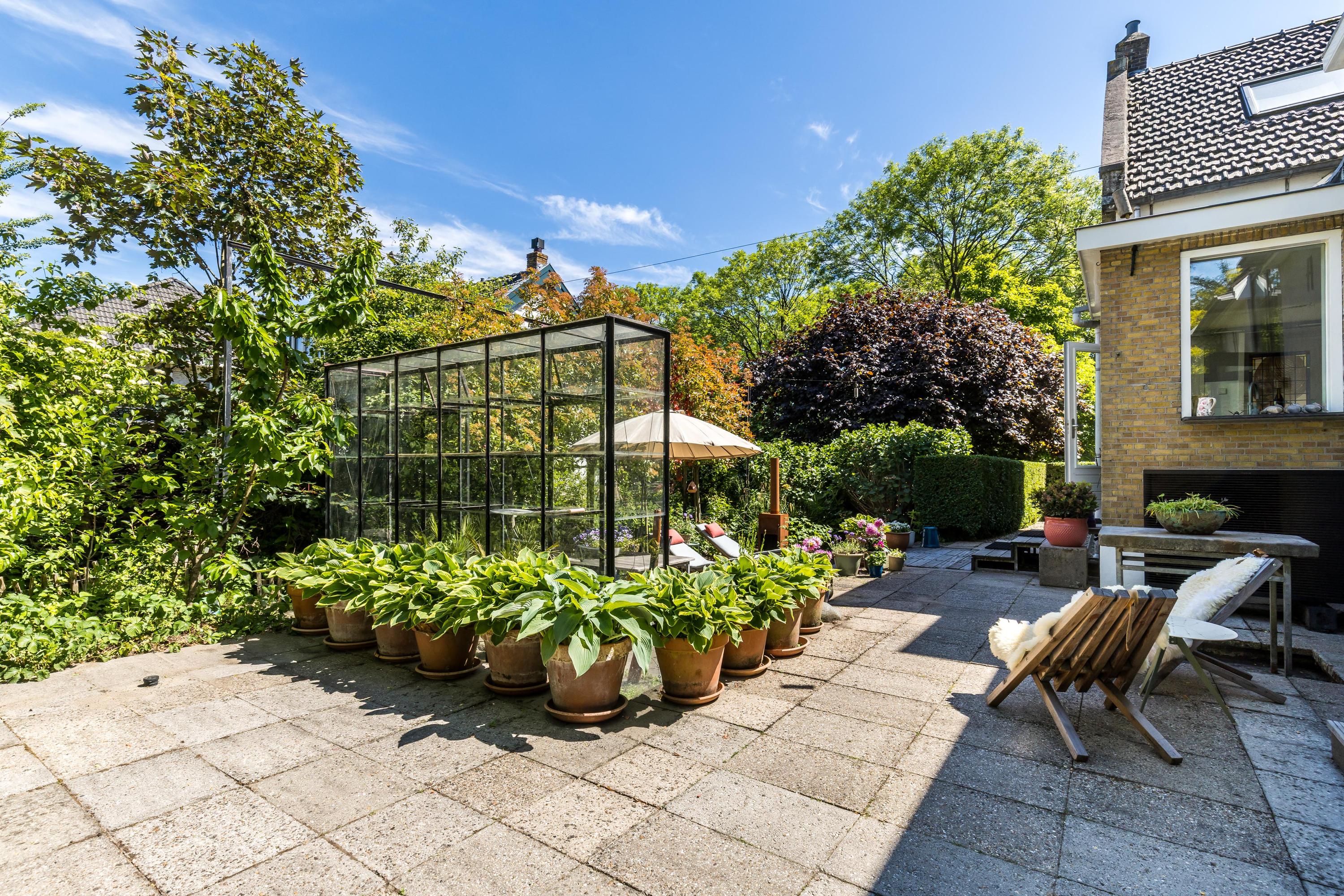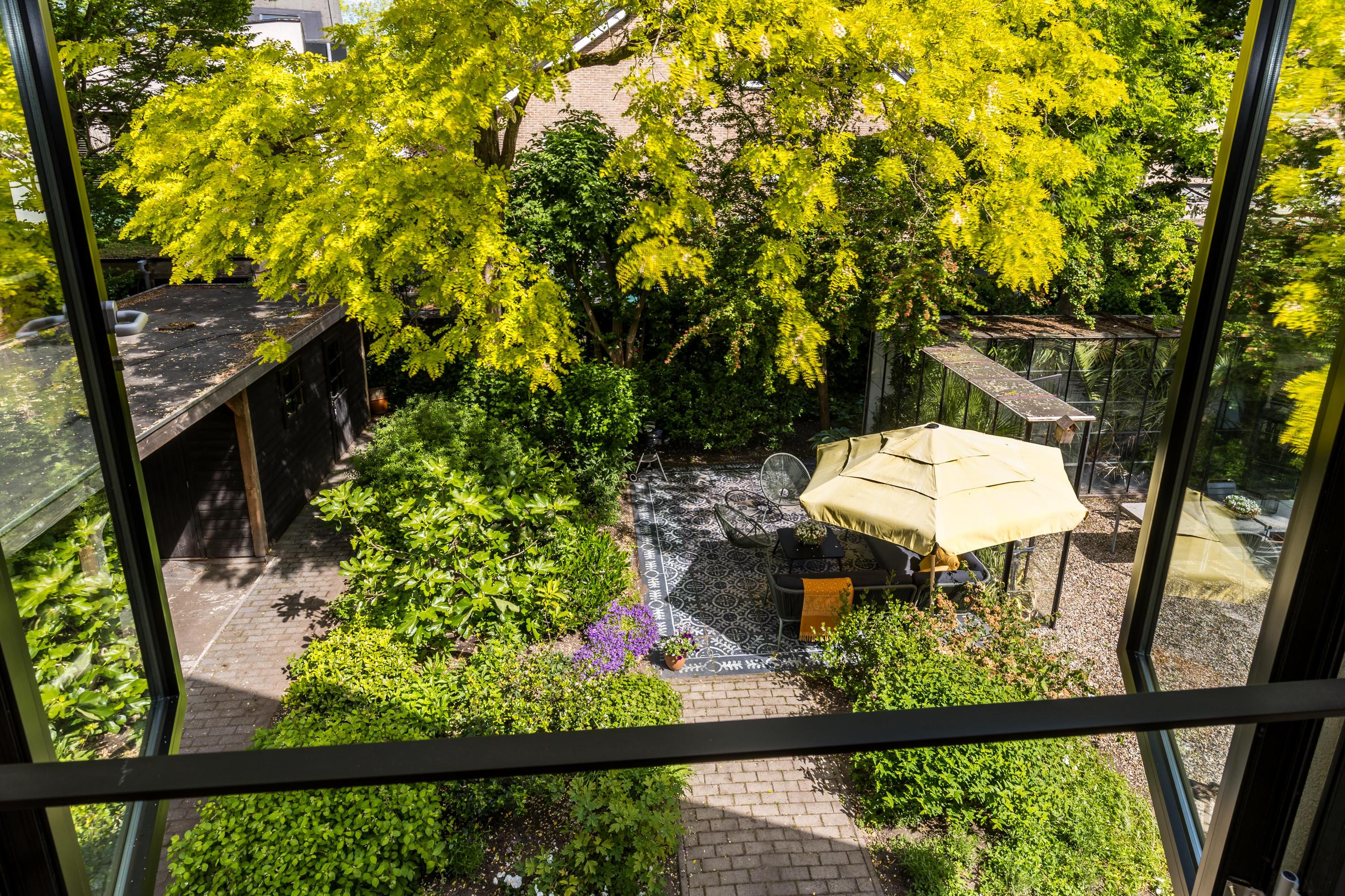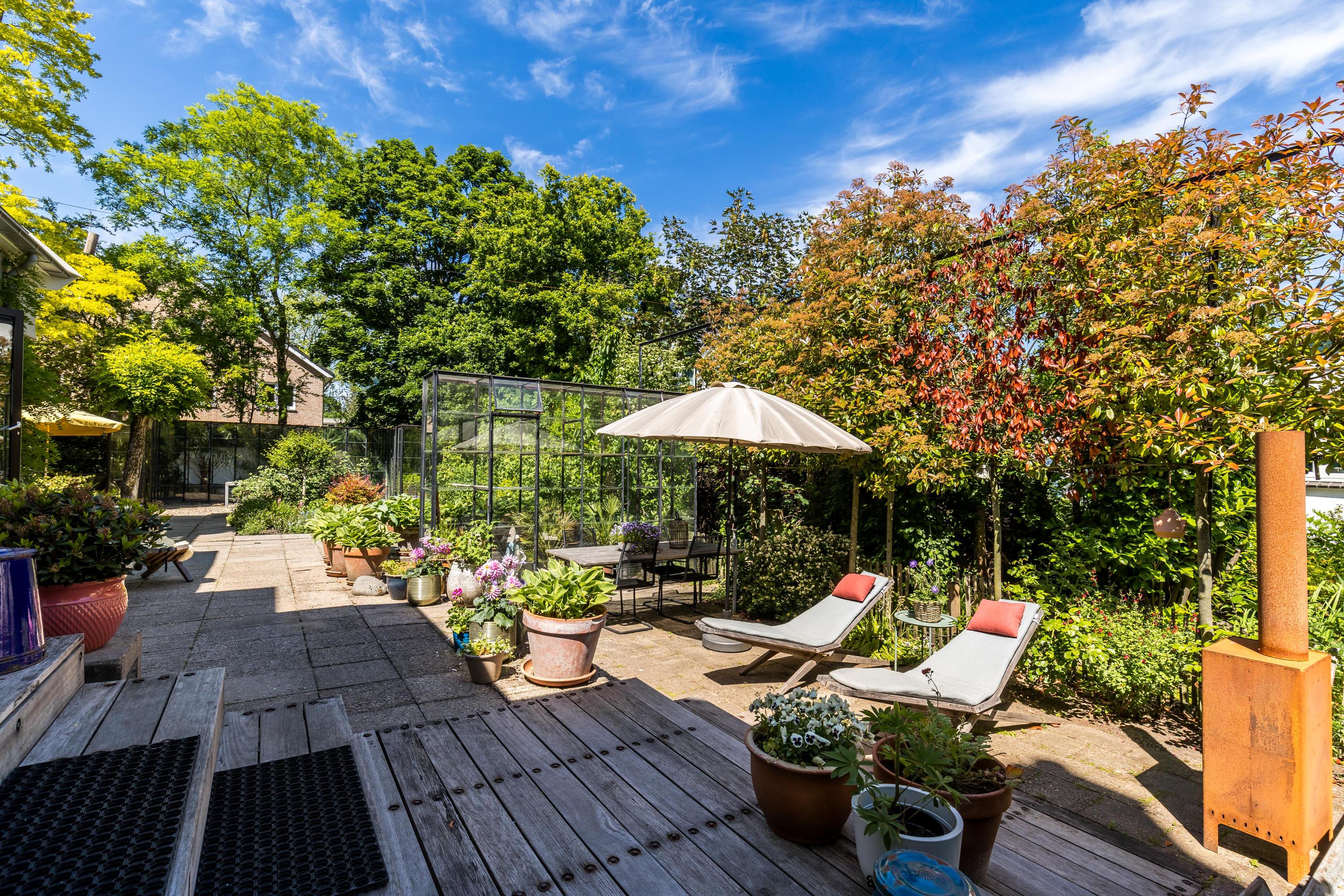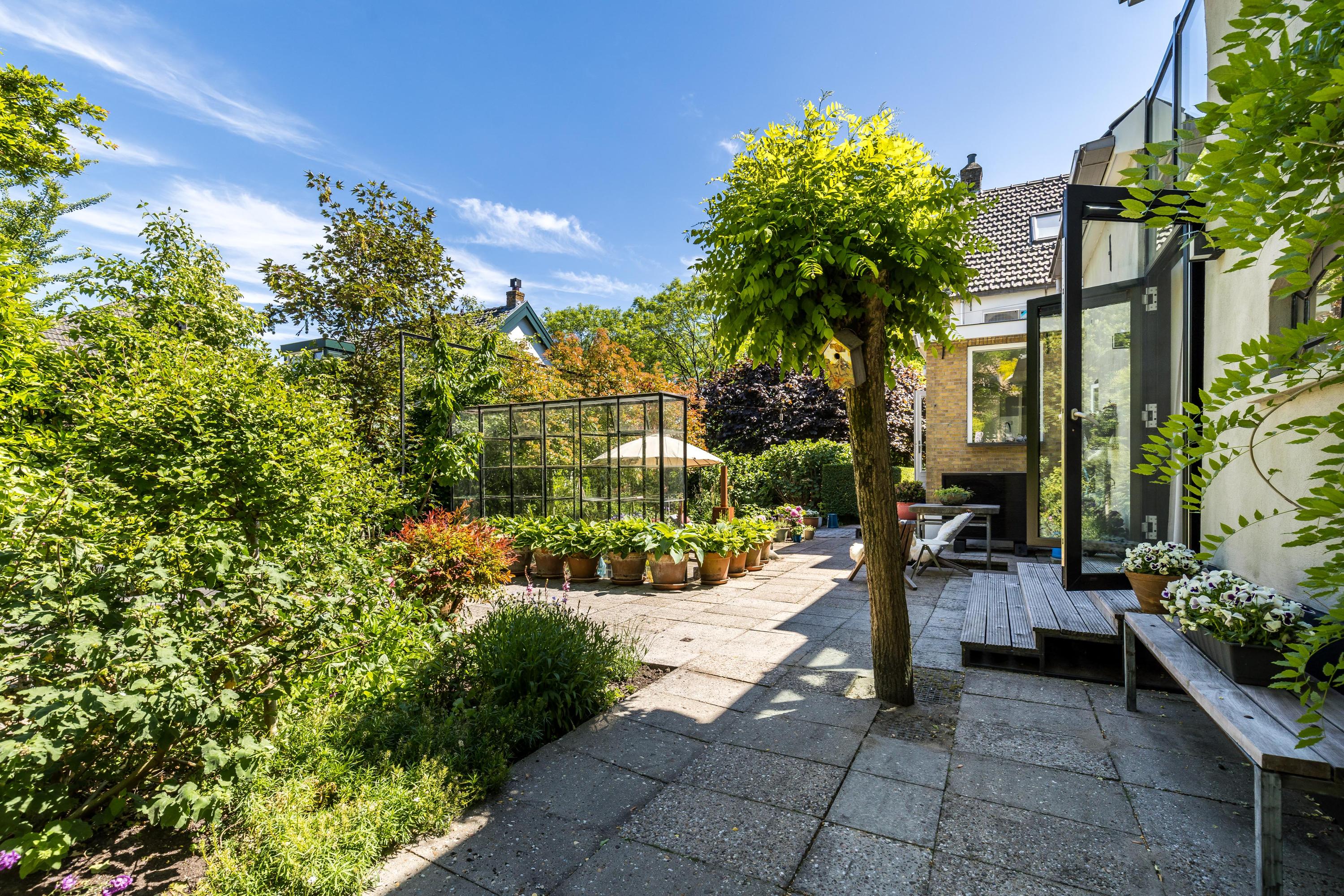 The front garden is beautifully landscaped with hedges, gravel paths and various plants. A side garden with driveway offers on-site parking, a carport with a charging station and a large storage room. The other side garden and the backyard together form a beautiful main garden area. At the back of the garden is a food forest with fruit trees, herbs and soft fruit. This garden has been landscaped under architecture and offers a lot of privacy and various sunny seating areas.